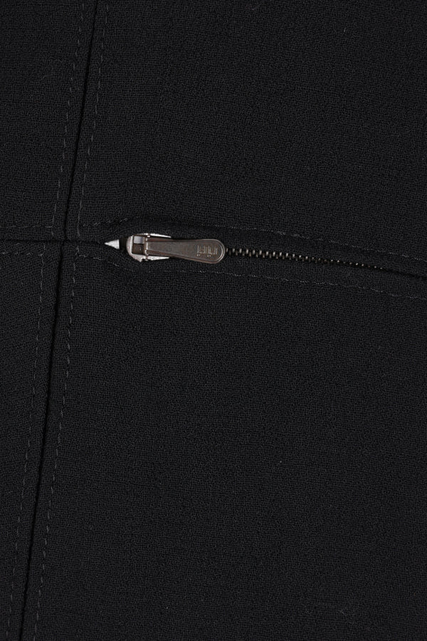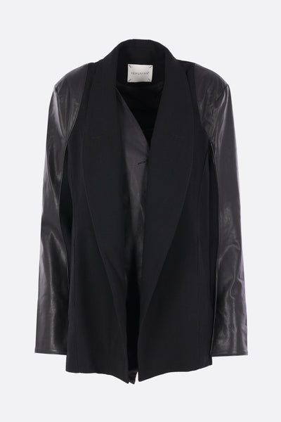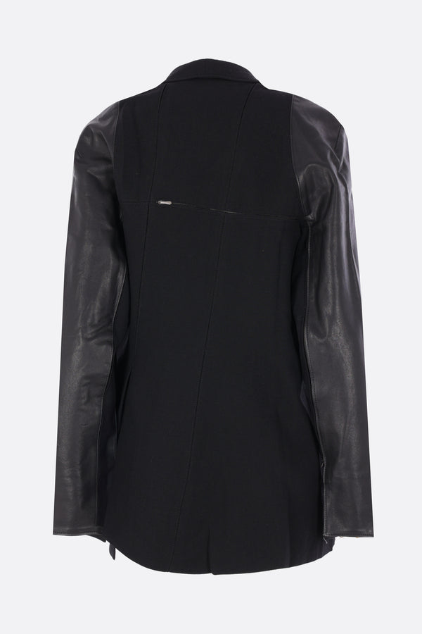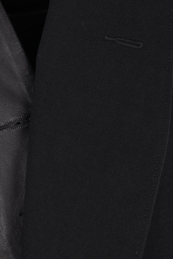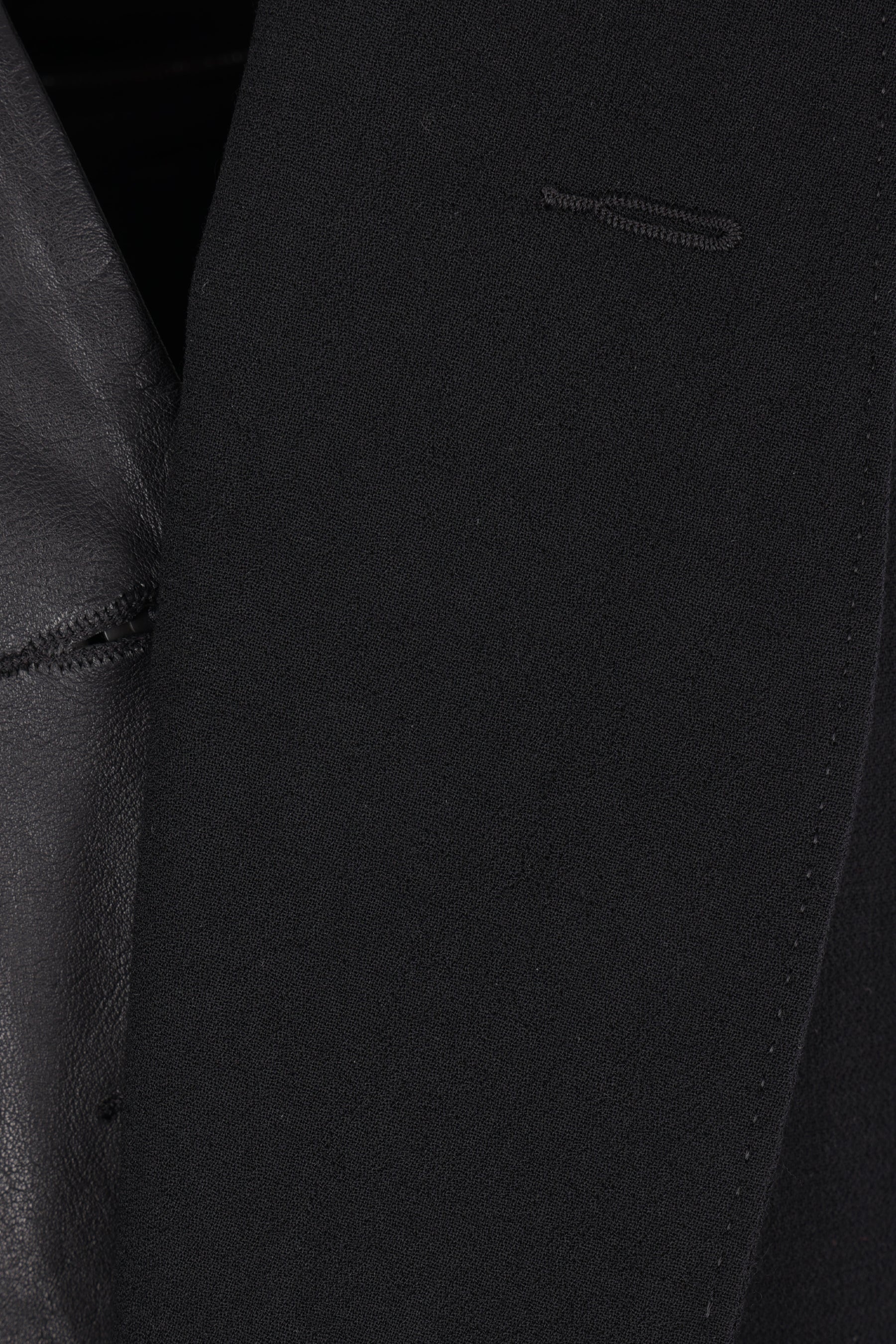 Yehuafan single-breasted jacket crafted from black silk-wool crepe with leather long sleeves. Featuring a stand-up collar, off-center button closure, double-welt pockets, zippered cuffs, a back zip pocket, side vent, and a silk-lined interior.