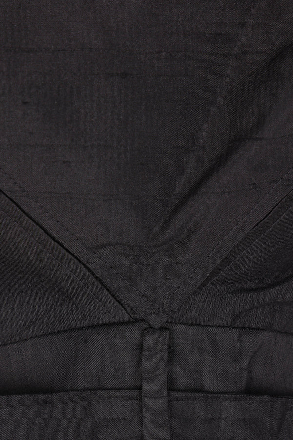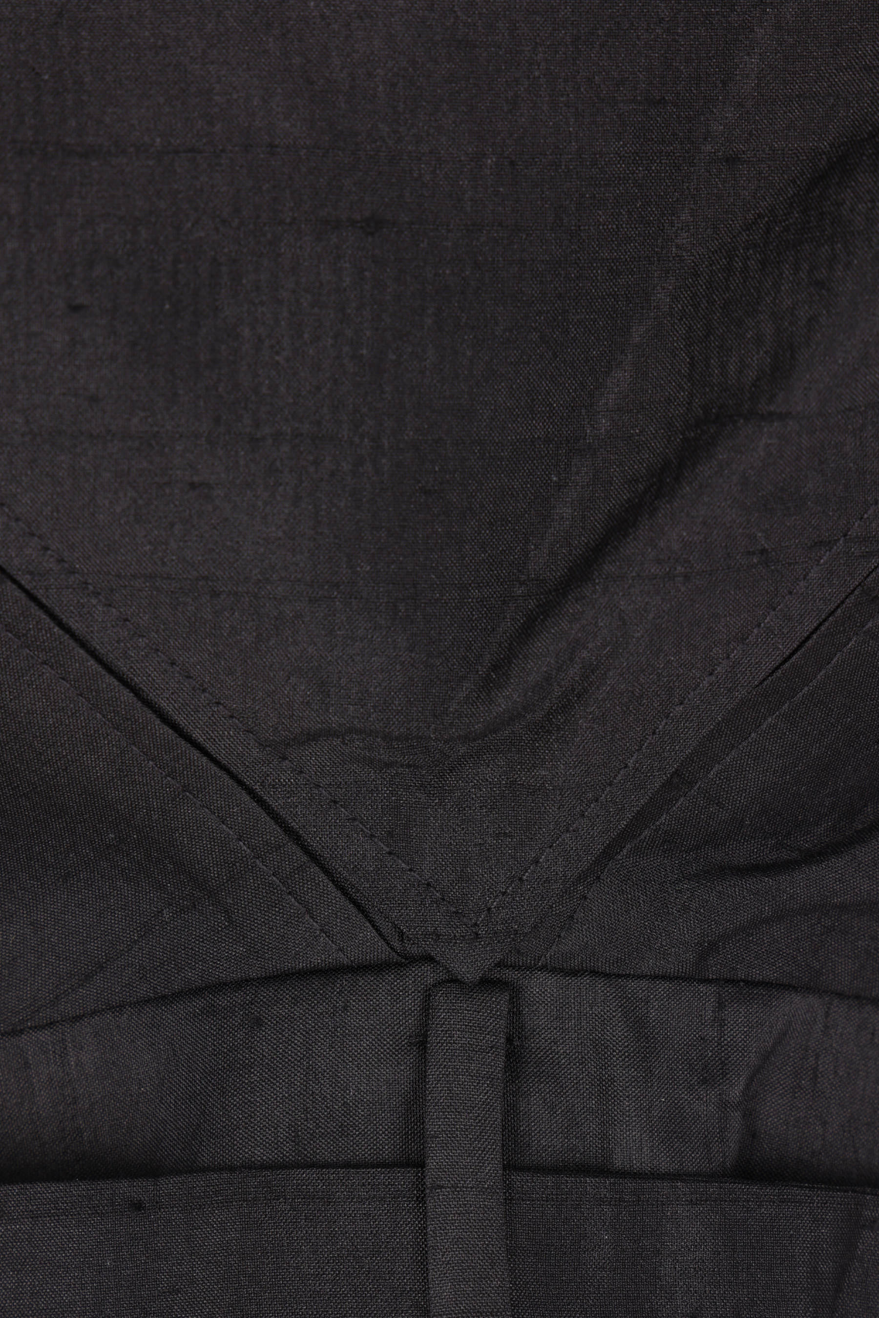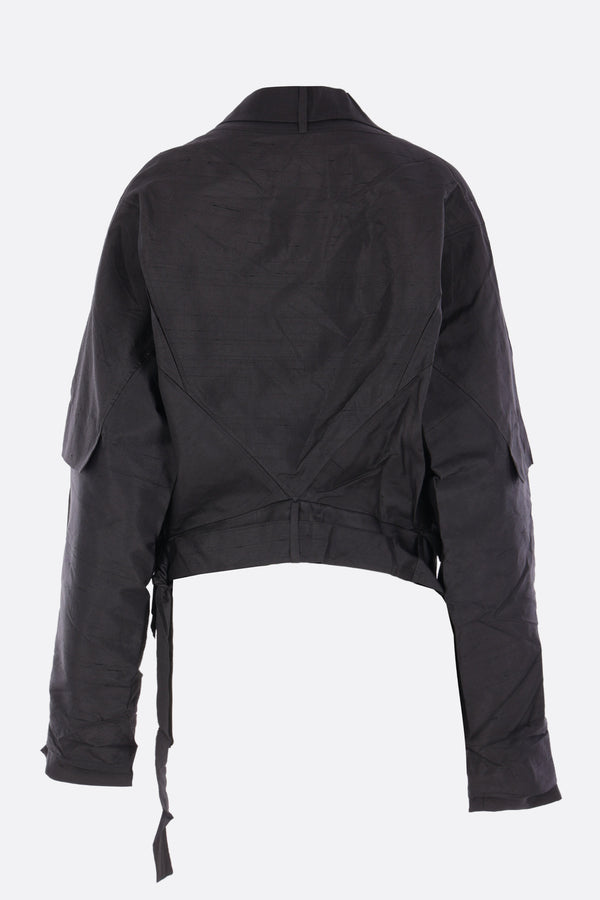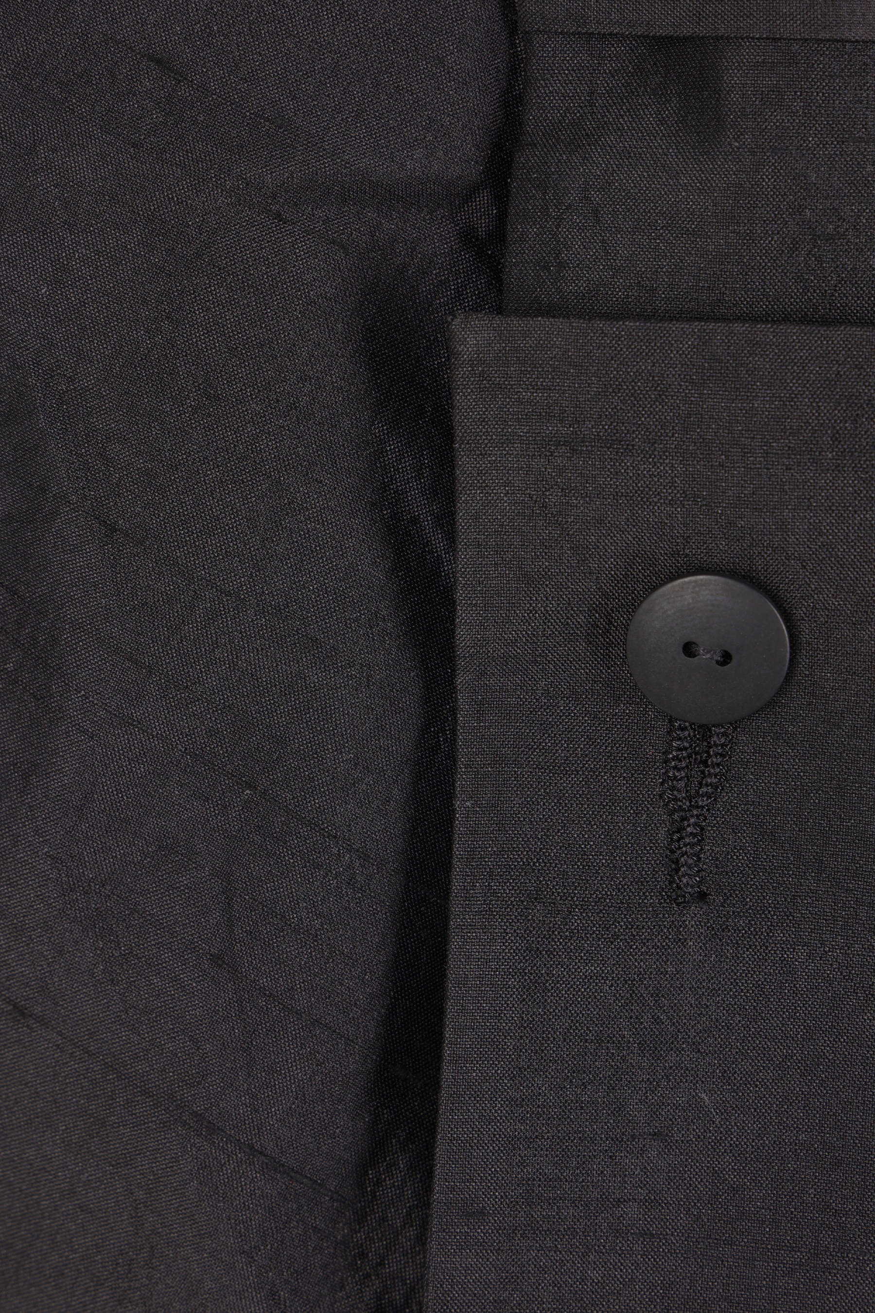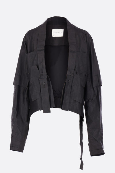 Yehuafan deconstructed jacket crafted from black silk. Featuring decorative straps with buttons, multiple pockets, long sleeves, an asymmetric hem with a matching belt, and a lined interior.