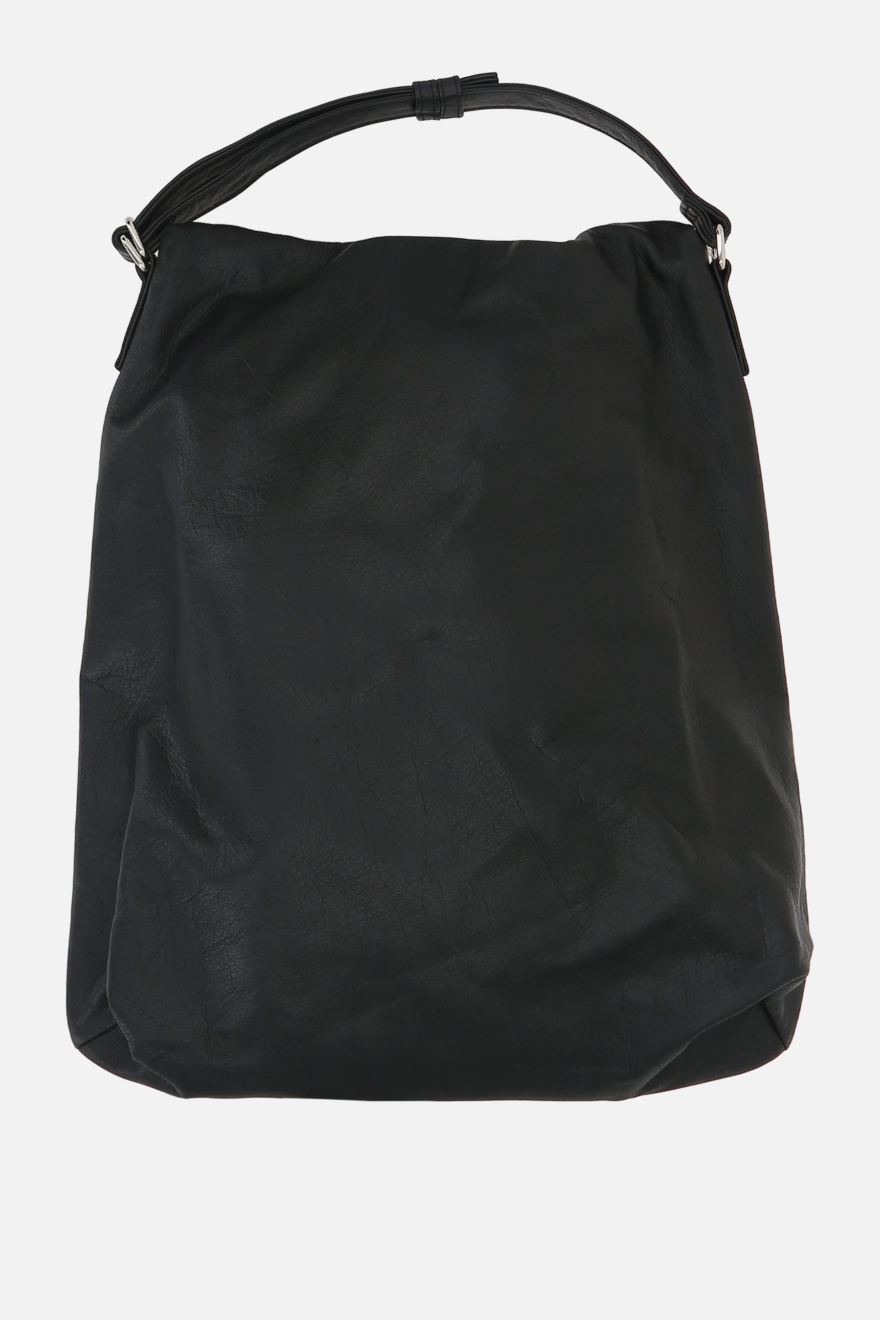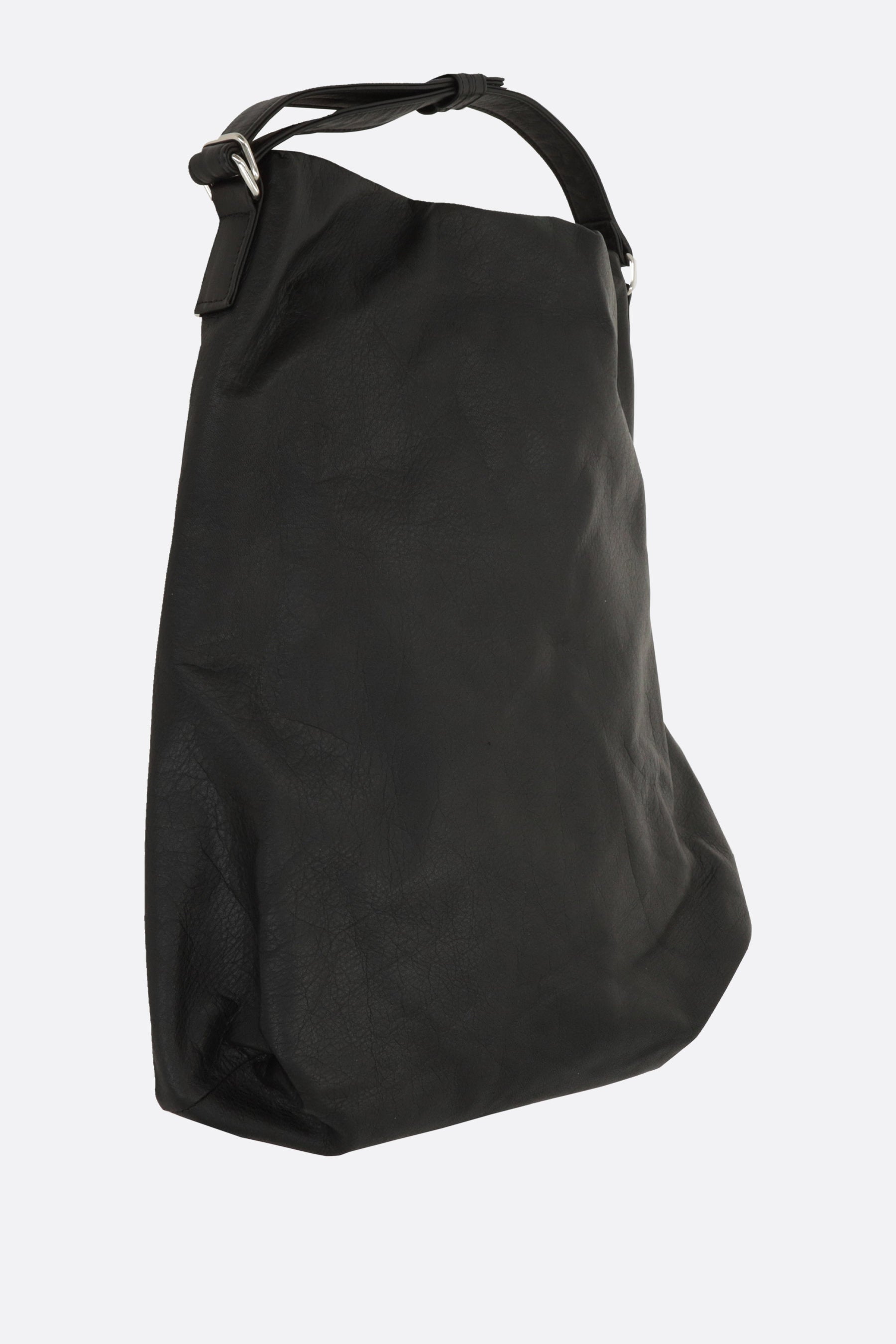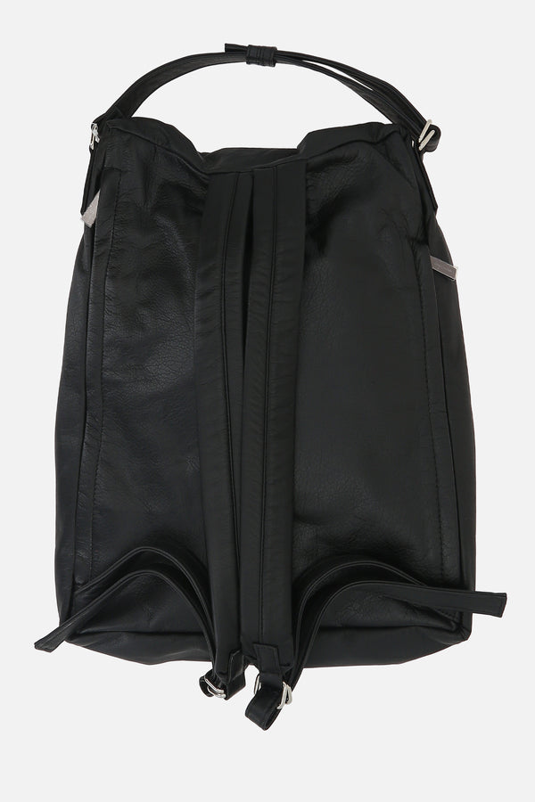 Square backpack by Yohji Yamamoto made of black garment leather.