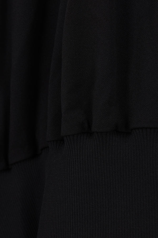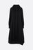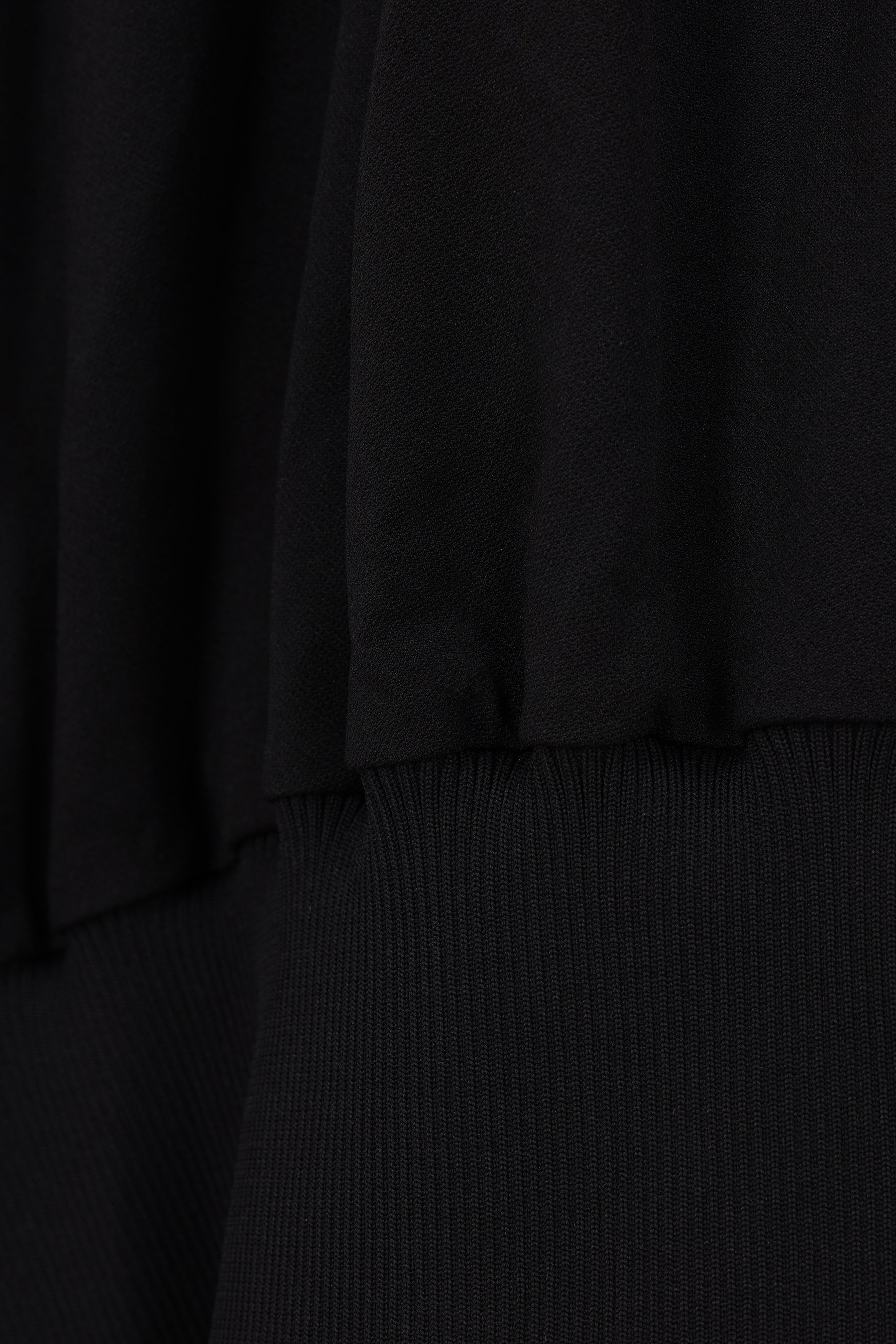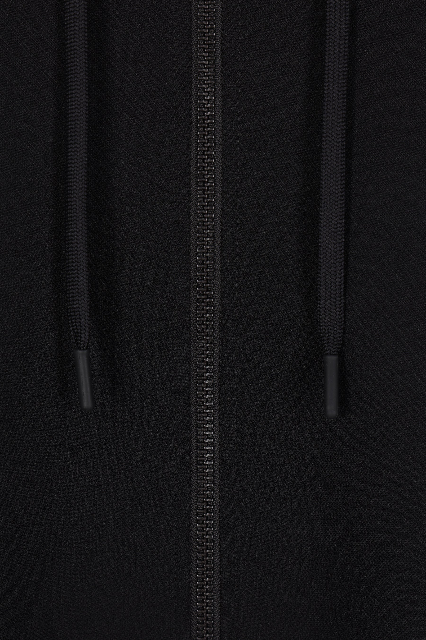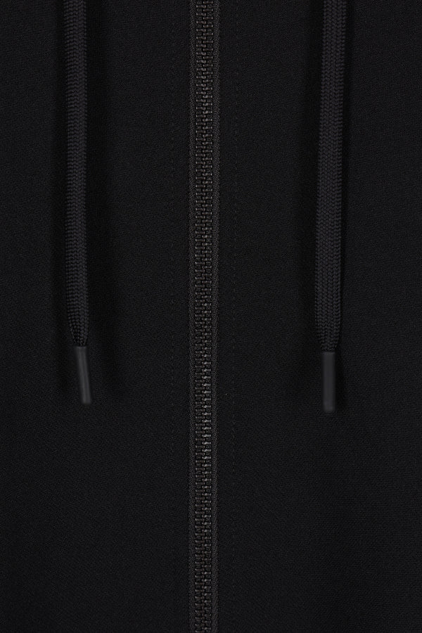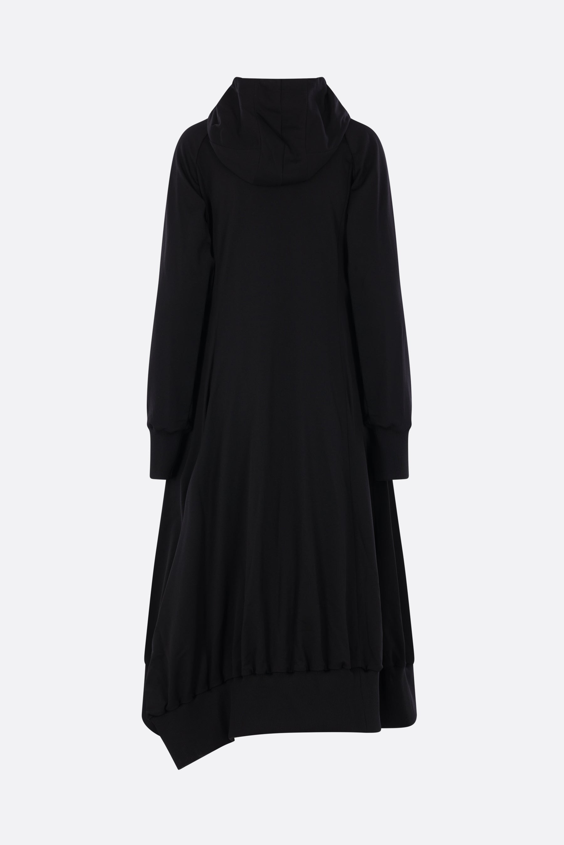 Yohji Yamamoto long dress made of black technical jersey. It features a drawstring hood, a double-zip closure, concealed side pockets, long sleeves, ribbed knit trims, and a deconstructed hem.