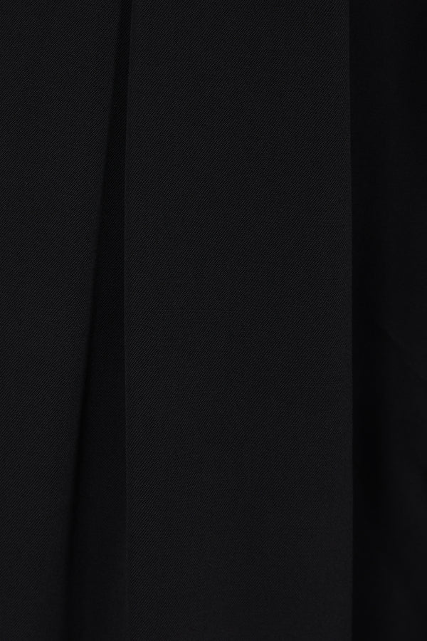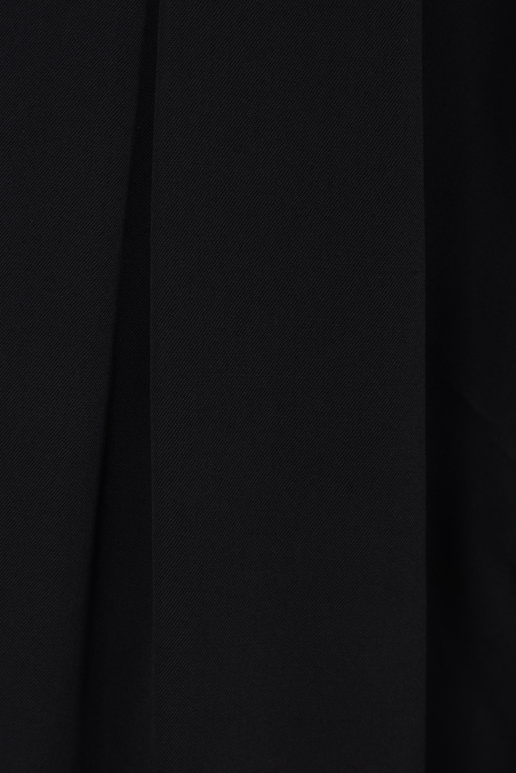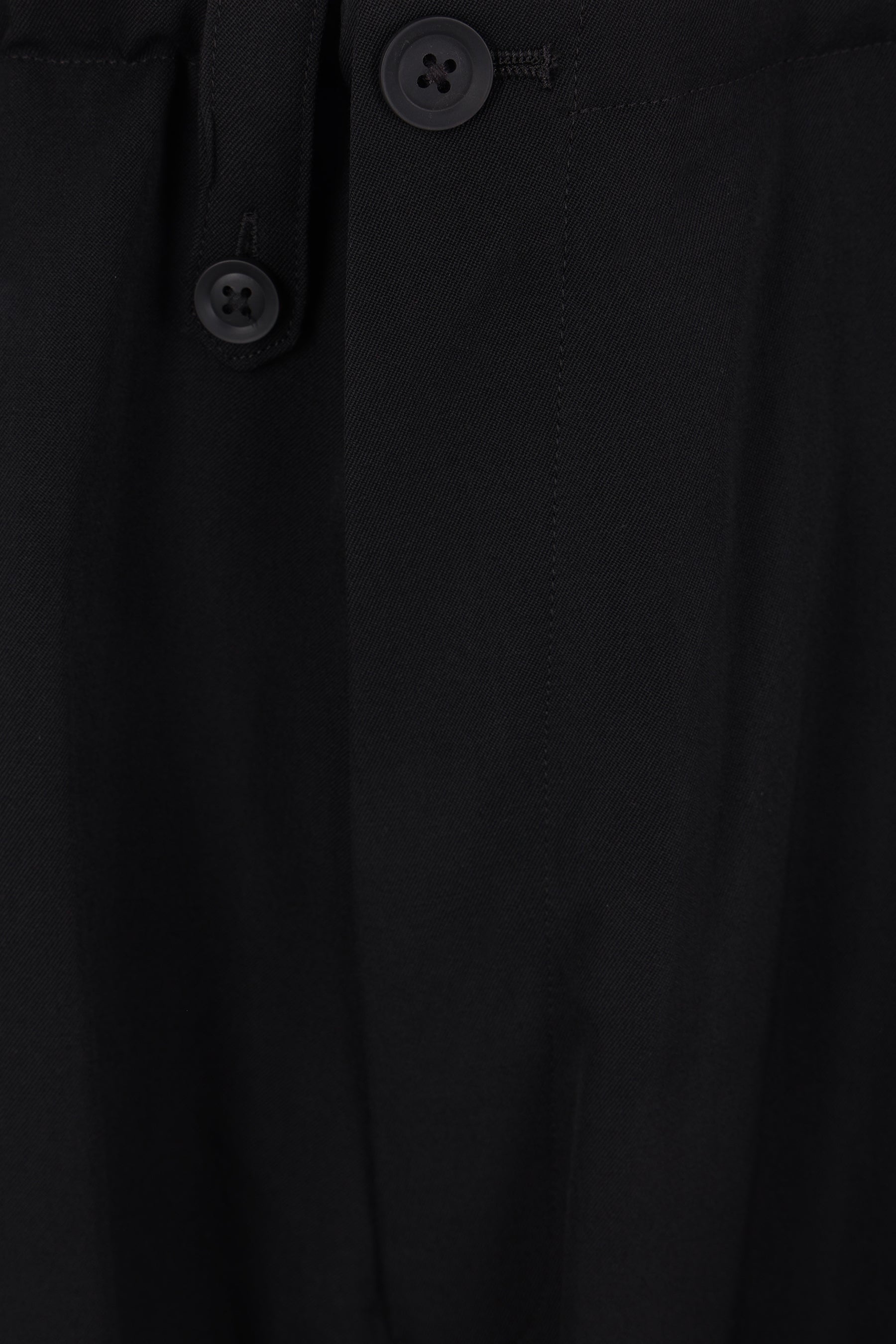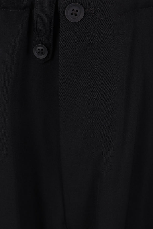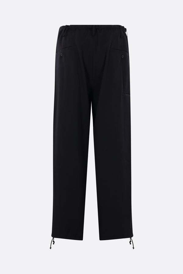 Yohji Yamamoto oversized trousers made from black wool gabardine. Features a drawstring waist, front button and zip closure, belt loops, front pleats, multiple pockets, and drawstring hems. Partially lined interior.