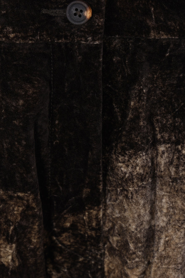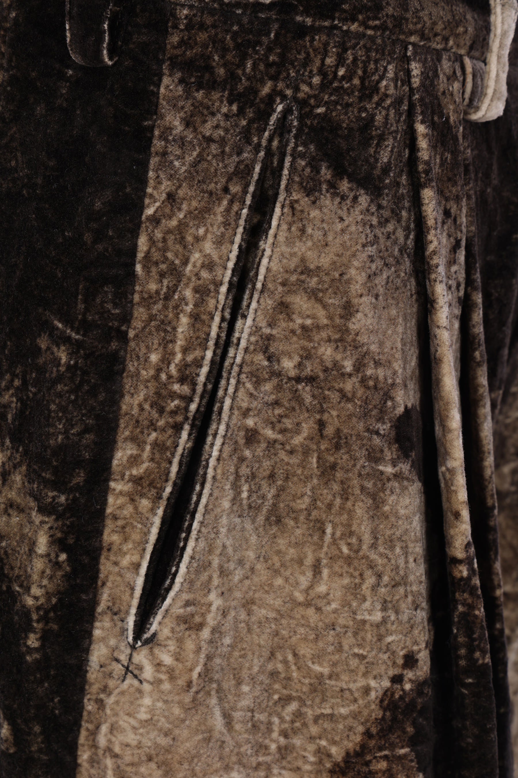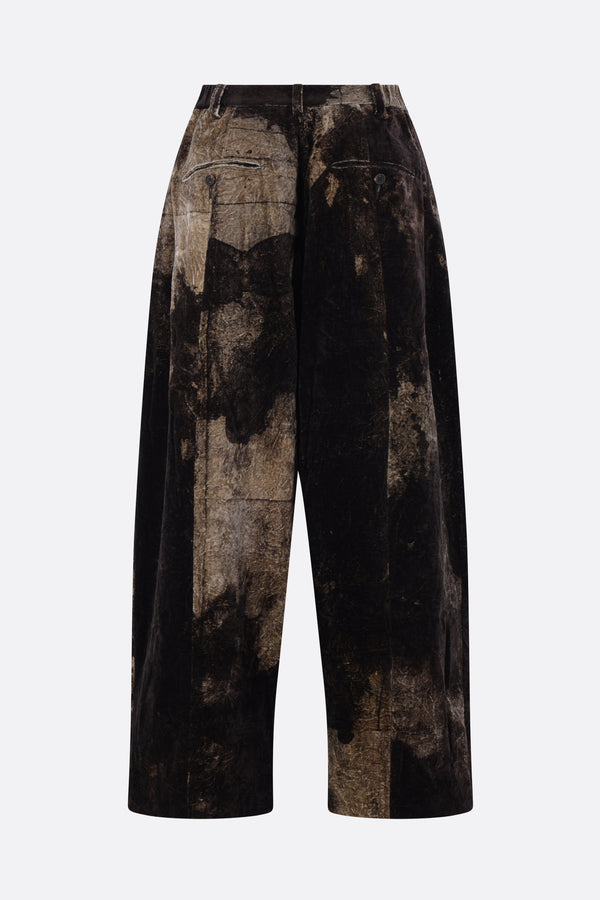 Ziggy Chen trousers crafted from crinkled-effect cotton velvet with a digital print in shades of black and taupe. Features a front button and zip closure, belt loops, elasticated waist inserts, front pleats, multiple pockets, and a lined interior.