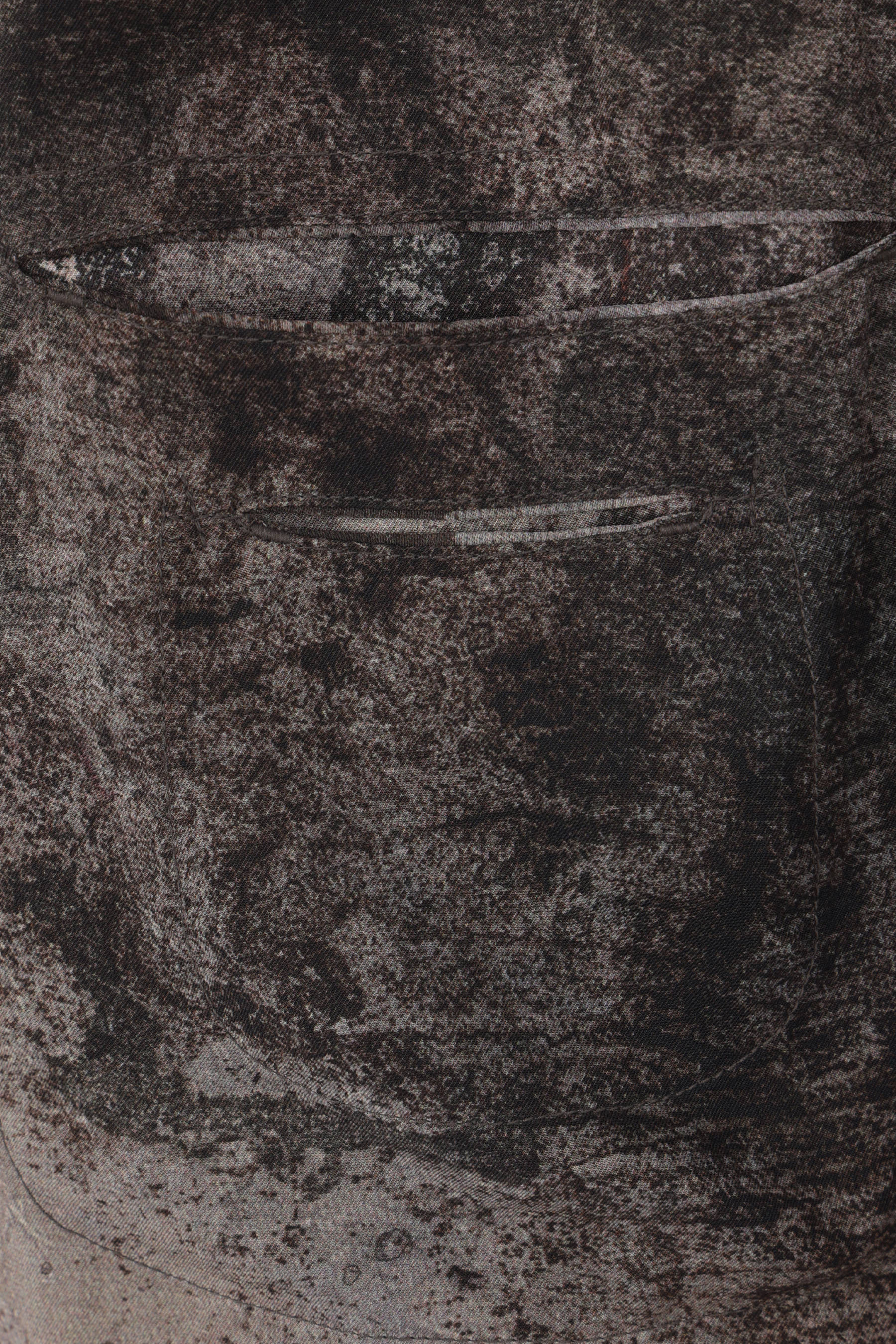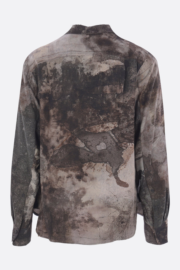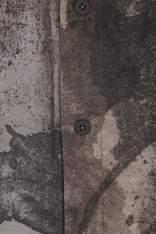 Ziggy Chen shirt made of silk with a digital print in shades of grey. Featuring a classic collar, front button closure, front pockets, long sleeves with buttoned cuffs, and a rounded hem.