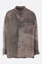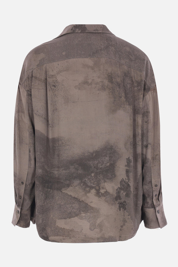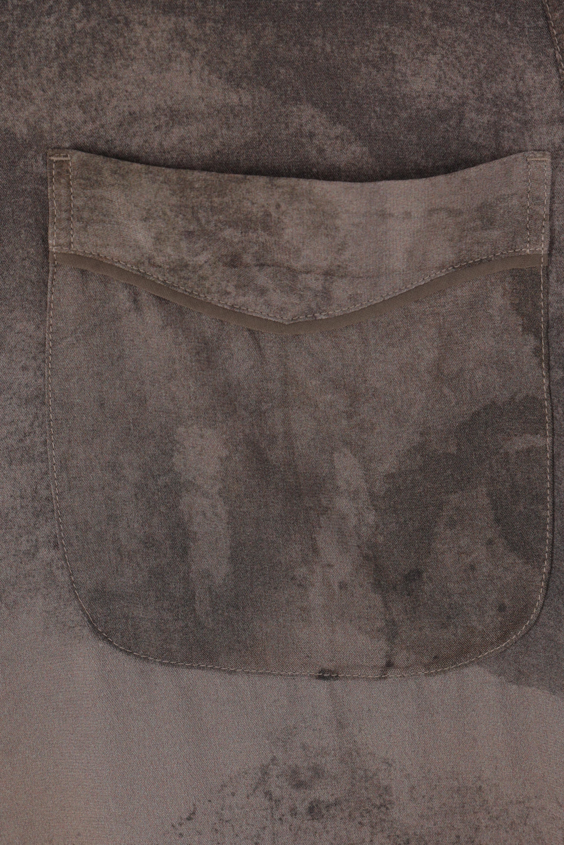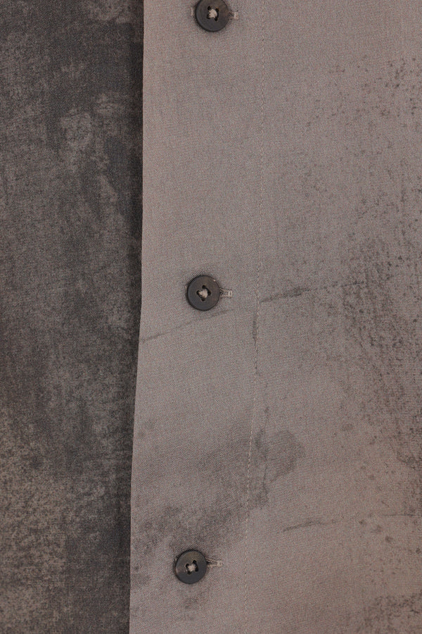 Ziggy Chen oversized deconstructed shirt crafted from gray silk with digital print. Featuring a pointed collar, asymmetric button fastening, long sleeves with buttoned cuffs, and a rounded hem.