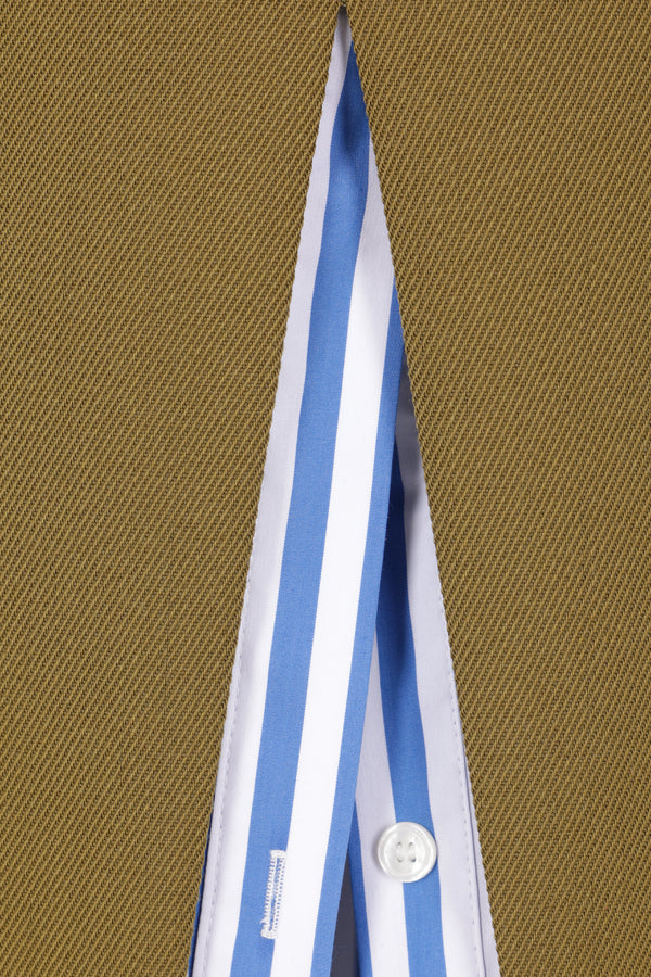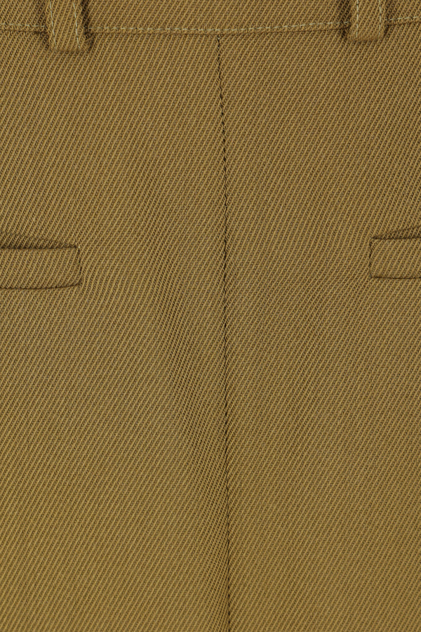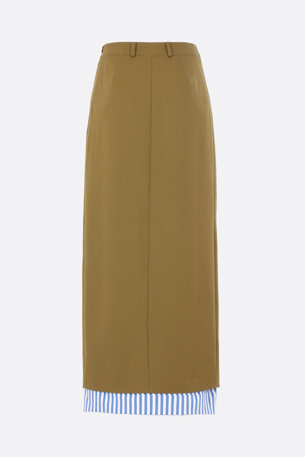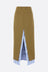 Zomer long skirt crafted from military green wool blend. Featuring a side invisible zip closure, belt loops, front welt pockets, and a central slit with a striped poplin button-up shirt-style detail.