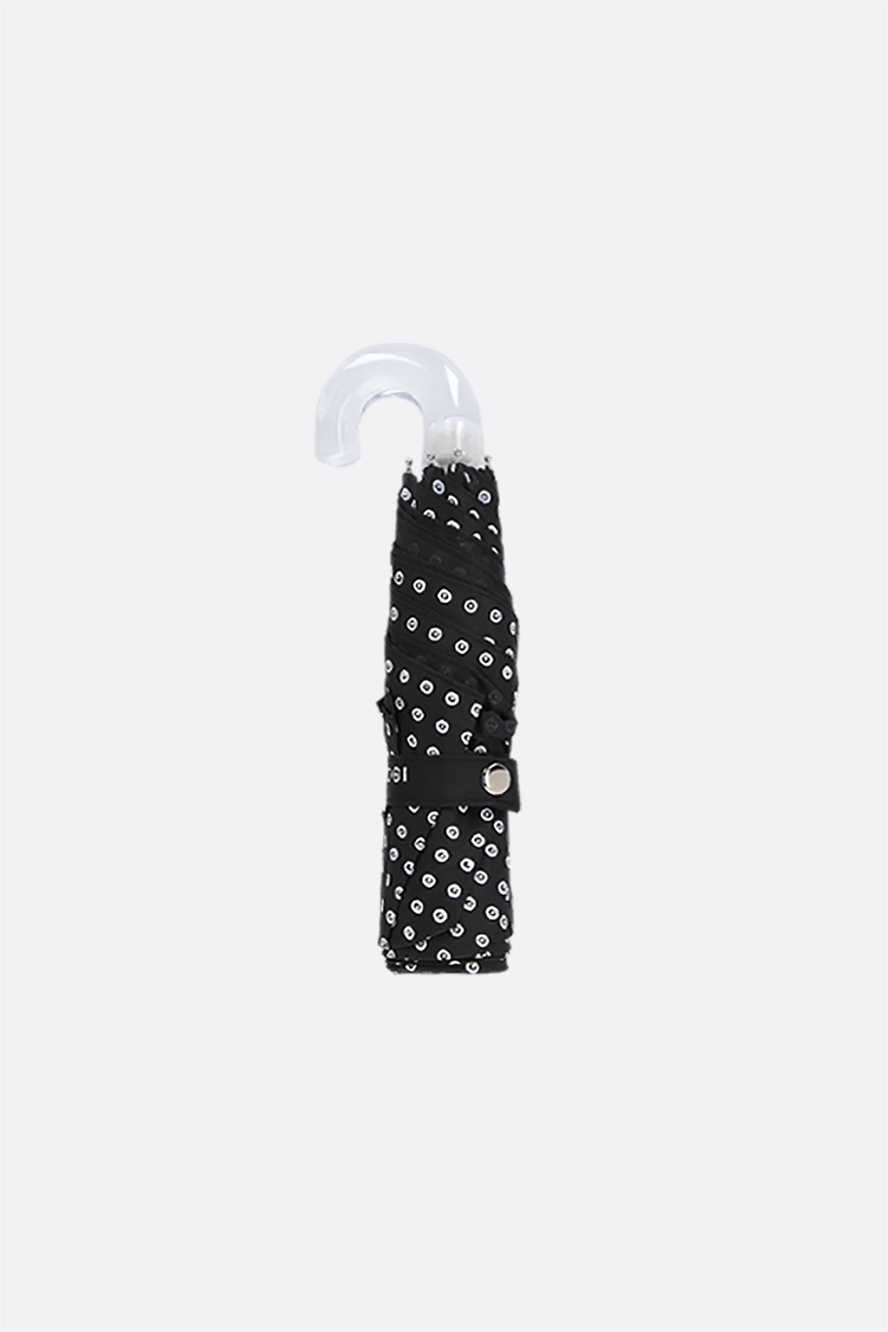 Pocket umbrella by 10 Corso Como crafted in black nylon with micro circles print. Features a transparent plastic handle, snap button closure, aluminum ribs and a transparent plastic case.