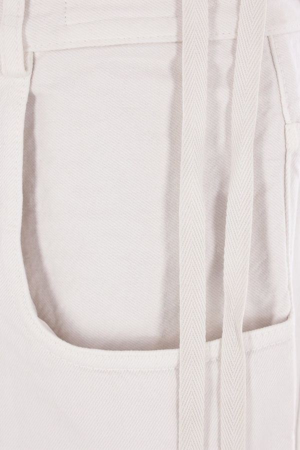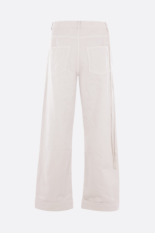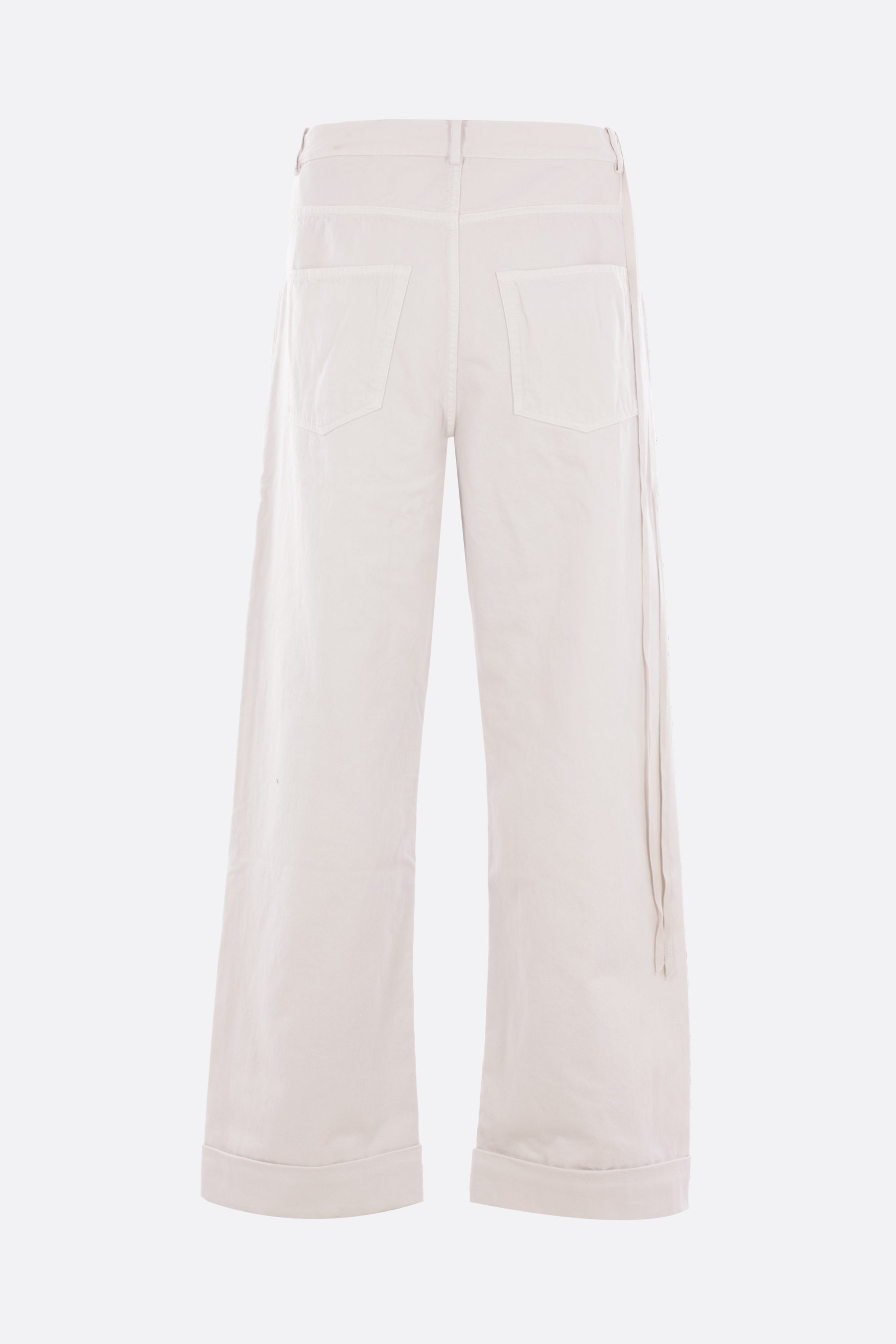 Ann Demeulemeester baggy jeans crafted from ivory cotton denim. They feature a front closure with metal buttons, belt loops, and five classic pockets. The design is completed with decorative waist ties.