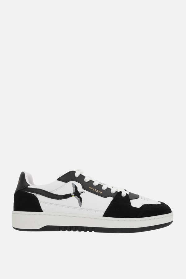 Axel Arigato low-top sneakers crafted in white smooth leather and black suede with Bee Bird embroidery on side. Featuring lace-up closure, a round-toe silhouette, fabric lining and recycled rubber sole. The design is completed by the iconic logo embossed on side.