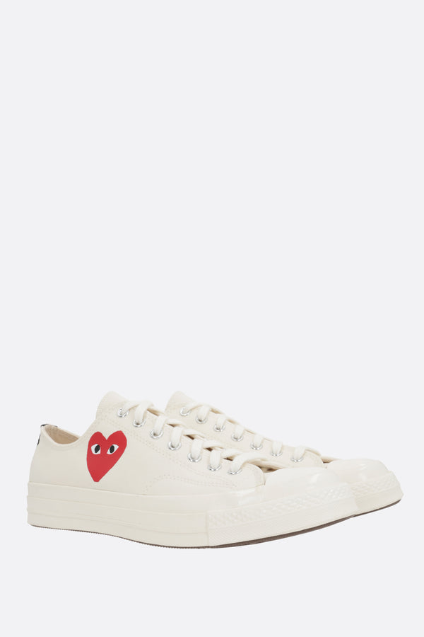 Comme des Garçons Play x Converse's low-top sneakers crafted in off-white canvas with tone-on-tone toe cap in shiny rubber. Featuring lace-up closure, a round-toe silhouette, fabric lining and rubber sole with logo patch at heel. The design is completed by Filip Pagowski's heart print on side.