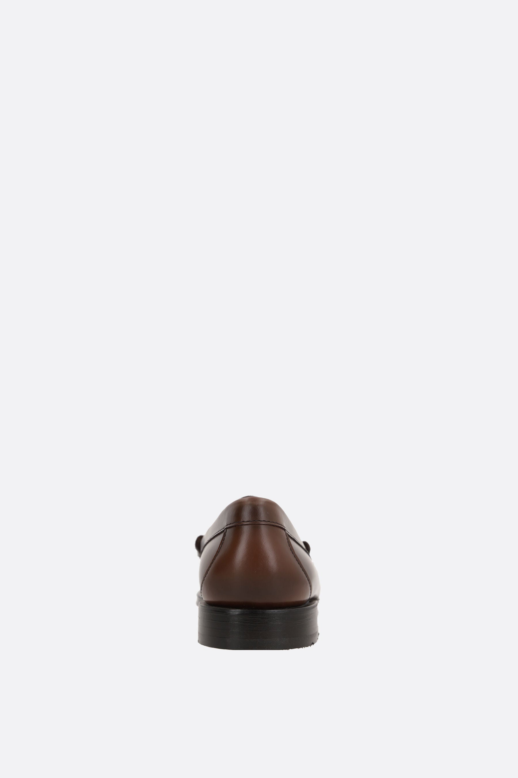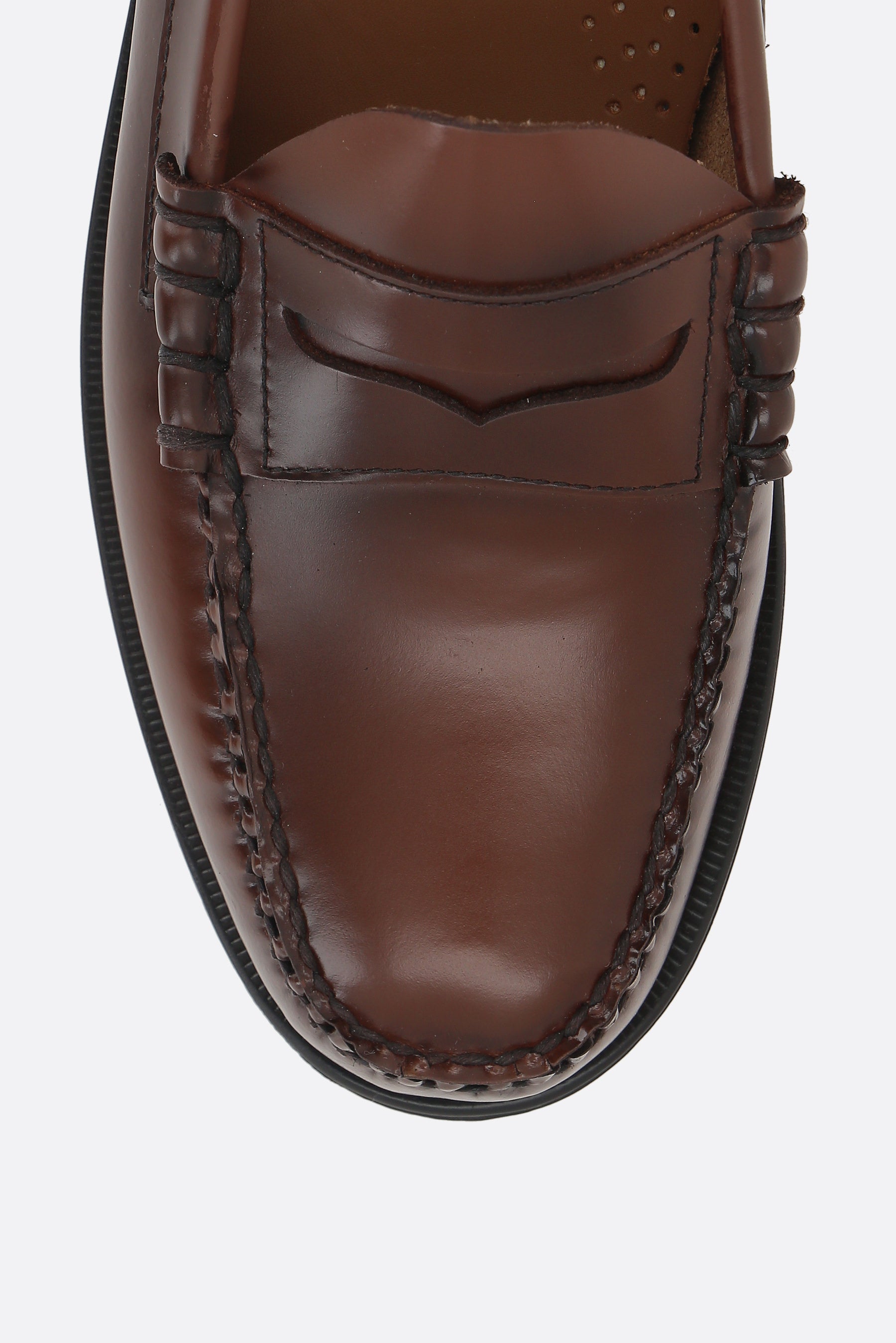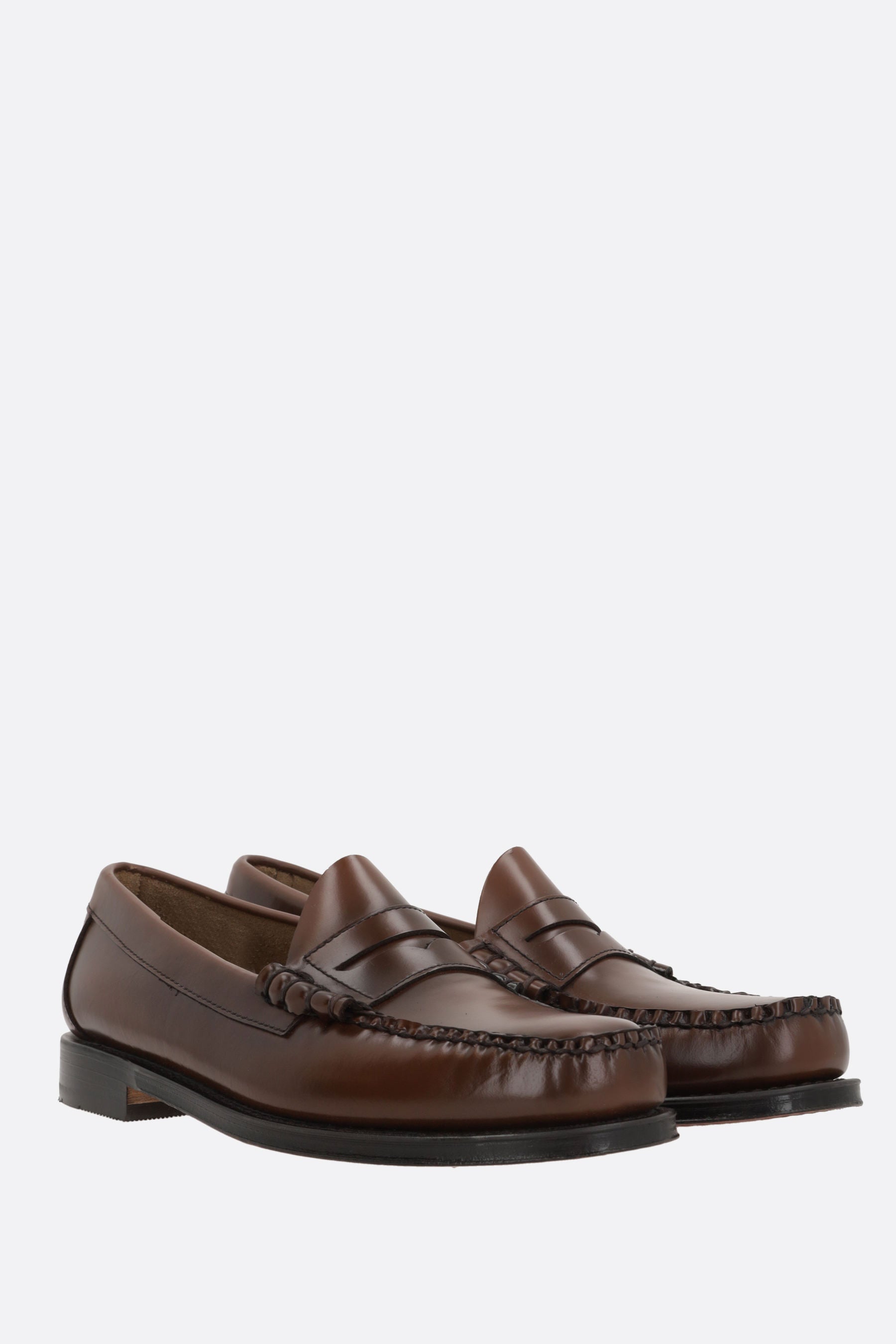 G.H. Bass & Co penny loafers crafted from glossy brown leather. Featuring an almond toe, unlined interior, and leather sole.