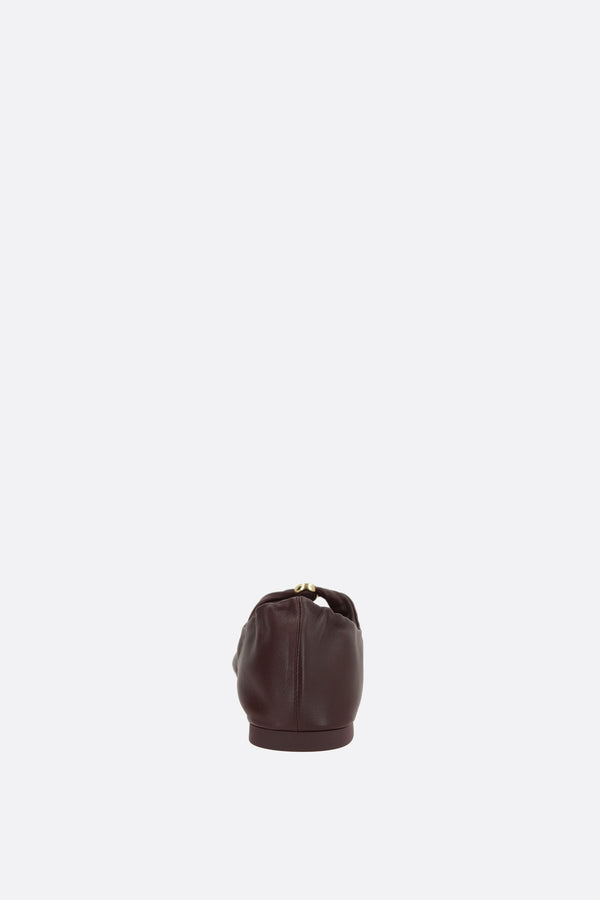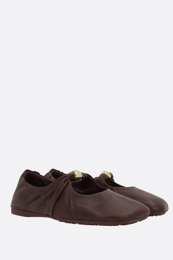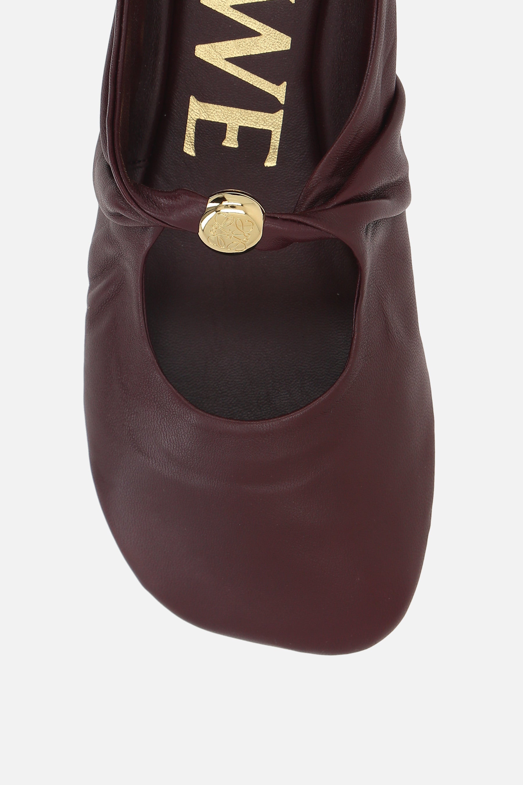 Loewe ballerinas crafted from burgundy nappa leather. Featuring a petal-shaped toe, twisted strap with metal detail engraved with the Anagram, leather lining, and rubber sole.