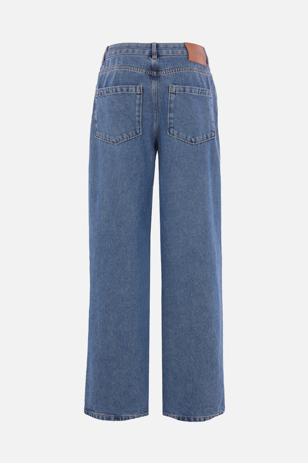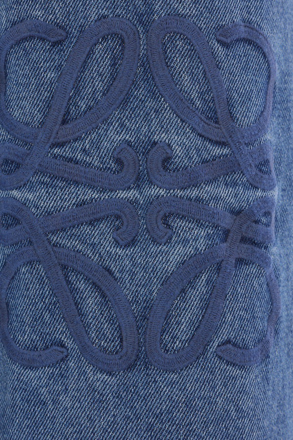 Loewe baggy jeans crafted from light blue cotton denim with Anagram embroidery on the knees. Featuring front closure with metal button and zip, belt loops, five classic pockets, and a leather logo patch on the back.