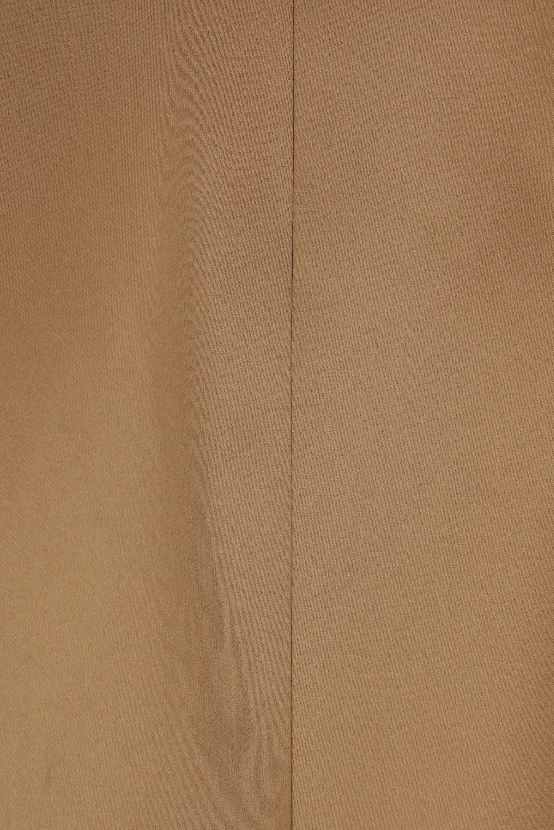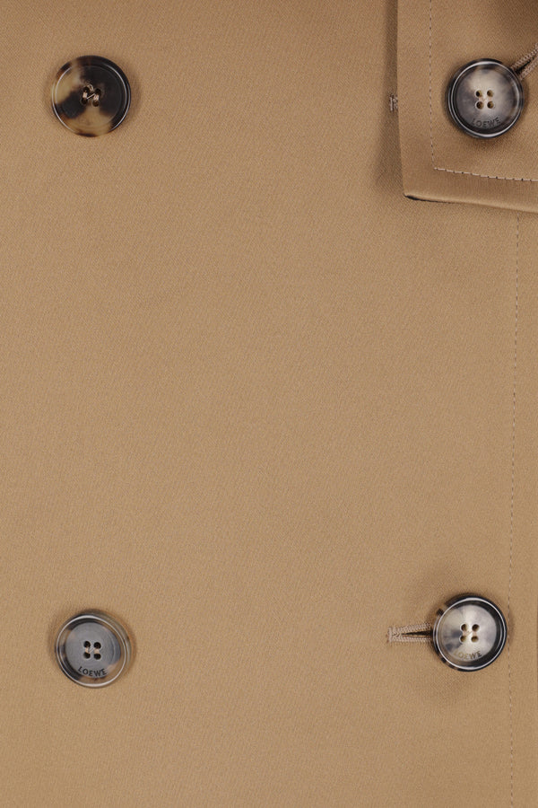 Loewe cape crafted from beige cotton. Featuring a pointed collar with removable throat strap, double-breasted button closure, hidden side pockets, front storm flap, sleeve openings, and a lined interior.