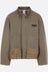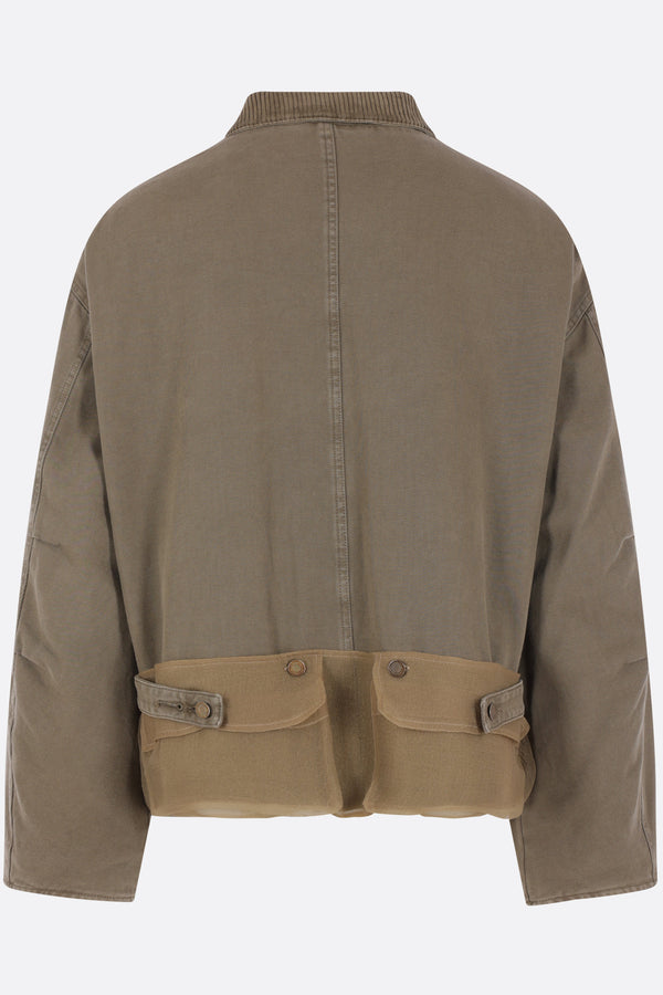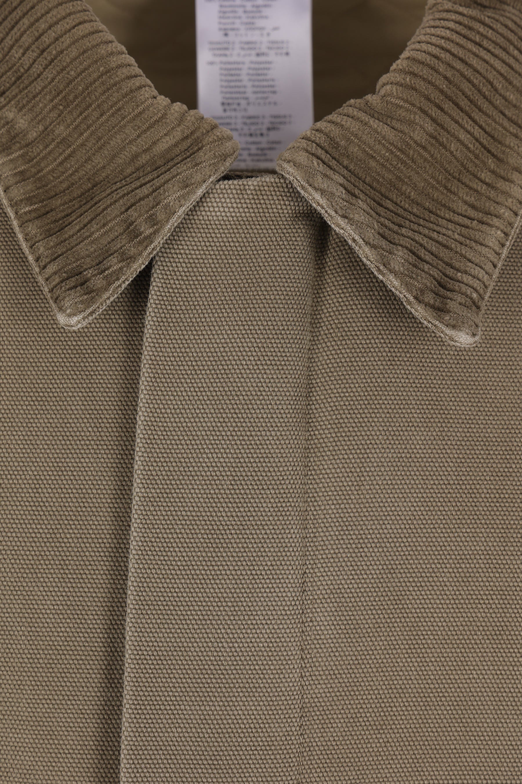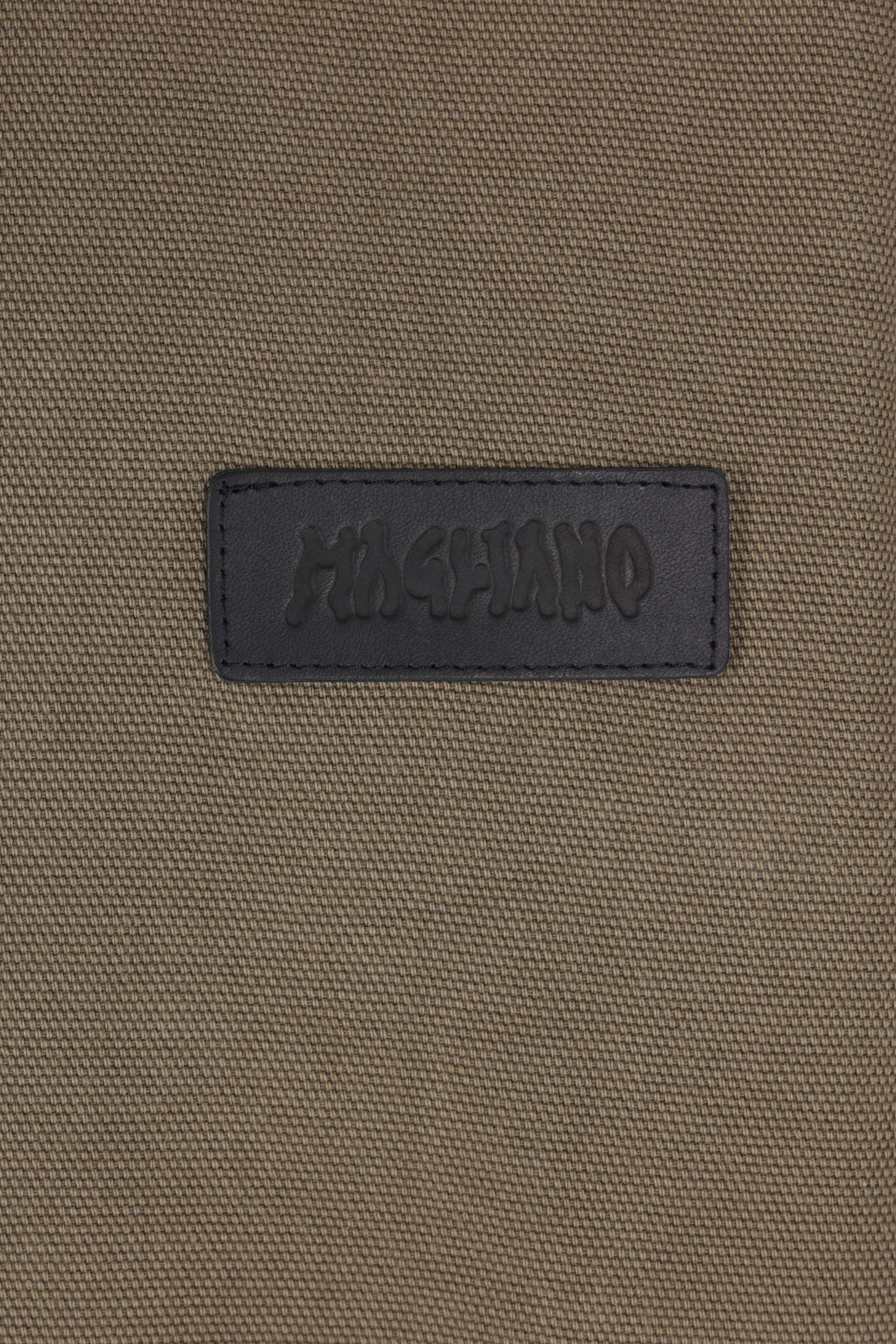 Magliano oversized jacket crafted from khaki cotton canvas with a logo leather patch on the chest. Featuring a pointed corduroy collar, front zip closure, multiple pockets, long sleeves, and an organza hem with pockets and adjustable back tabs. Quilted interior.