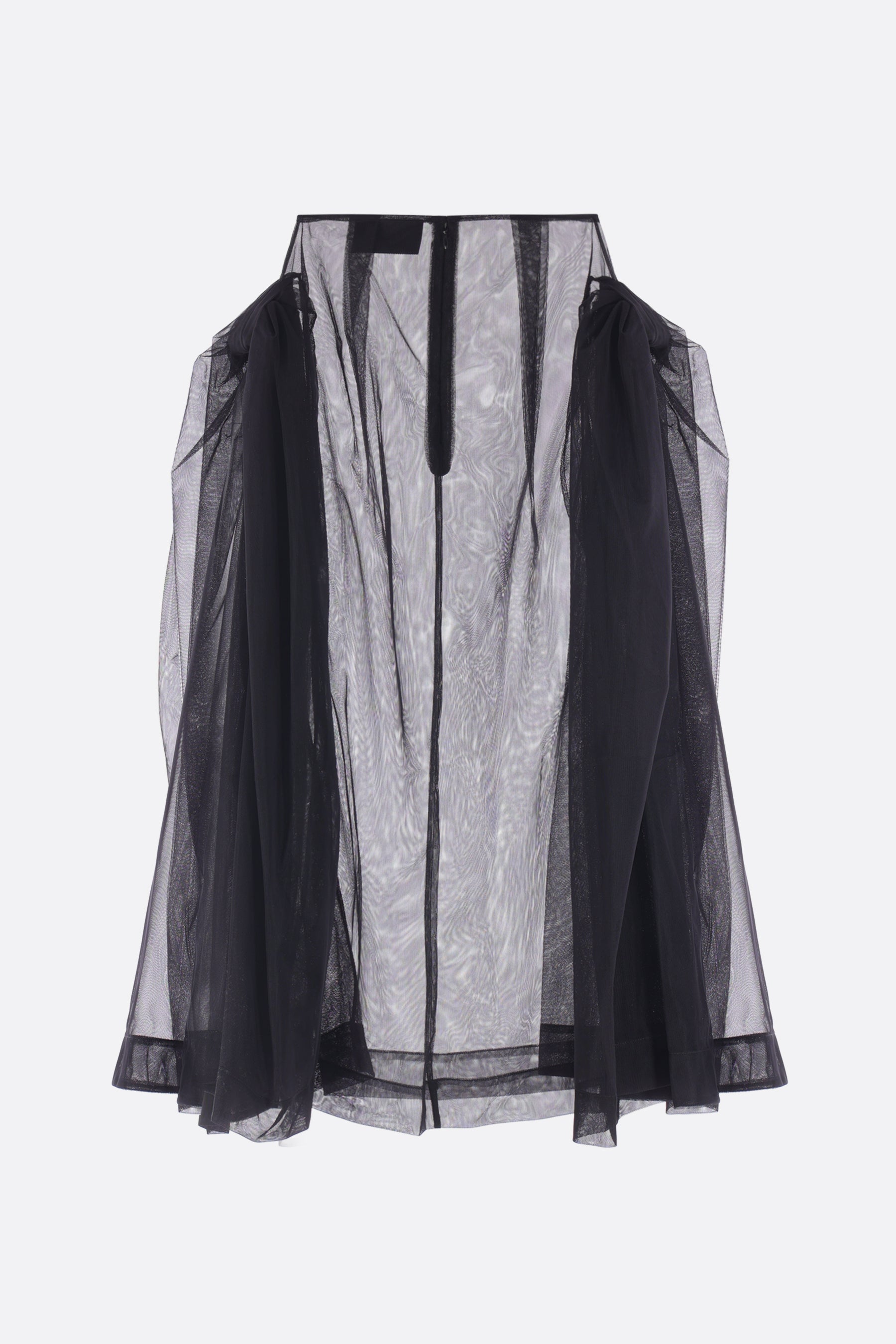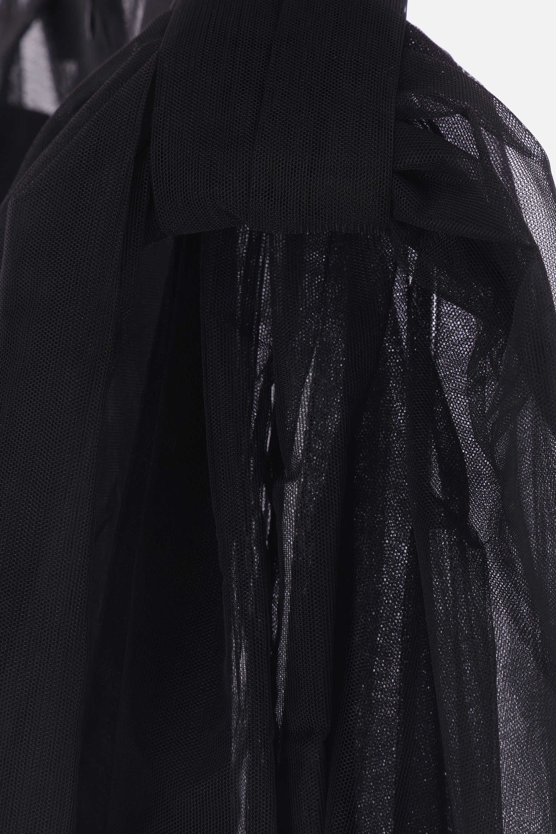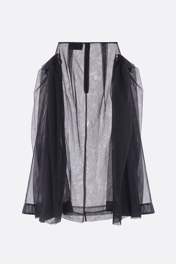 Simone Rocha midi skirt crafted from sheer black tulle. Featuring a back zip closure, concealed side pockets, and bow details at the hips. Unlined interior.