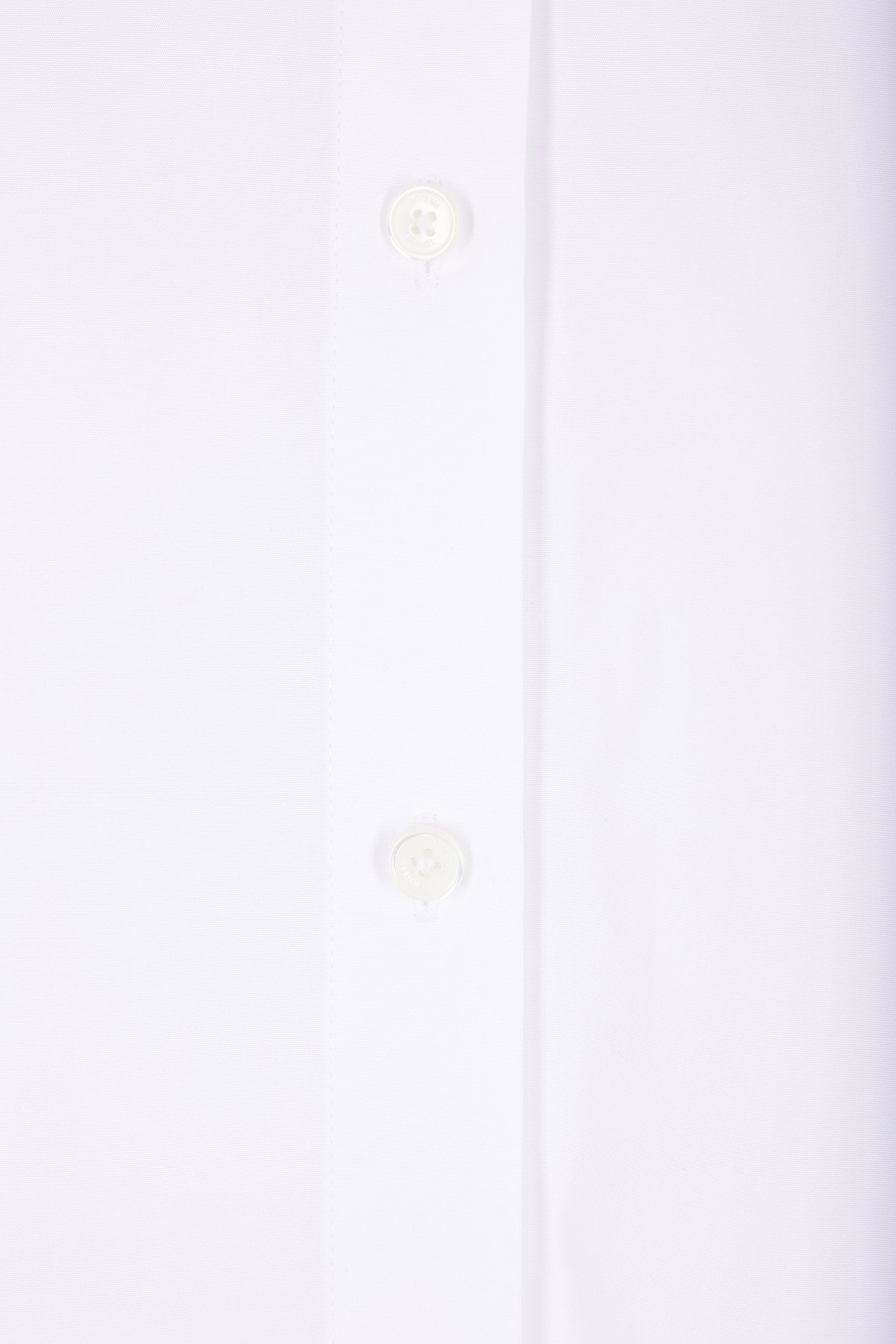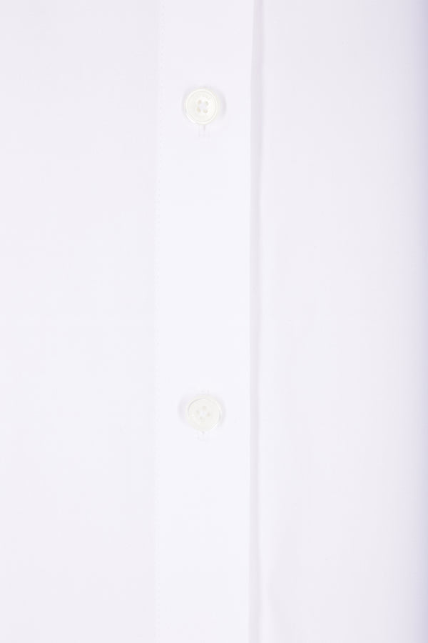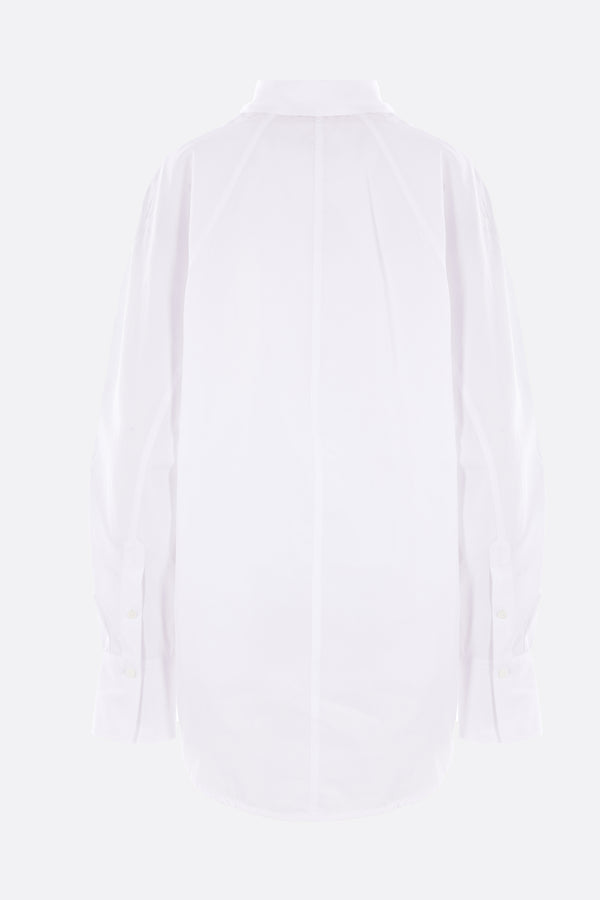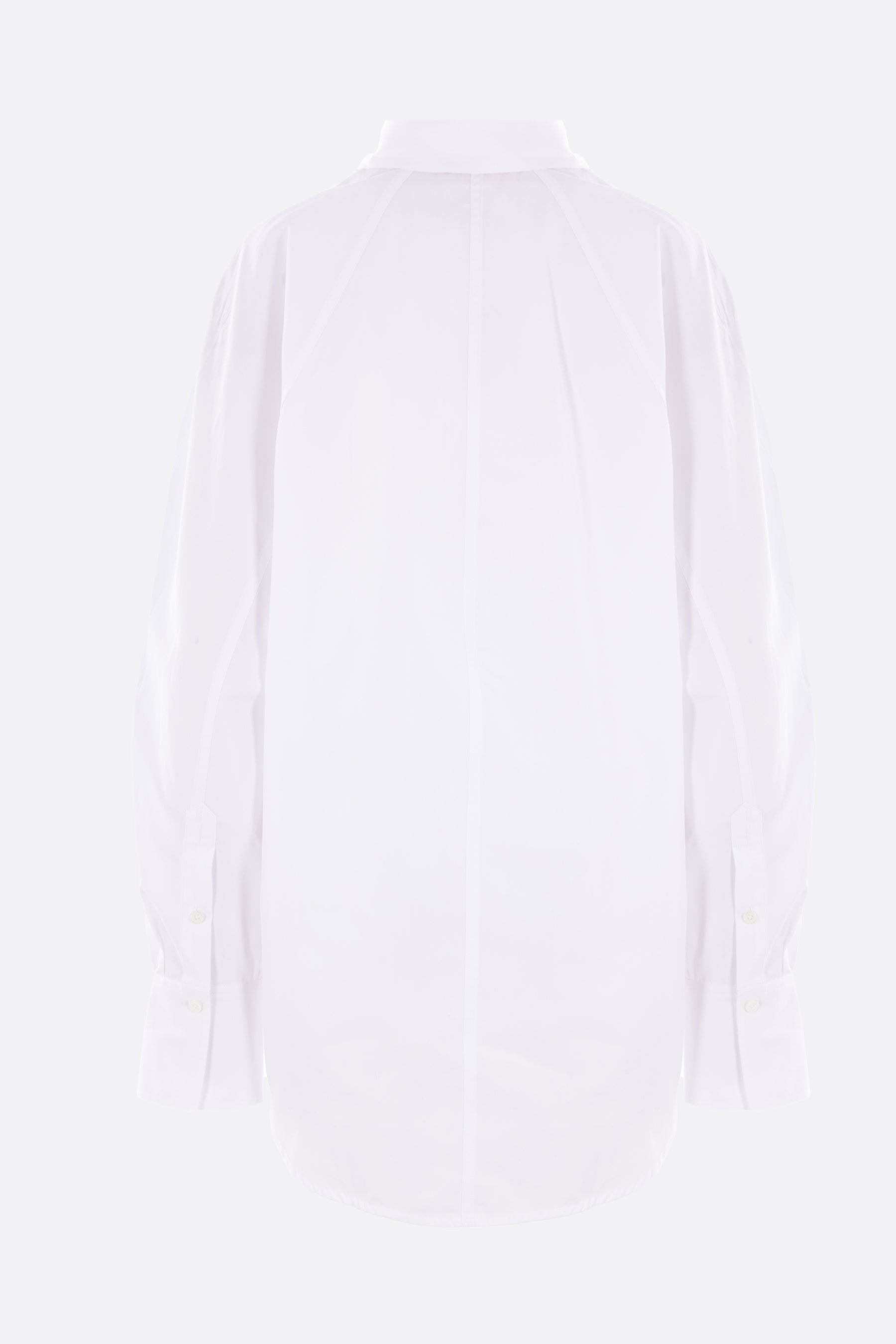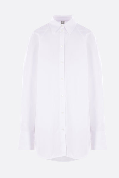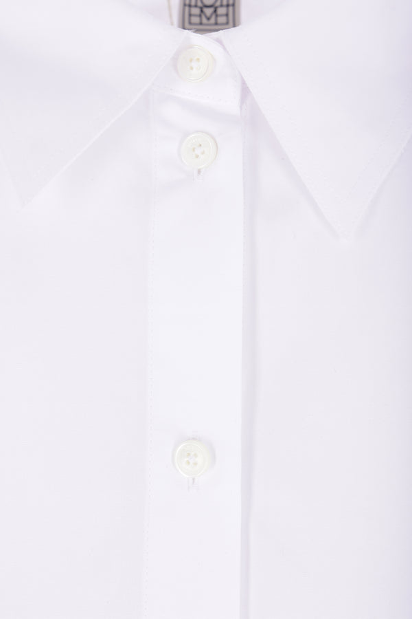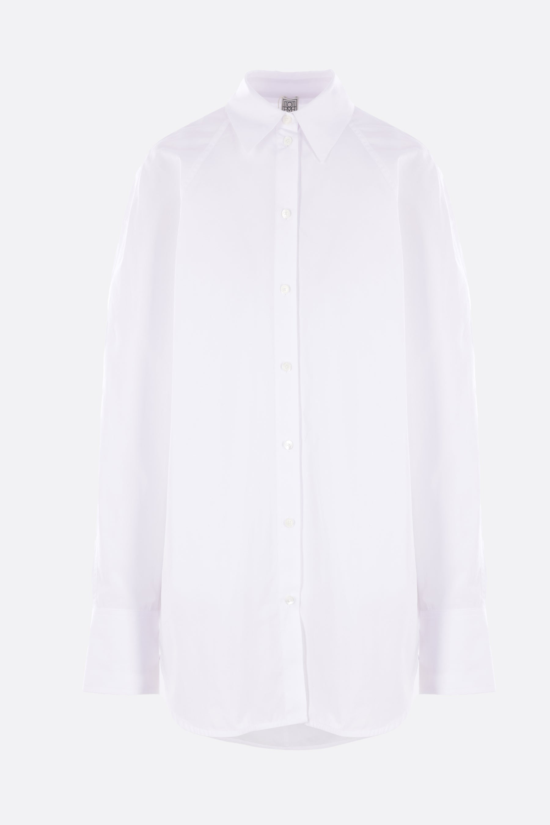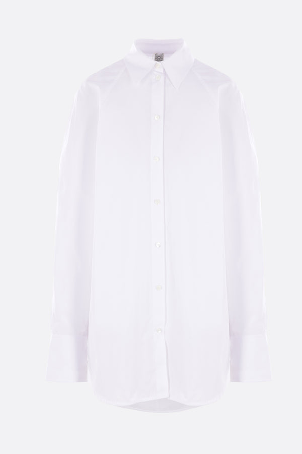 Toteme oversized shirt crafted from white organic cotton poplin. Featuring a pointed collar, front button closure, raglan sleeves with buttoned cuffs, and a rounded hem. The design is completed with raw-cut edges on the collar and cuffs.