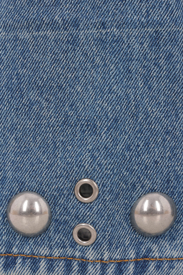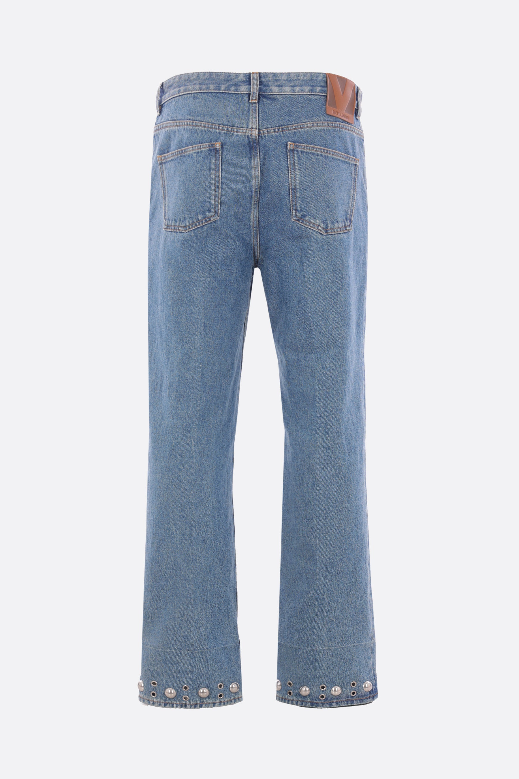 Valentino Garavani jeans crafted from blue cotton denim with cabochons at the hem. Characterized by a front closure with metal buttons, belt loops, classic five-pocket design, center crease, and leather logo patch on the back.