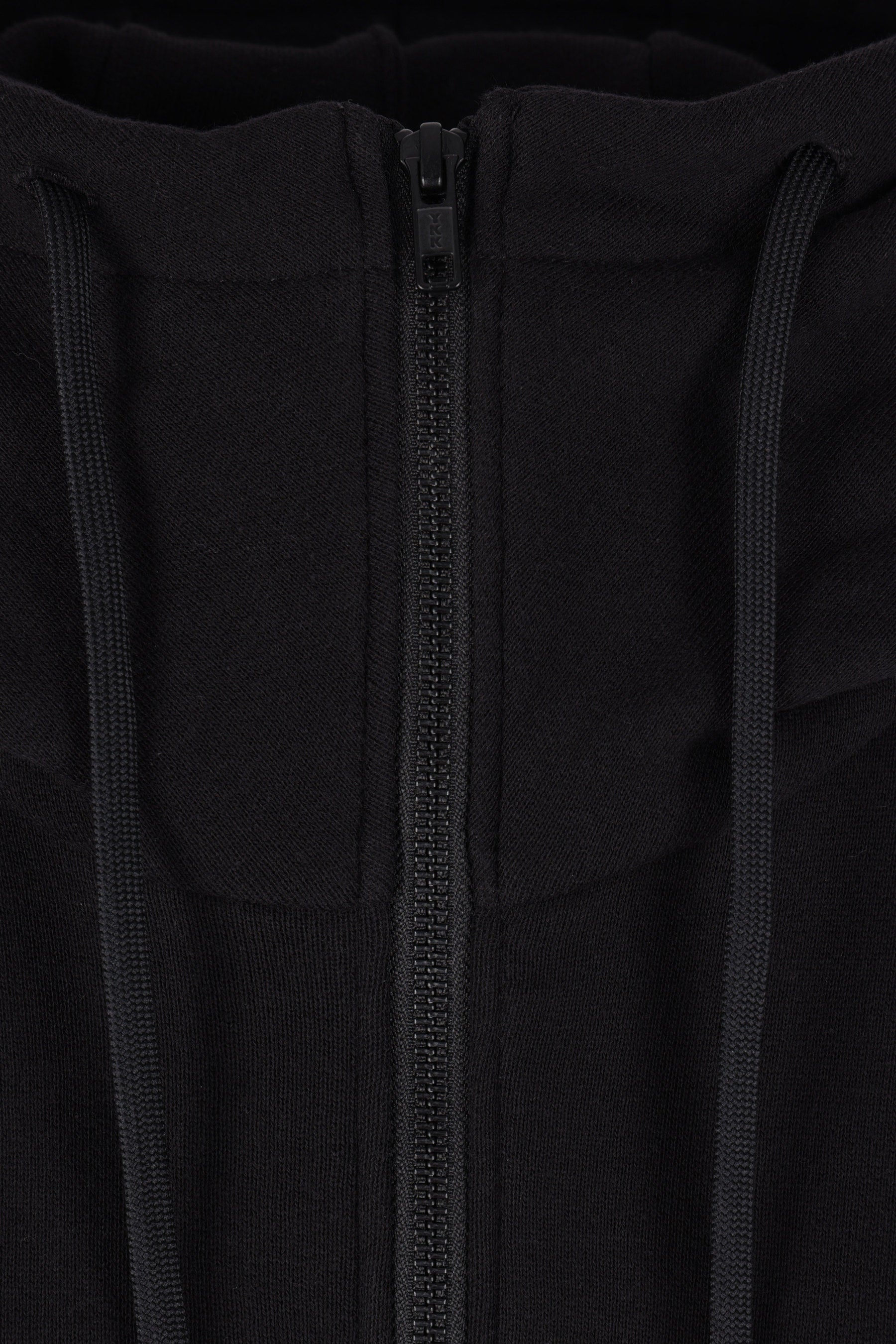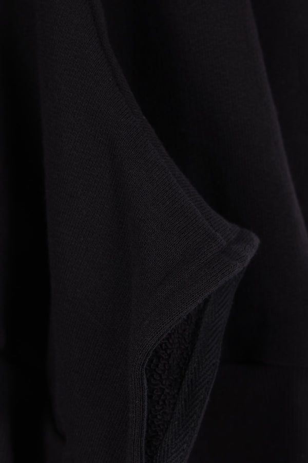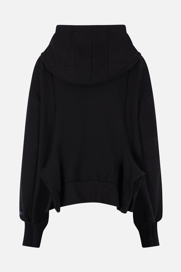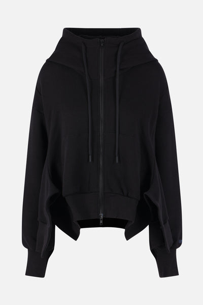 Yohji Yamamoto deconstructed hoodie crafted in black cotton-blend jersey. Features a front double-zip closure, kangaroo pockets, long sleeves, ribbed edges, and an asymmetric hem.