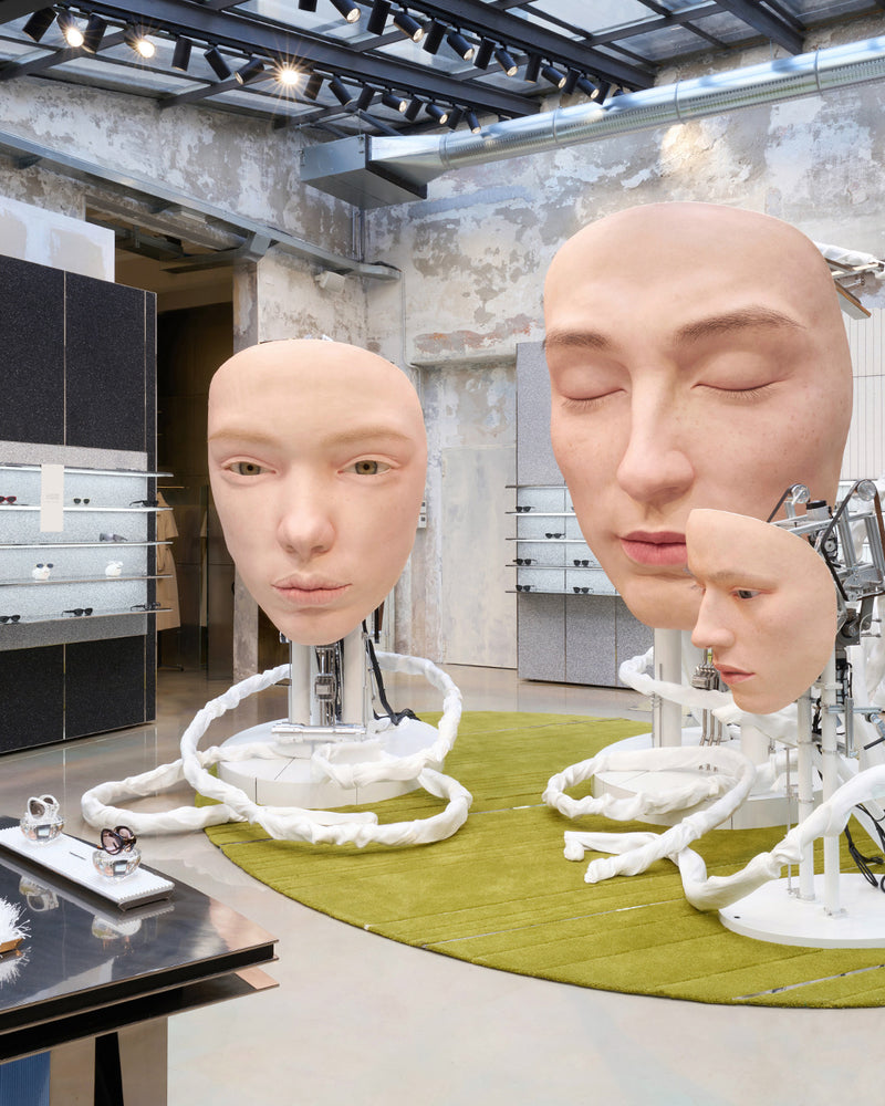 Built in-house by the Gentle Monster Robotics Lab, the GIANT HEAD KINETIC OBJECT consists of three distinct faces. At the center is a face that gently shuts its eyes and shakes its head in contemplation, flanked by a larger face and a smaller one that move fluidly around it. With softly blinking eyelids and subtly shifting pupils, the piece captures the complexity of cognition, emotion, and human connection.