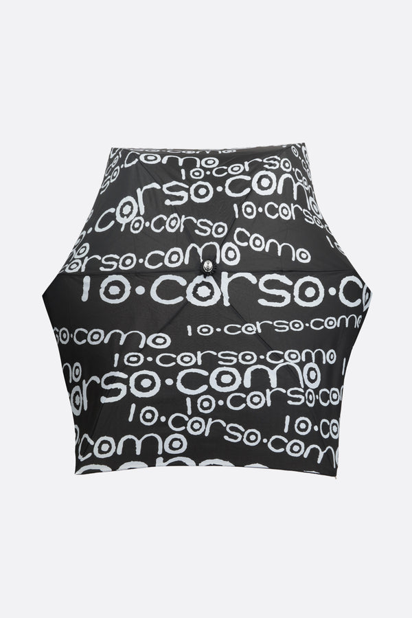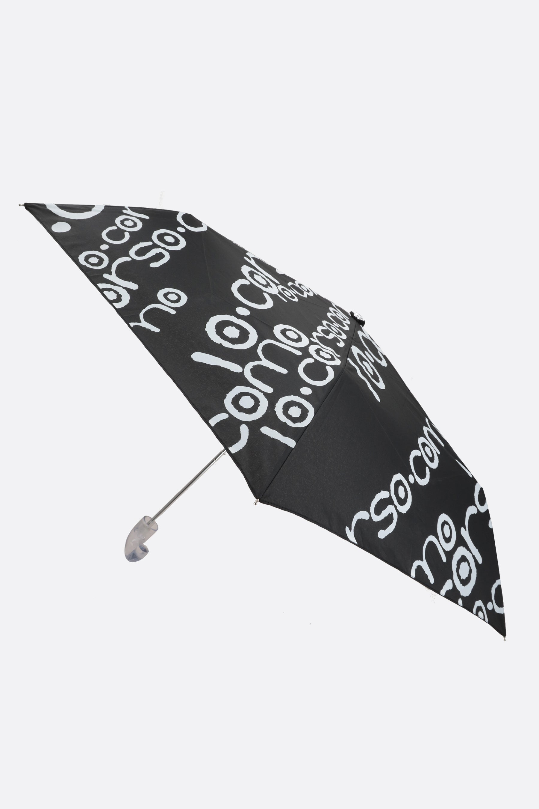 10 Corso Como pocket umbrella made from black nylon with contrasting logo lettering print. Featuring a transparent plastic handle, snap-button closure, aluminum ribs, and a matching transparent plastic case.