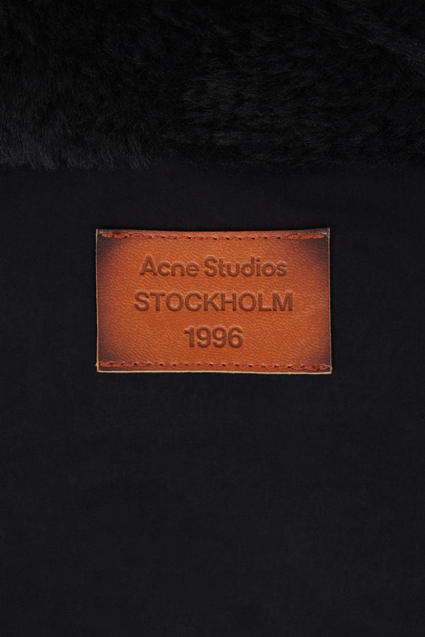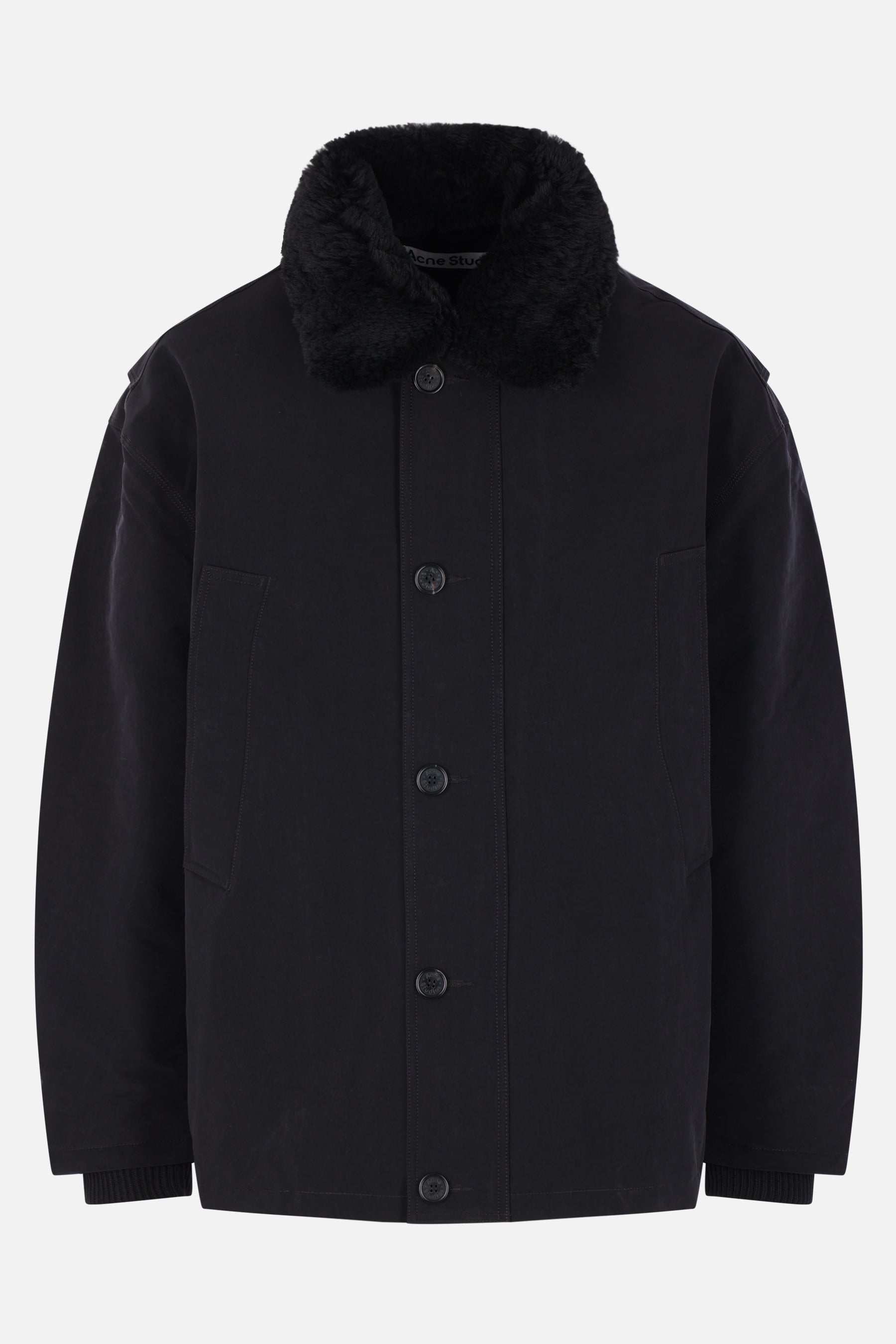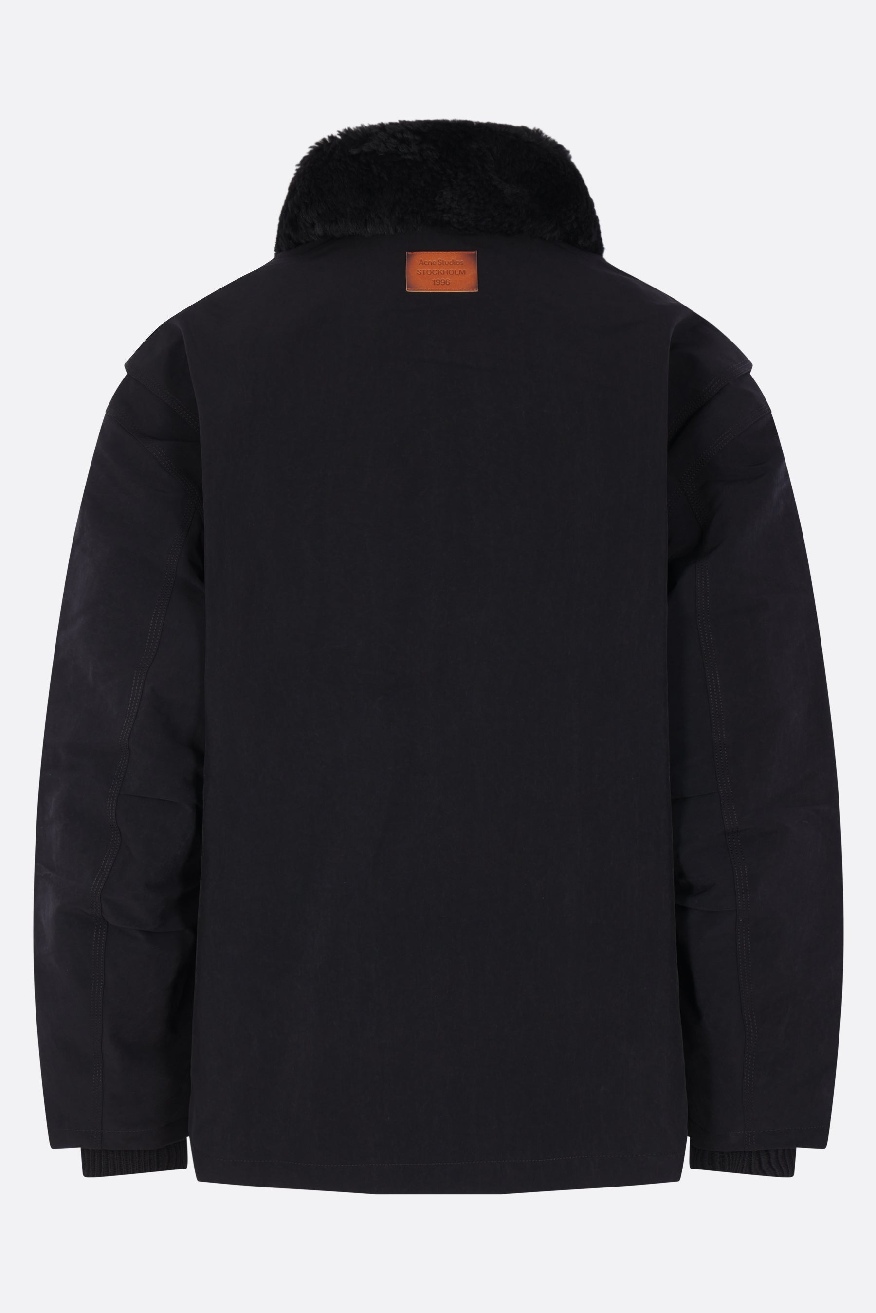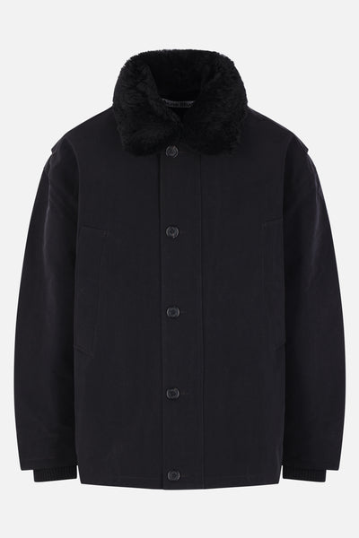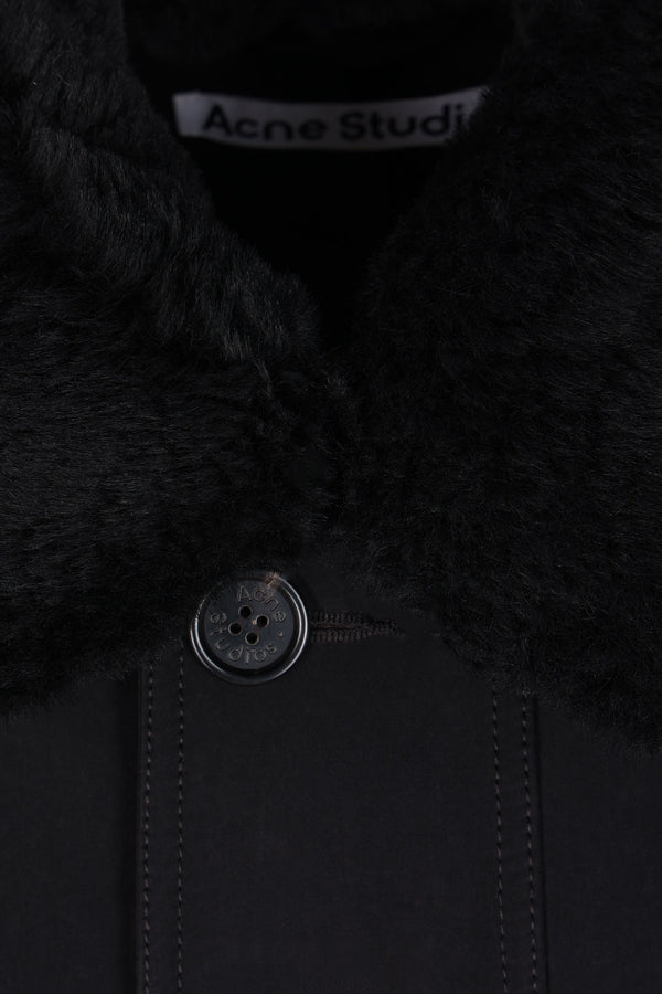 Acne Studios padded jacket crafted from black nylon. It features a pointed collar with a removable shearling trim, double-zip and button front closure, multiple pockets, long sleeves with ribbed cuffs, and a straight hem with quilted interior. Completed with a leather logo patch on the back of the collar.