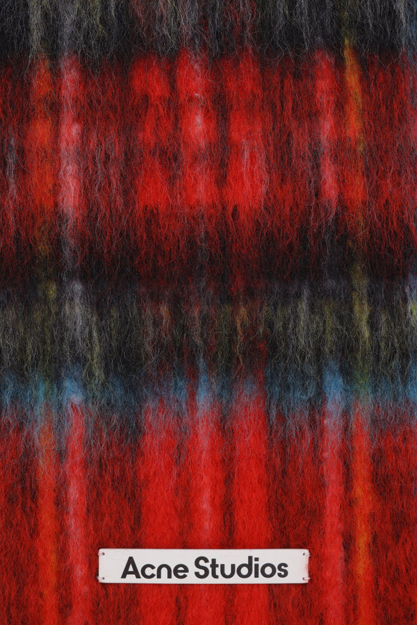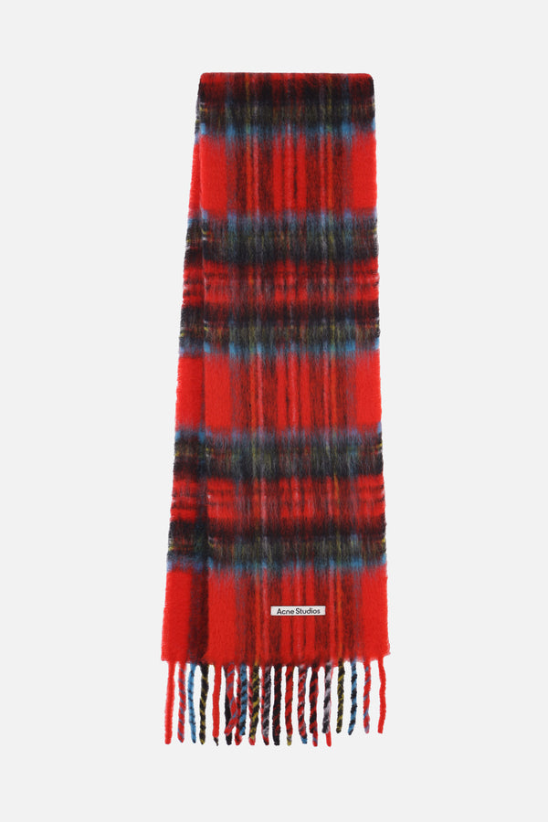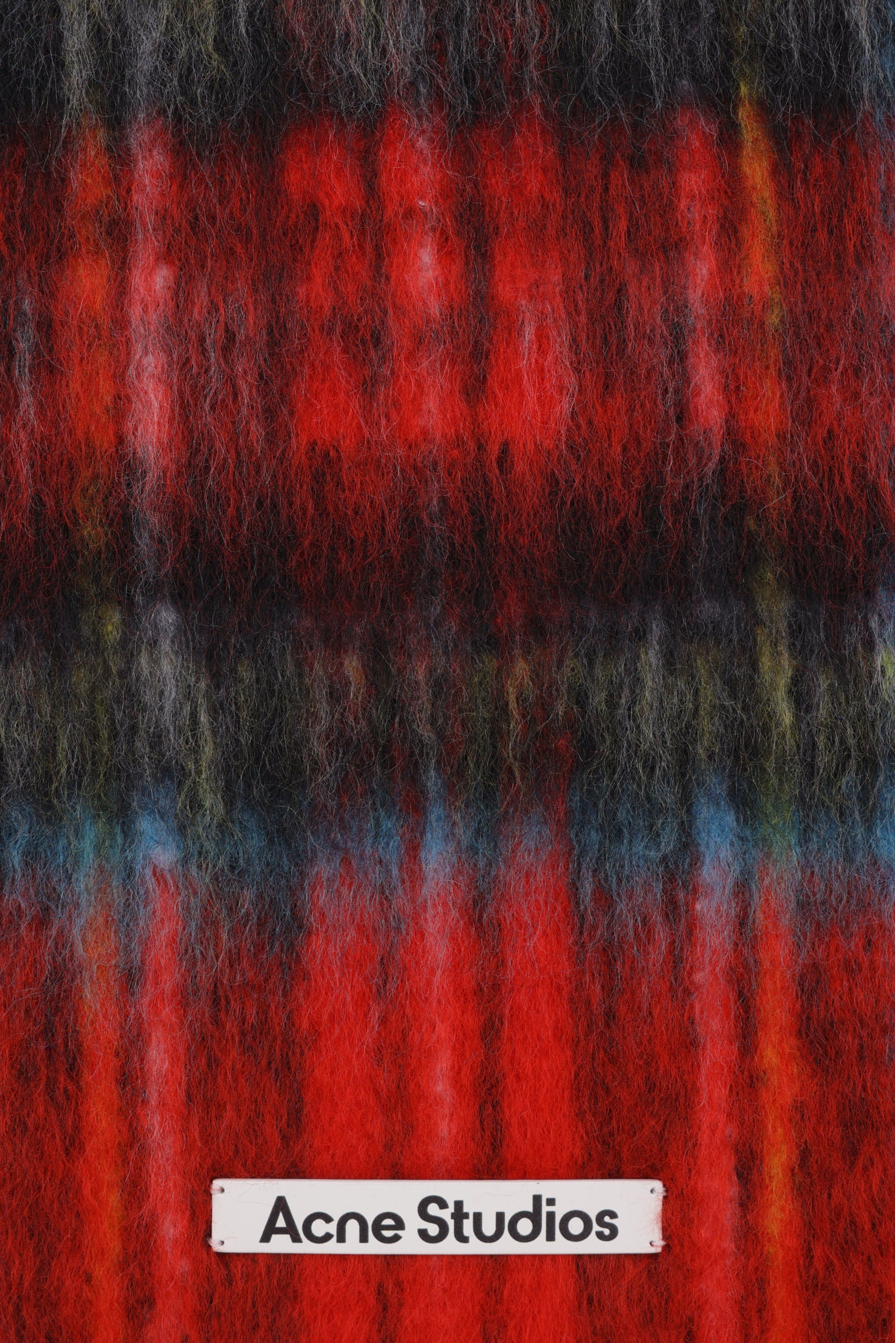 Acne Studios scarf crafted in multicolored checked mohair blend with a leather logo patch. Featuring fringed ends on both sides.