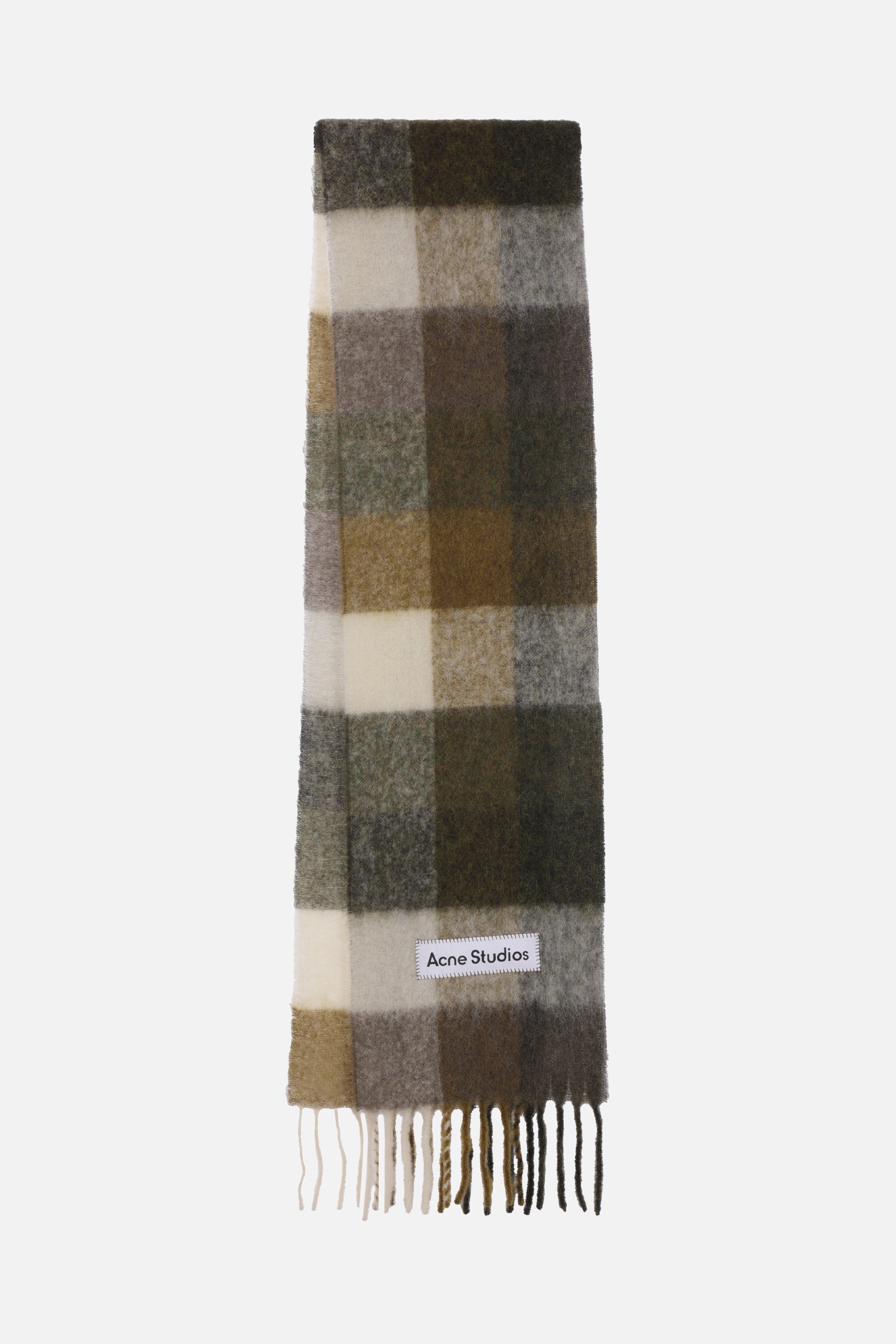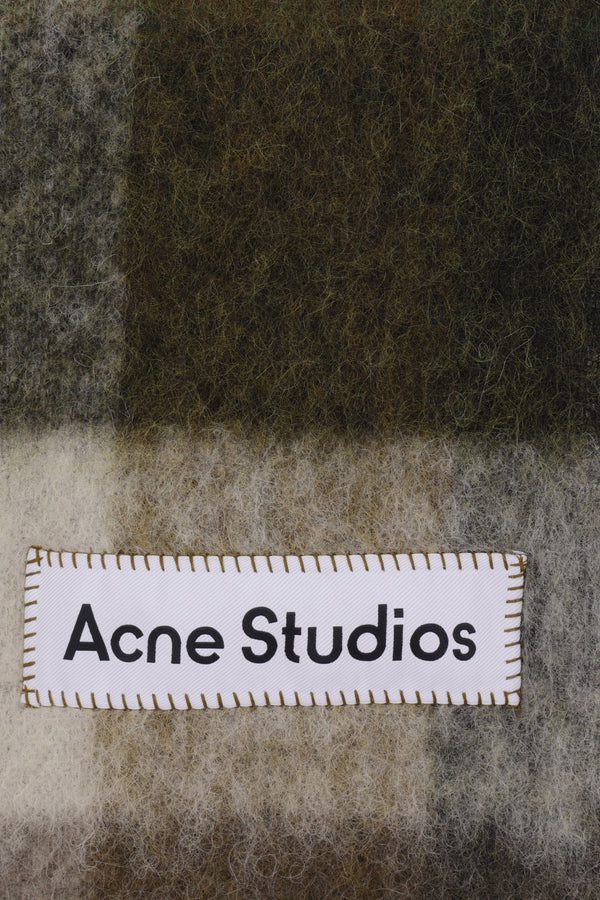 Acne Studios scarf crafted in multicolor checked alpaca wool blend with the iconic logo patch. Featuring fringing at both ends.