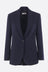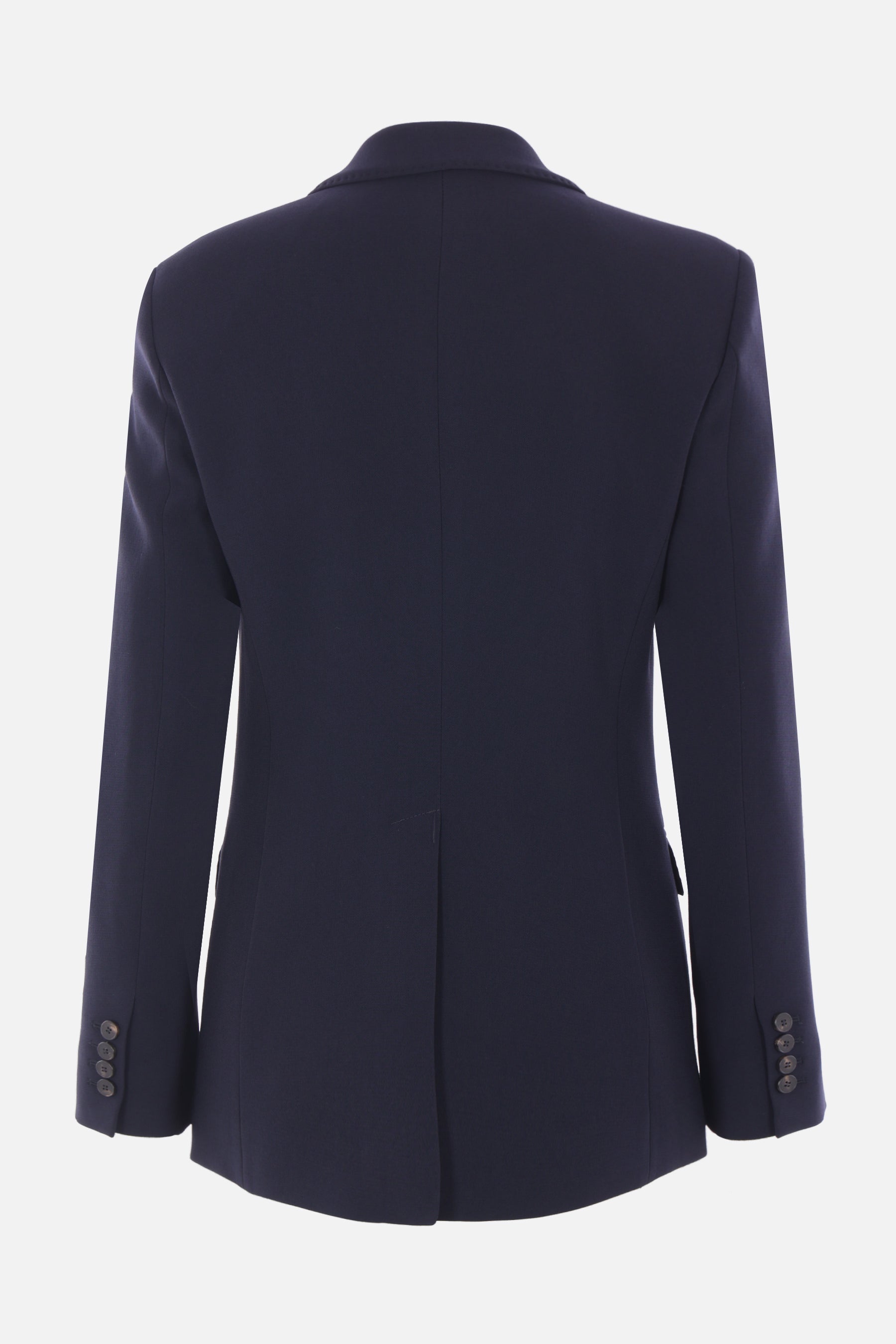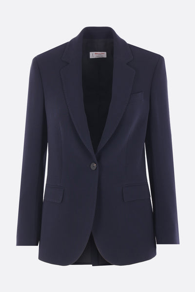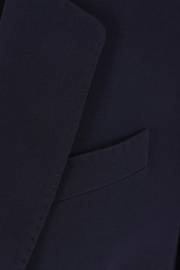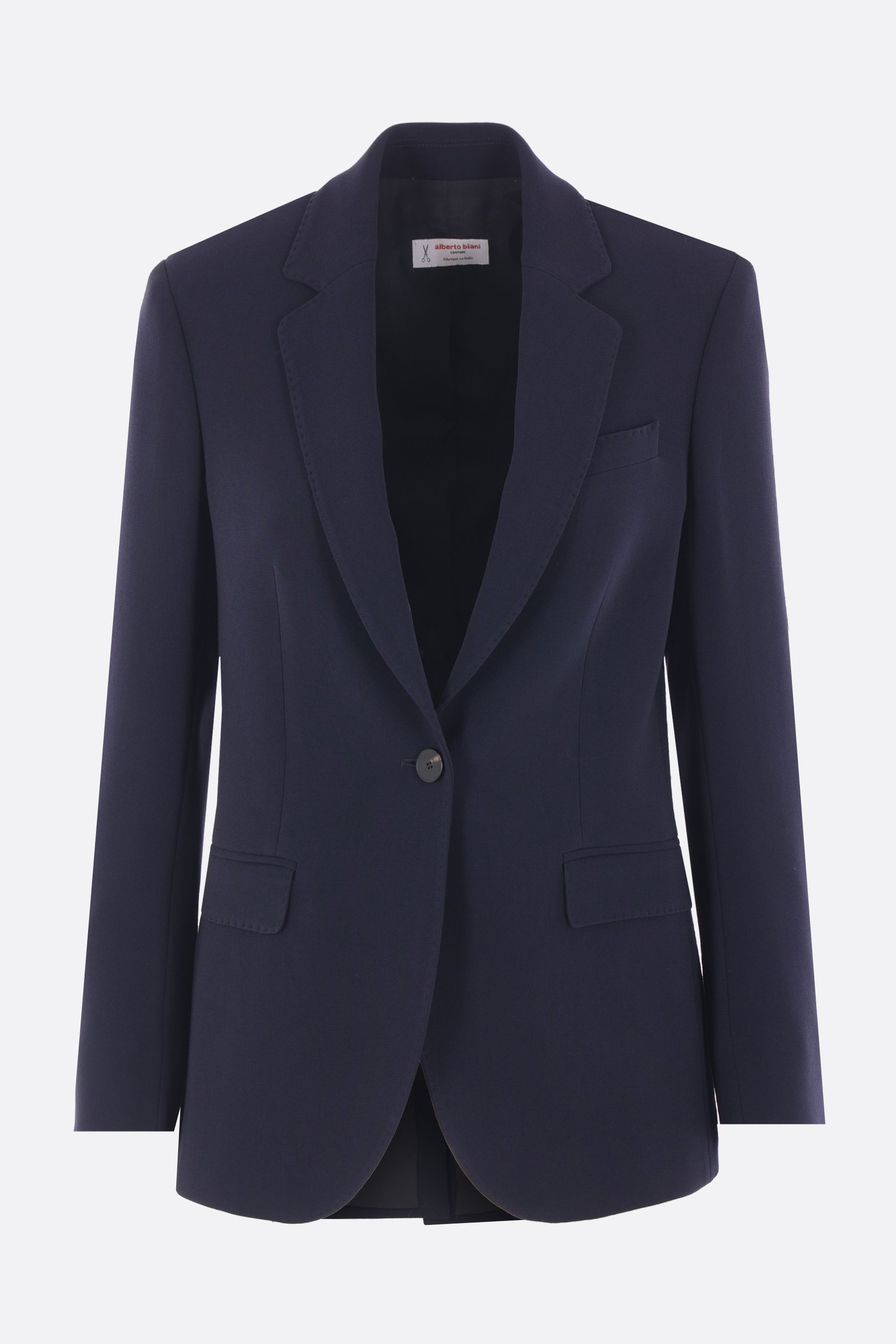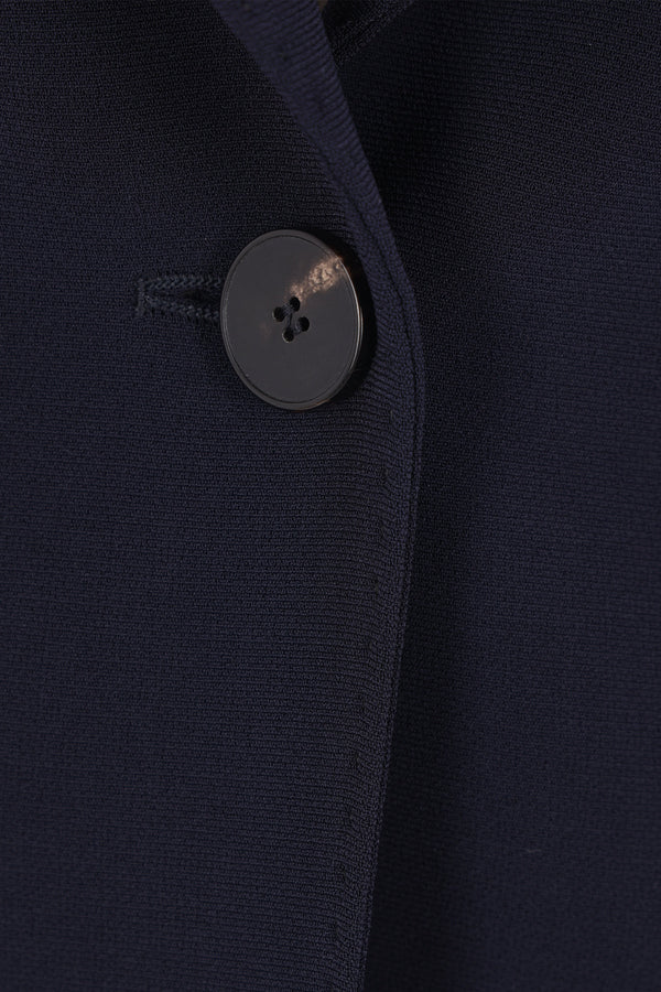 Alberto Biani single-breasted jacket crafted in blue cady fabric. Featuring classic lapels, single-button front closure, multiple pockets, structured shoulders, long sleeves with buttoned cuffs, and a back vent. Fully lined interior.
