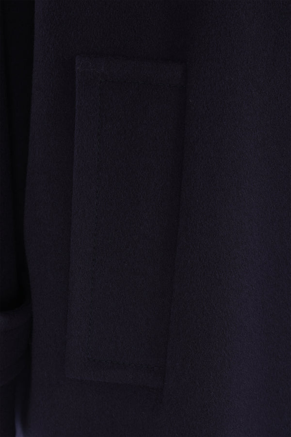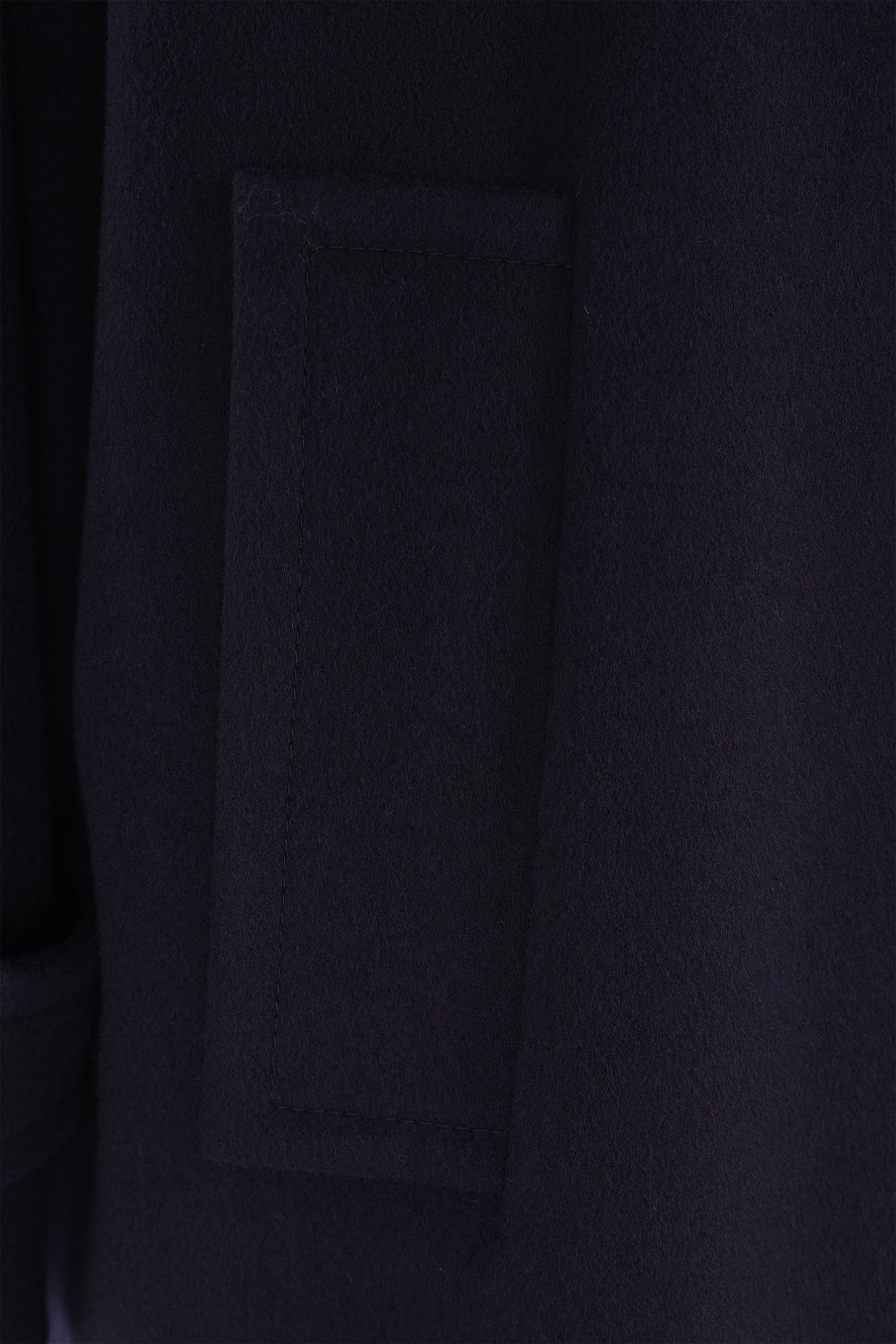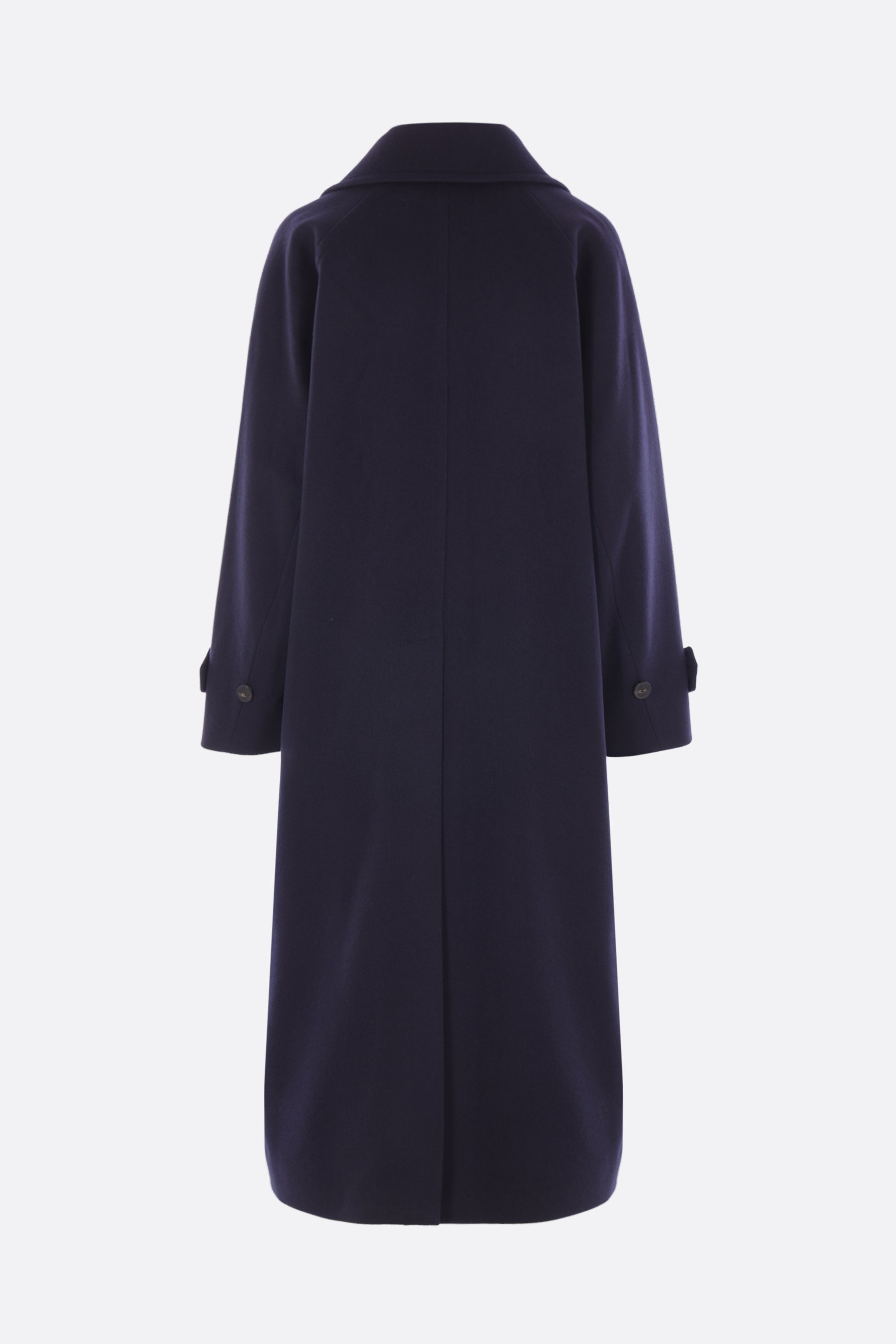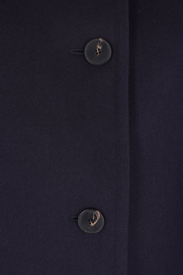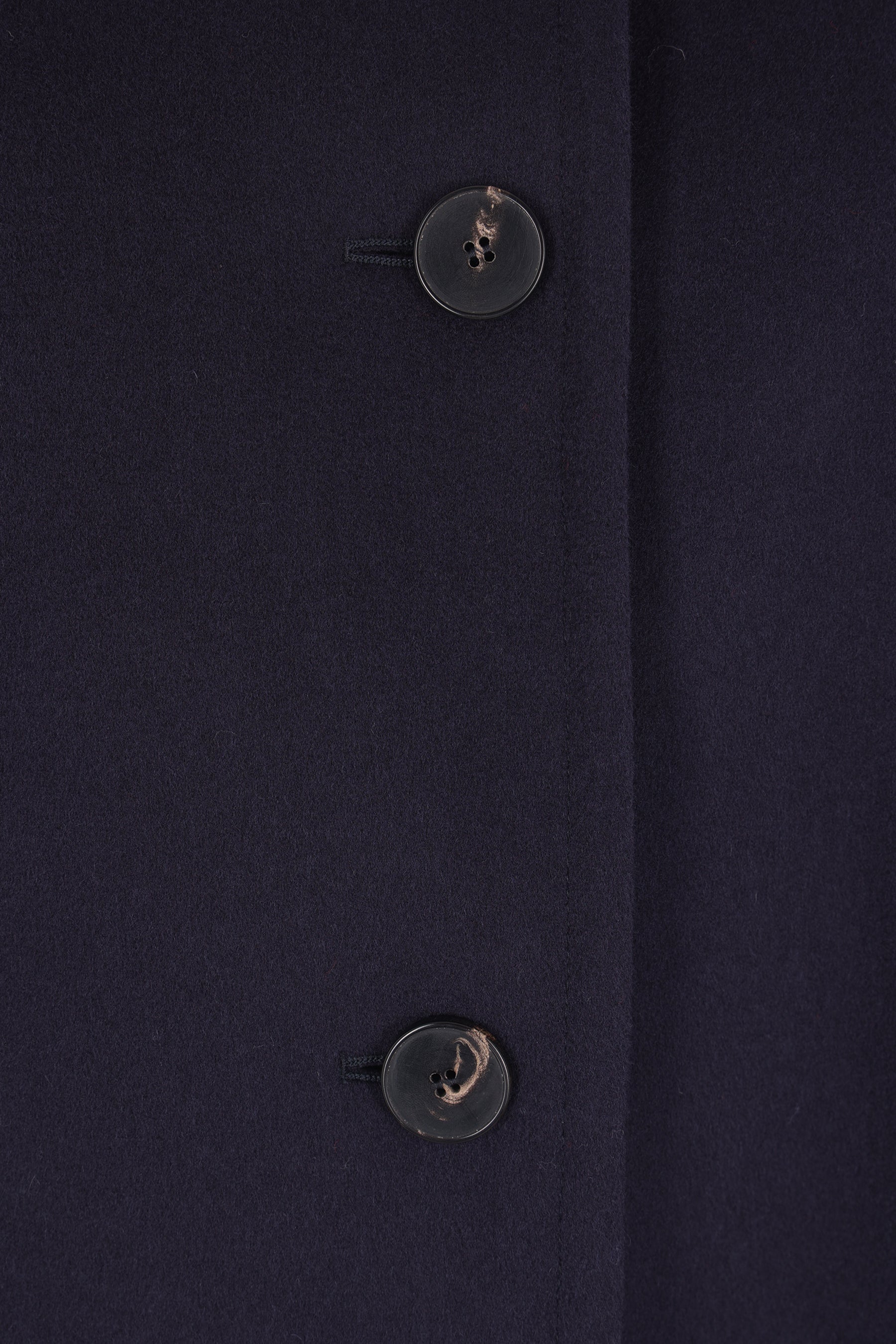 Alberto Biani single-breasted coat crafted from blue wool cloth. Featuring pointed collar, front button closure, welt pockets, long raglan sleeves with cuff straps, central back vent, and fully lined interior.