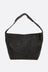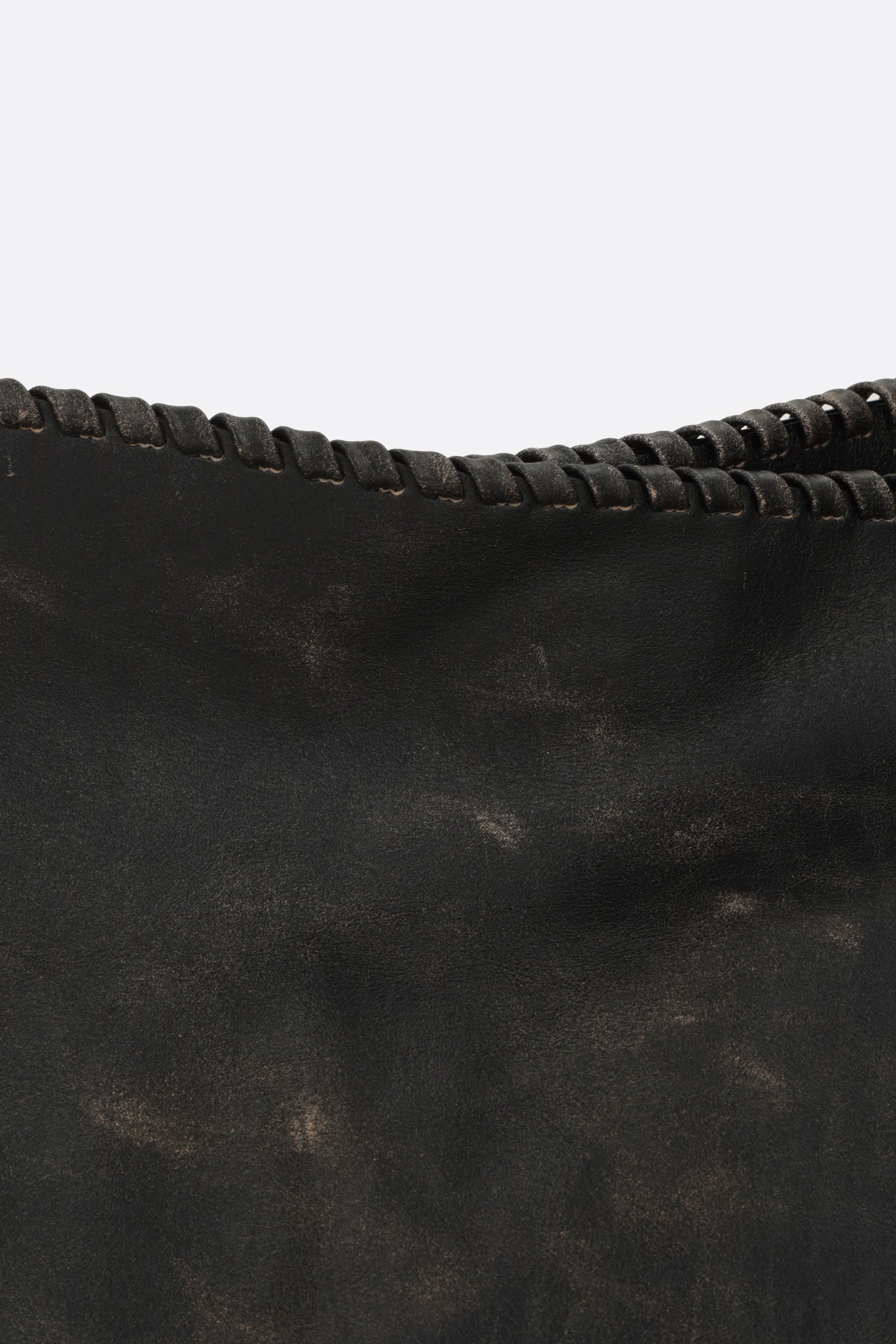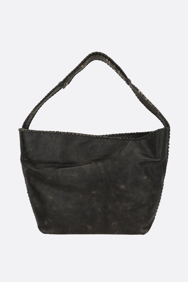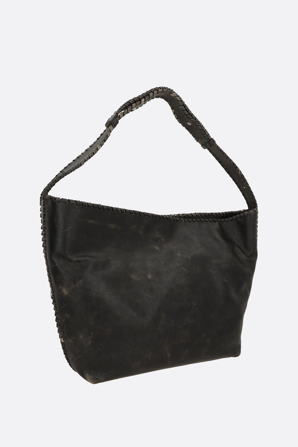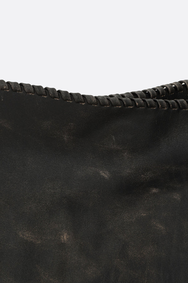 Ann Demeulemeester shoulder bag crafted from black leather with a vintage finish and decorative whipstitch along the edges. Featuring silver-tone hardware, an interior magnetic button closure, and an adjustable shoulder strap. The black canvas-lined interior includes a flat pocket and a matching pouch. The design is completed by the distinctive embossed logo lettering on the front.