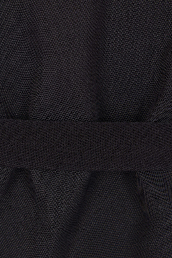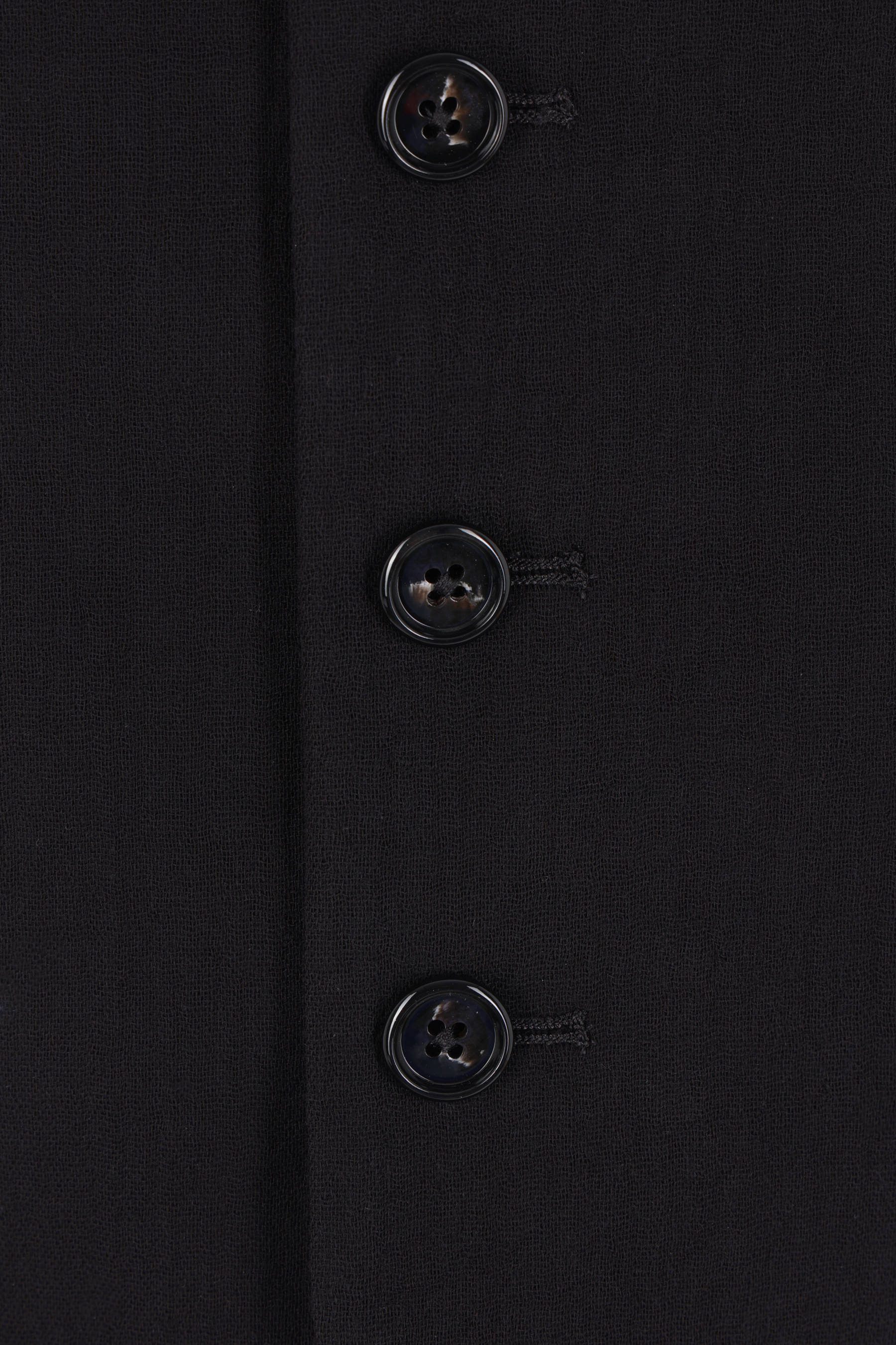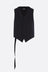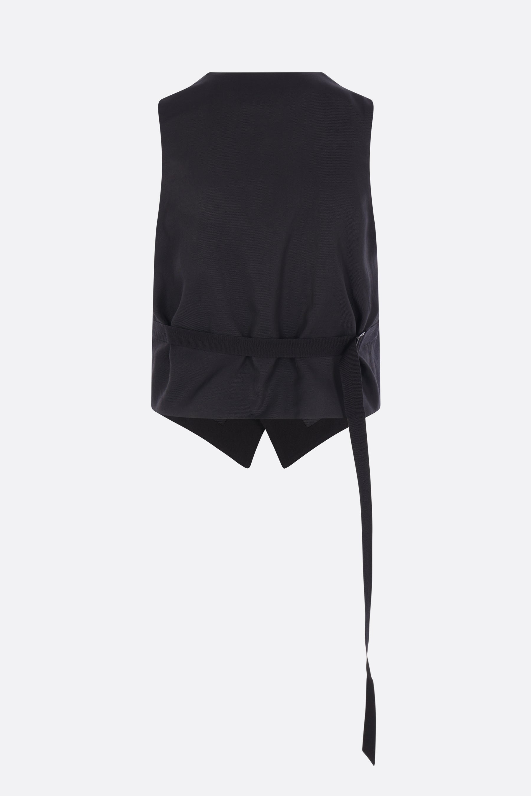 Ann Demeulemeester single-breasted vest crafted from black double cotton gauze. Features a V-neckline, front button closure, twill back panel, and an adjustable strap with metal buckle. Fully lined interior.