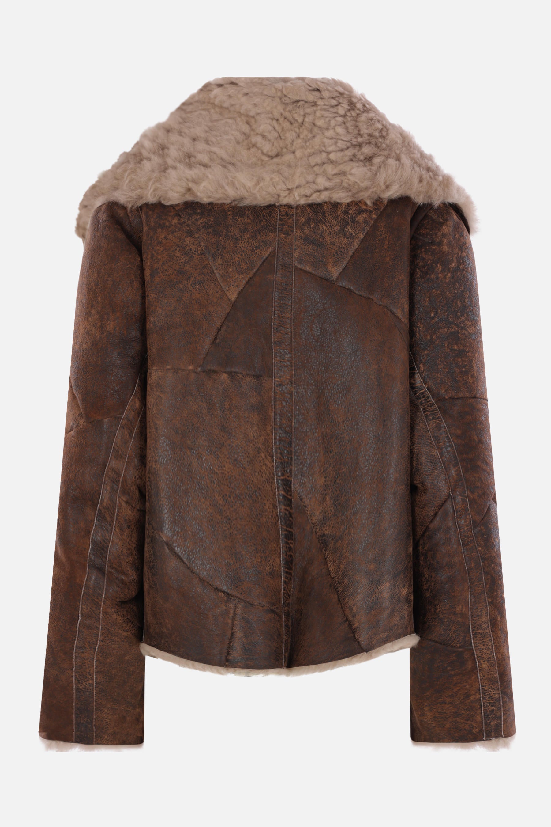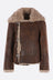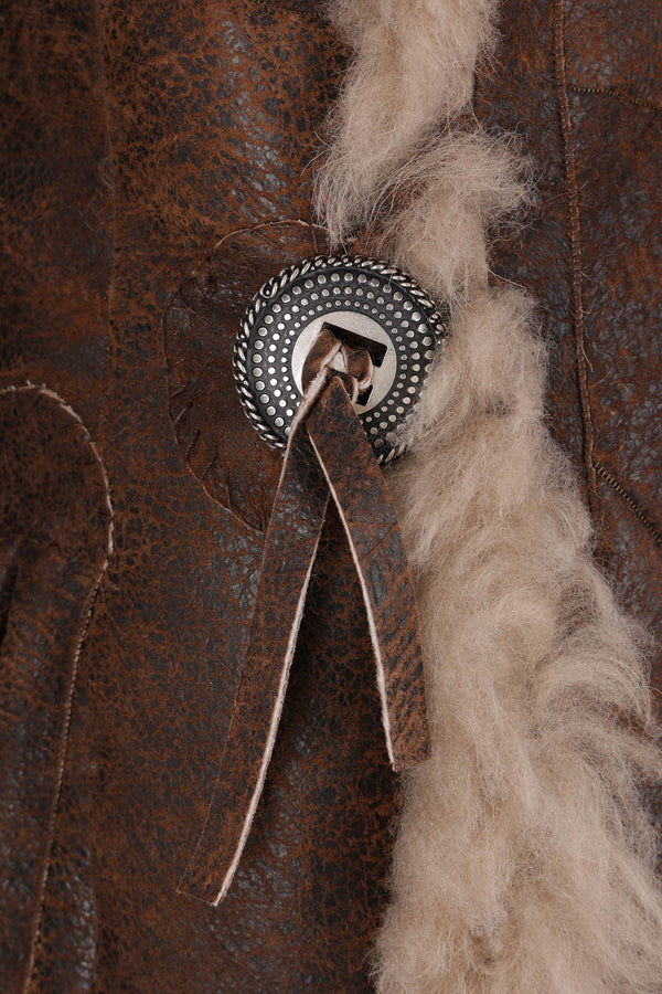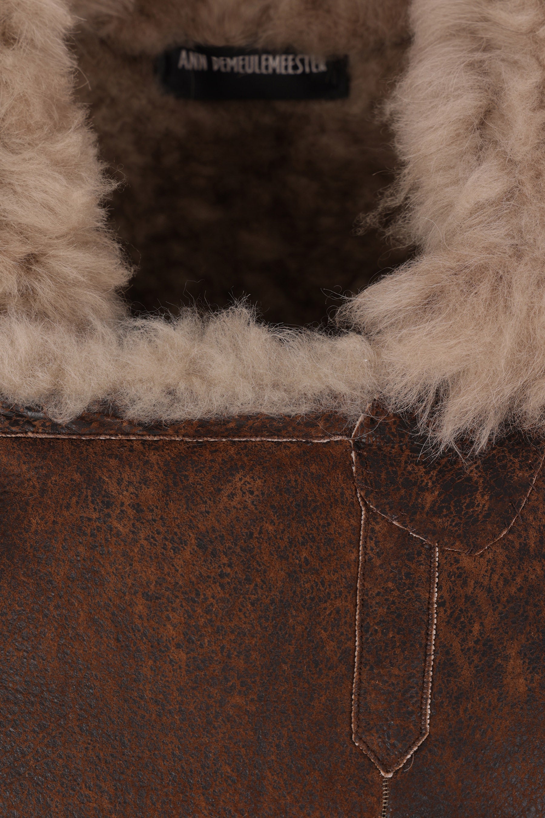 Ann Demeulemeester jacket crafted from brown shearling with taupe shearling lining and trims. Features wide lapels, an asymmetric metallic button closure, double-welt pockets, long sleeves, and a straight hem.