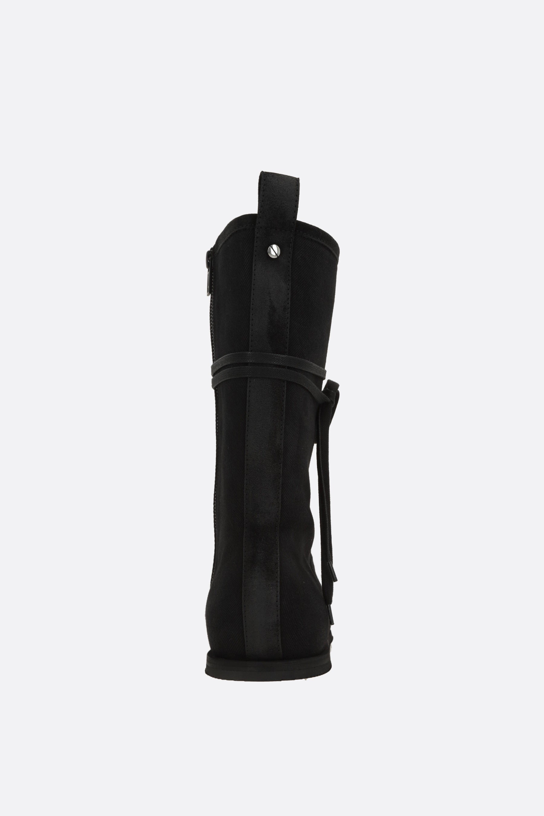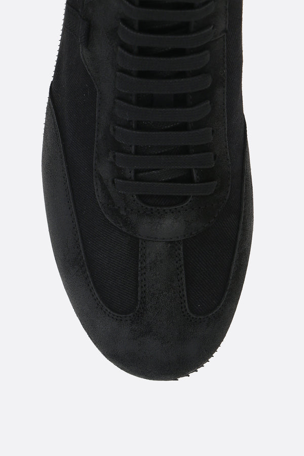 Ann Demeulemeester high-top sneakers crafted from black denim with vintage-effect suede details. They feature a side zip closure, front laces, a round toe, leather lining, and a rubber sole. The design is completed with a logo patch on the tongue and a grosgrain side tape.