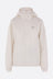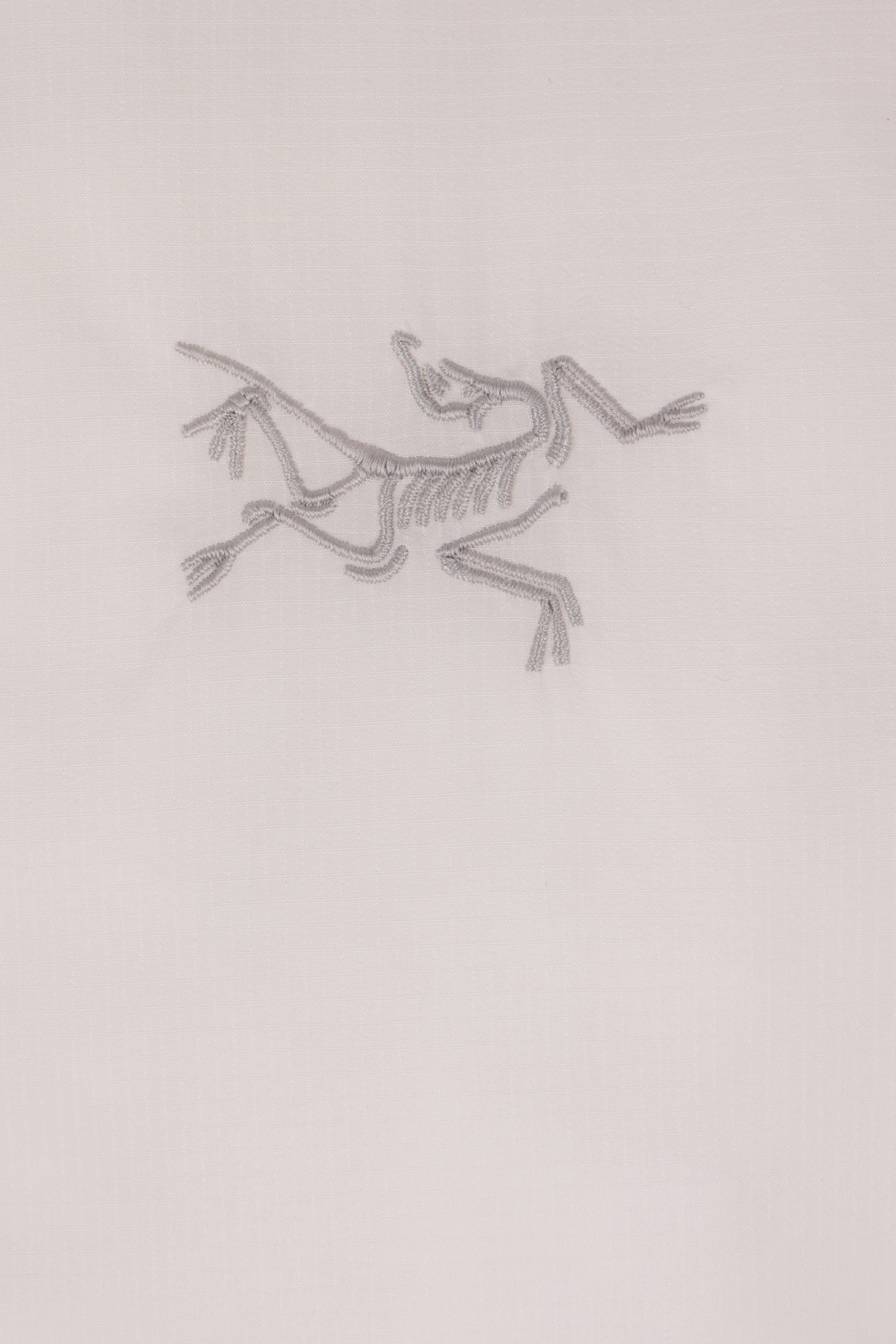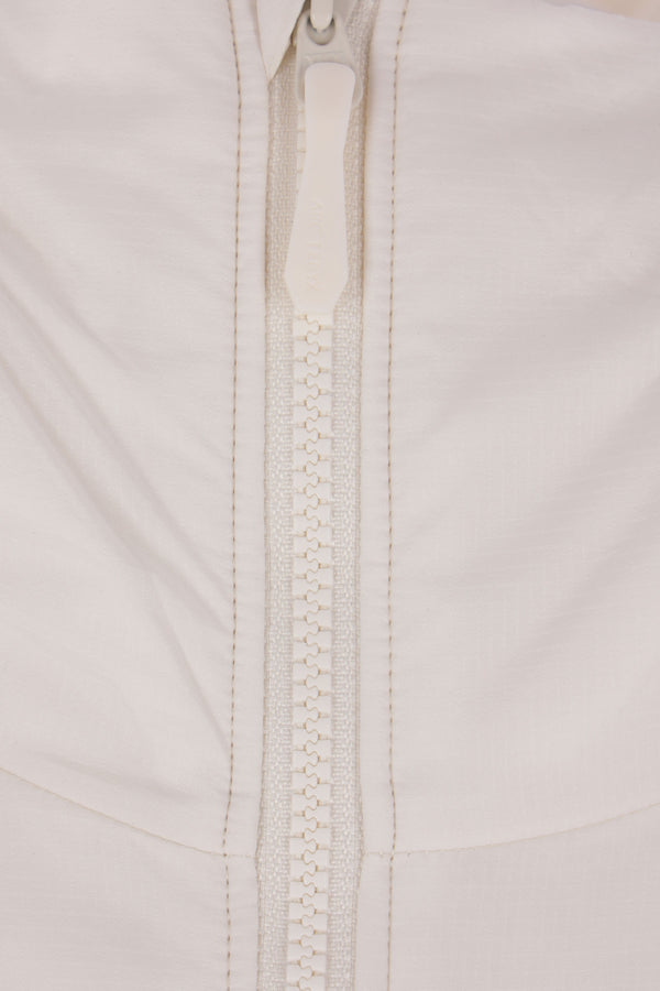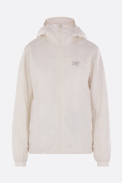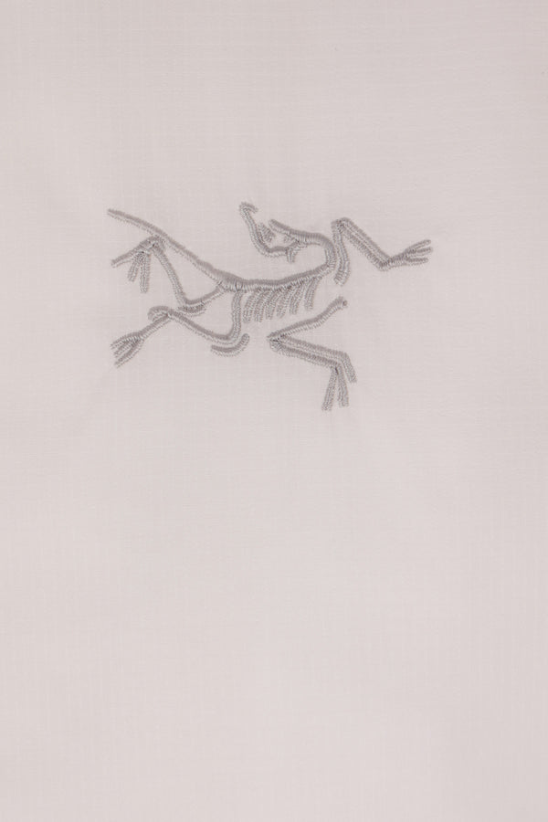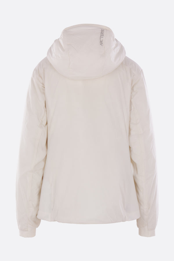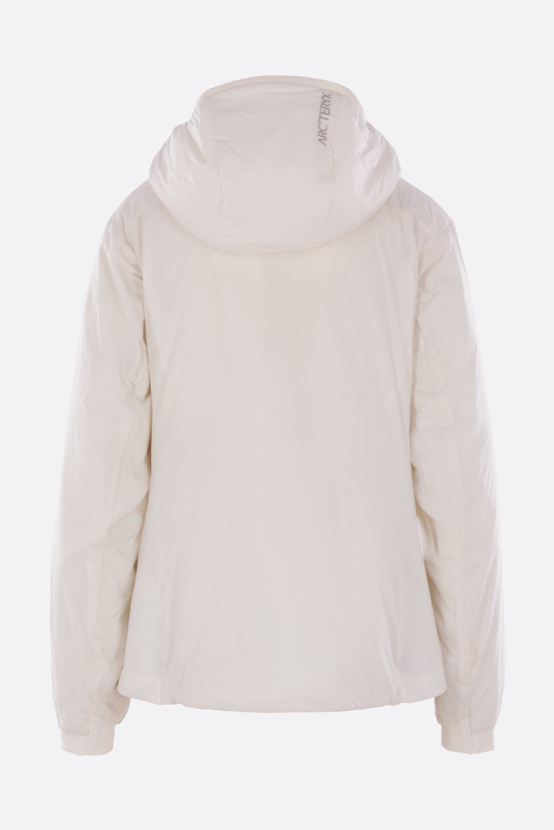 Arc'teryx padded jacket made of ivory nylon with embroidered logo on the chest. It features a high collar, hood with contrasting embroidered logo, front zip closure, side pockets, long sleeves with elasticated cuffs, and a rounded hem with drawstring. Fully lined interior.