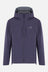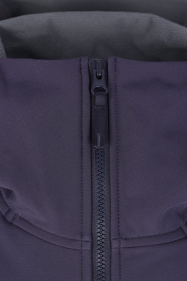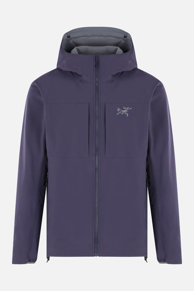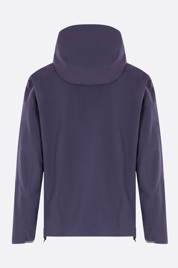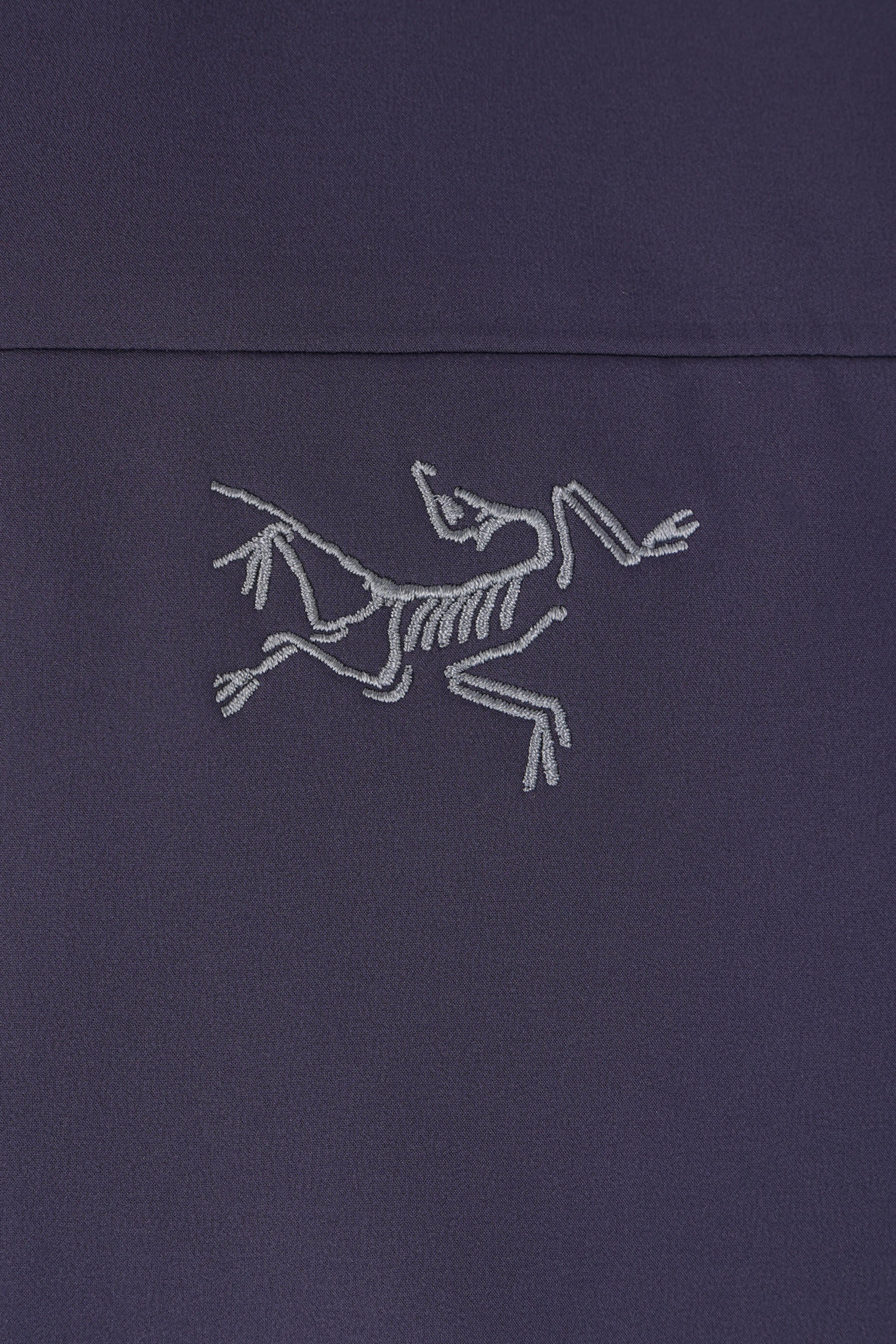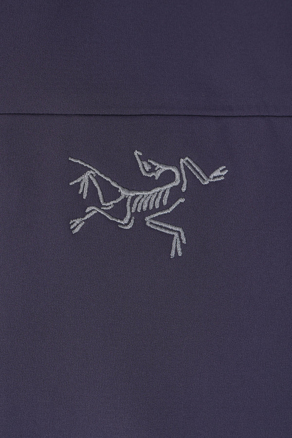 Arc'teryx made of dark blue stretch nylon with embroidered logo on the chest. It features a high collar, hood with visor and drawstring, zip closure, multiple pockets, long sleeves with elasticated cuffs, and a rounded hem with drawstring. The interior is lined in fleece.