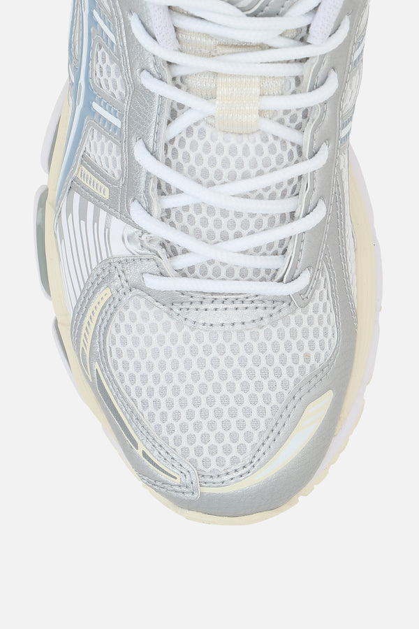 Asics low-top sneakers crafted in white mesh and silver-tone laminated faux leather. Featuring lace-up closure, a round-toe silhouette, fabric lining, GEL inserts in the heel and forefoot and textured rubber sole. The design is completed by the iconic logo patch on tongue.