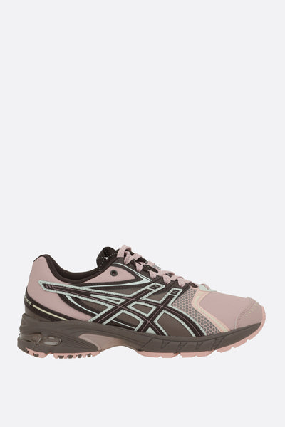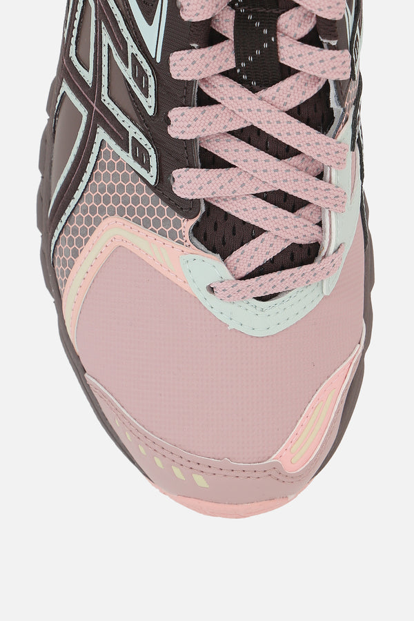 Asics low-top sneakers crafted from brown mesh and pink faux leather. Features a lace-up closure, round toe, fabric lining, GEL inserts on the heel, and a textured rubber sole. The design is completed with the iconic logo patch on the tongue.