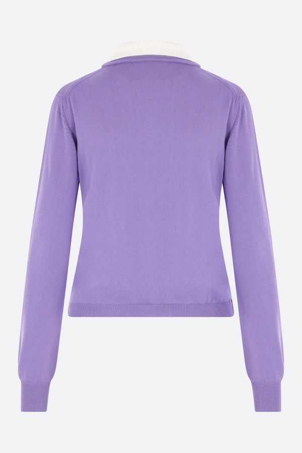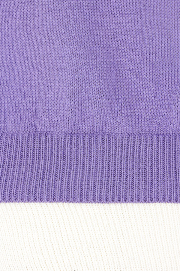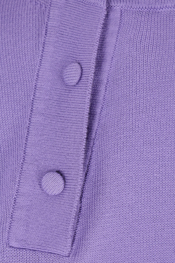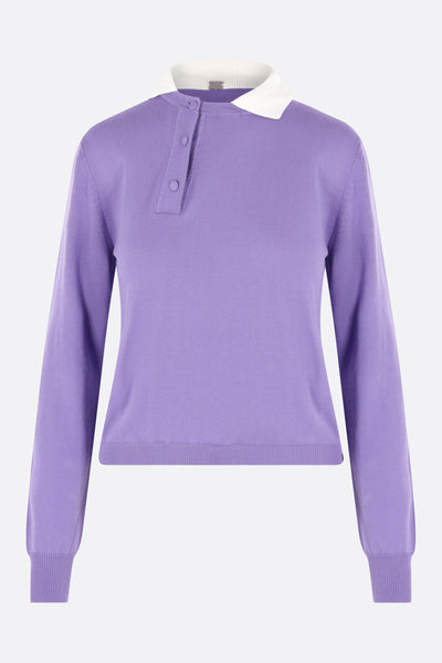 August Barron asymmetric polo shirt crafted from lavender cotton knit. Featuring a deconstructed collar, front closure with covered buttons, long sleeves, and an asymmetric double-layered hem.