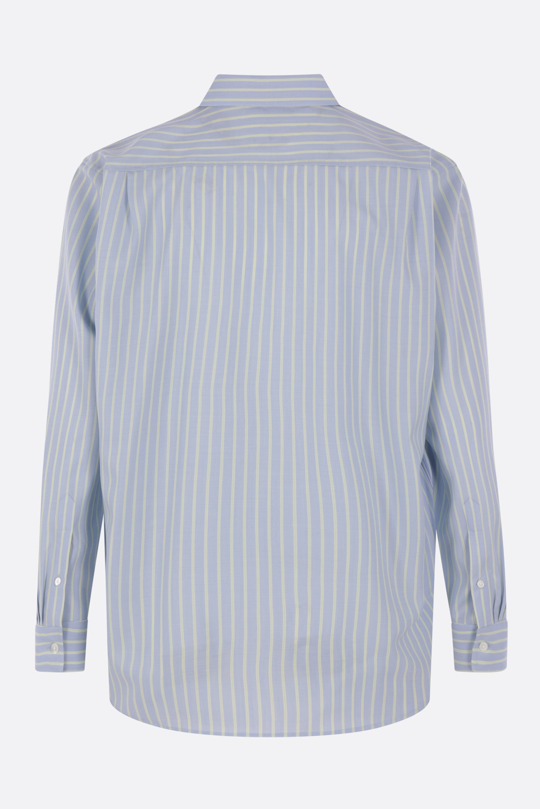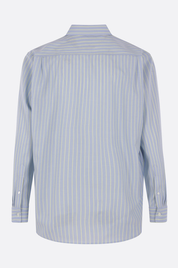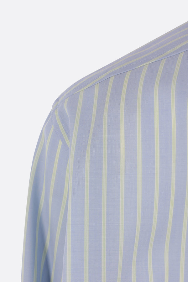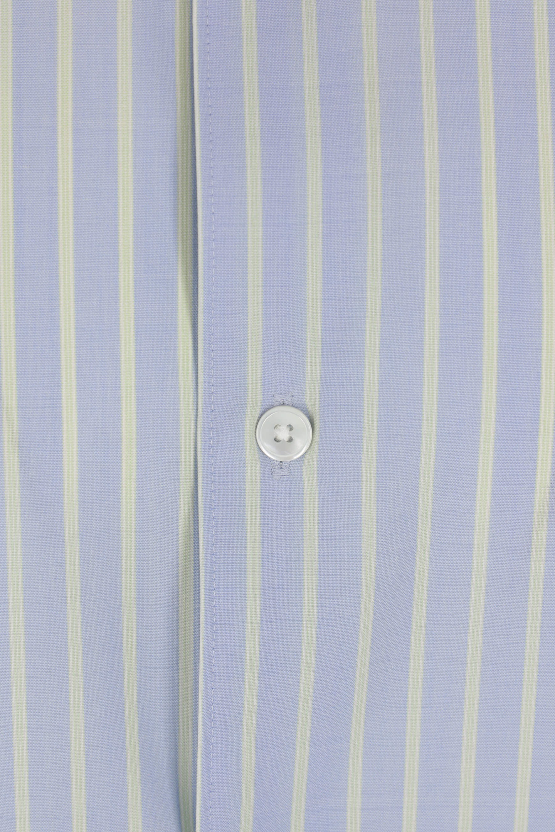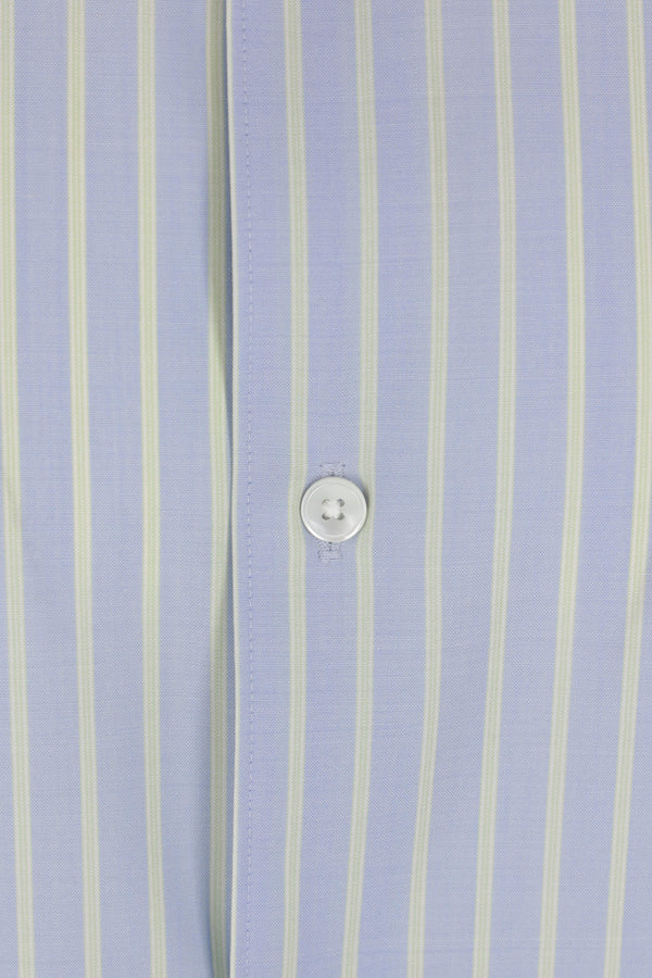 Auralee shirt crafted from super fine wool with a striped pattern in light blue and lime green tones. Featuring a classic collar, front button closure, long sleeves with buttoned cuffs, and a rounded hem.