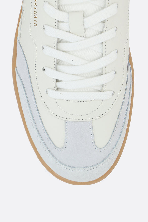 Axel Arigato low-top sneakes crafted from smooth white leather and light grey suede with perforated detailing. Featuring lace-up closure, round toe, fabric lining, and a recycled rubber sole. The design is completed with a contrasting heel tab with embossed logo and a branded nylon tongue label.