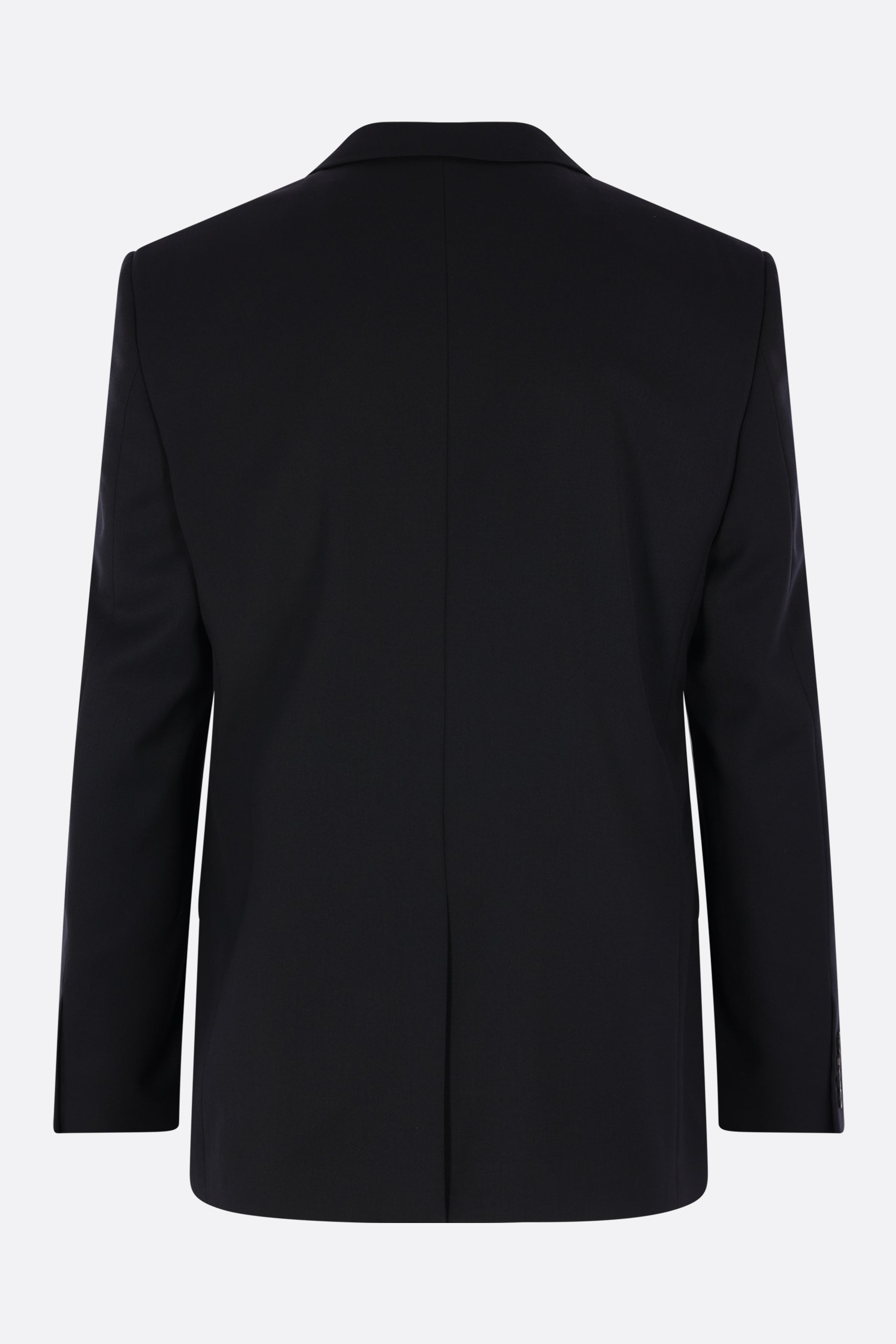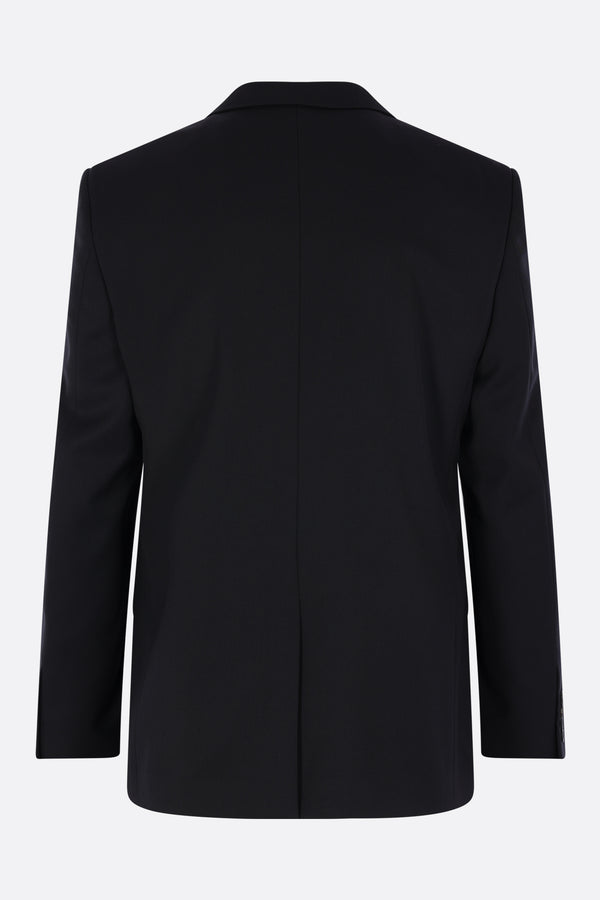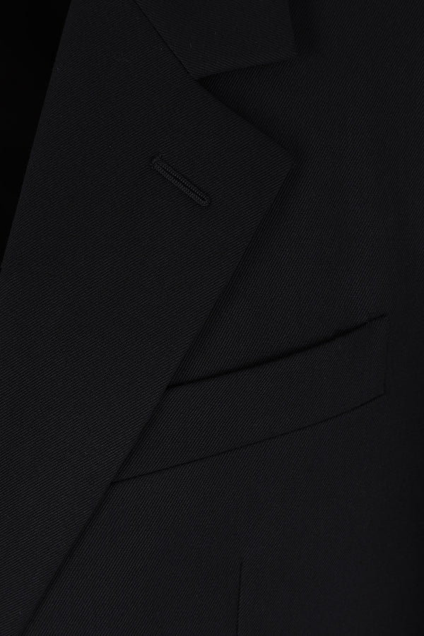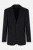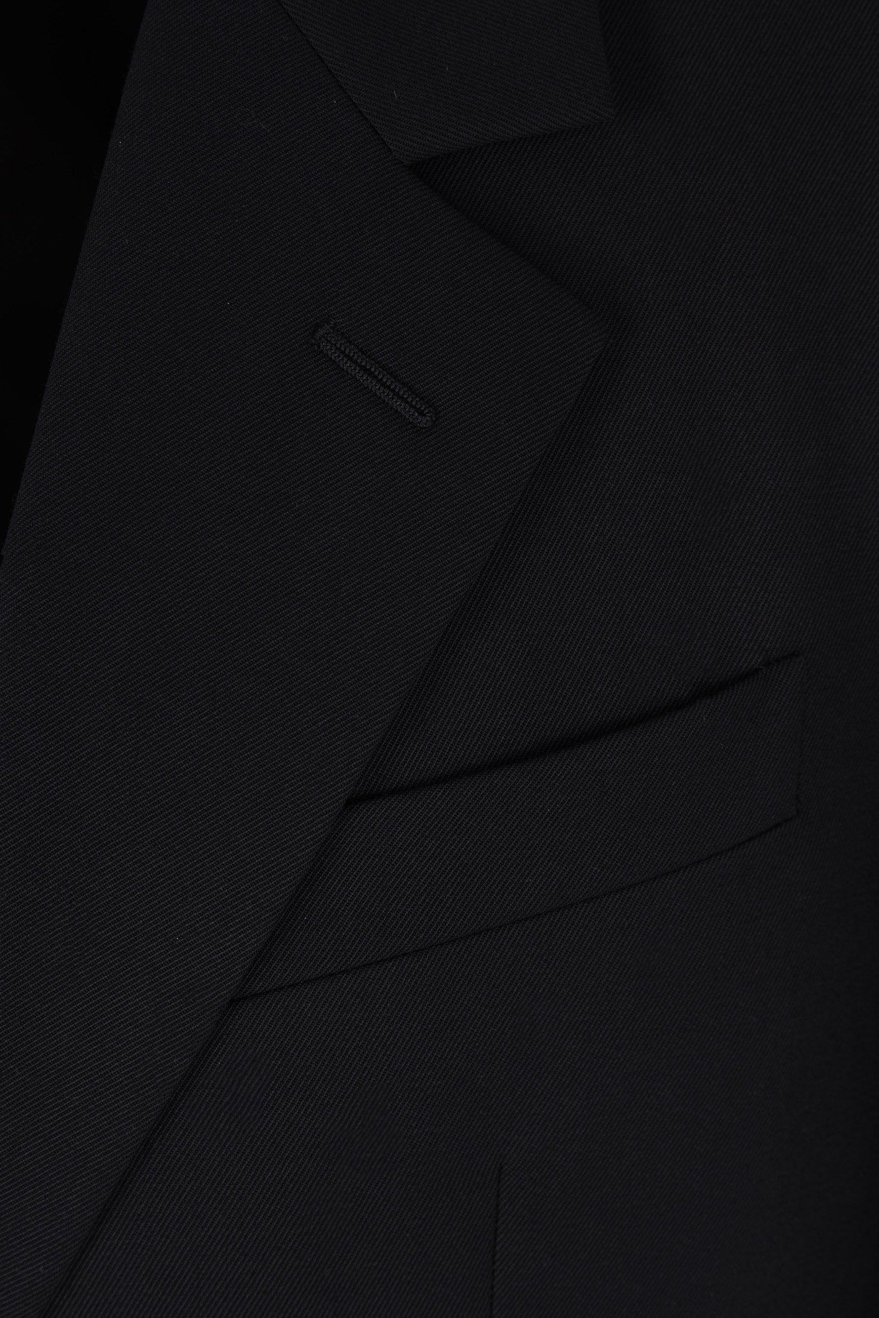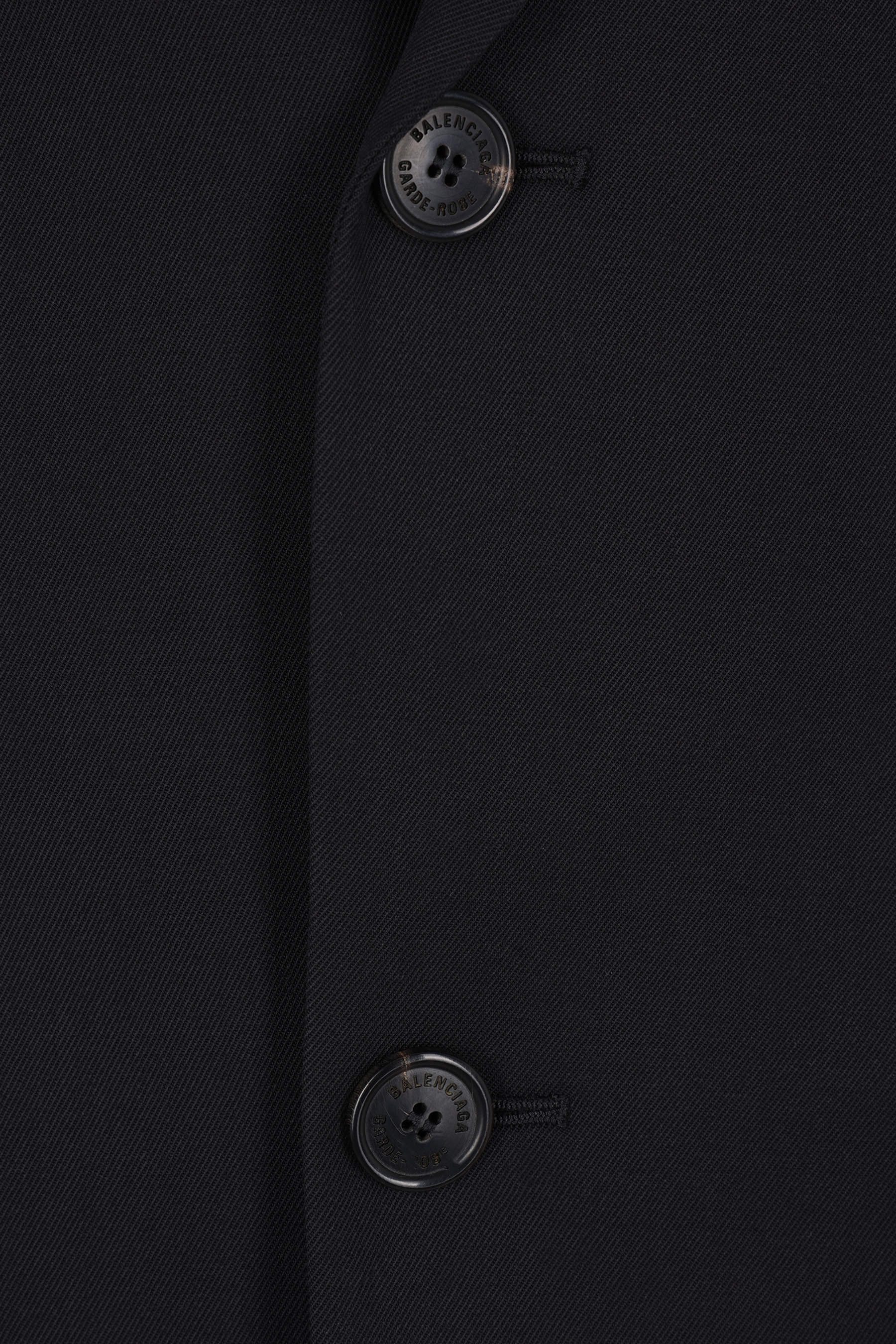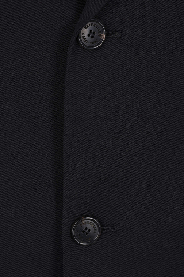 Balenciaga single-breasted jacket made of black wool. It features classic lapels, front button closure, padded shoulders, long sleeves with buttoned cuffs, multiple pockets, and a central back vent. Fully lined interior.