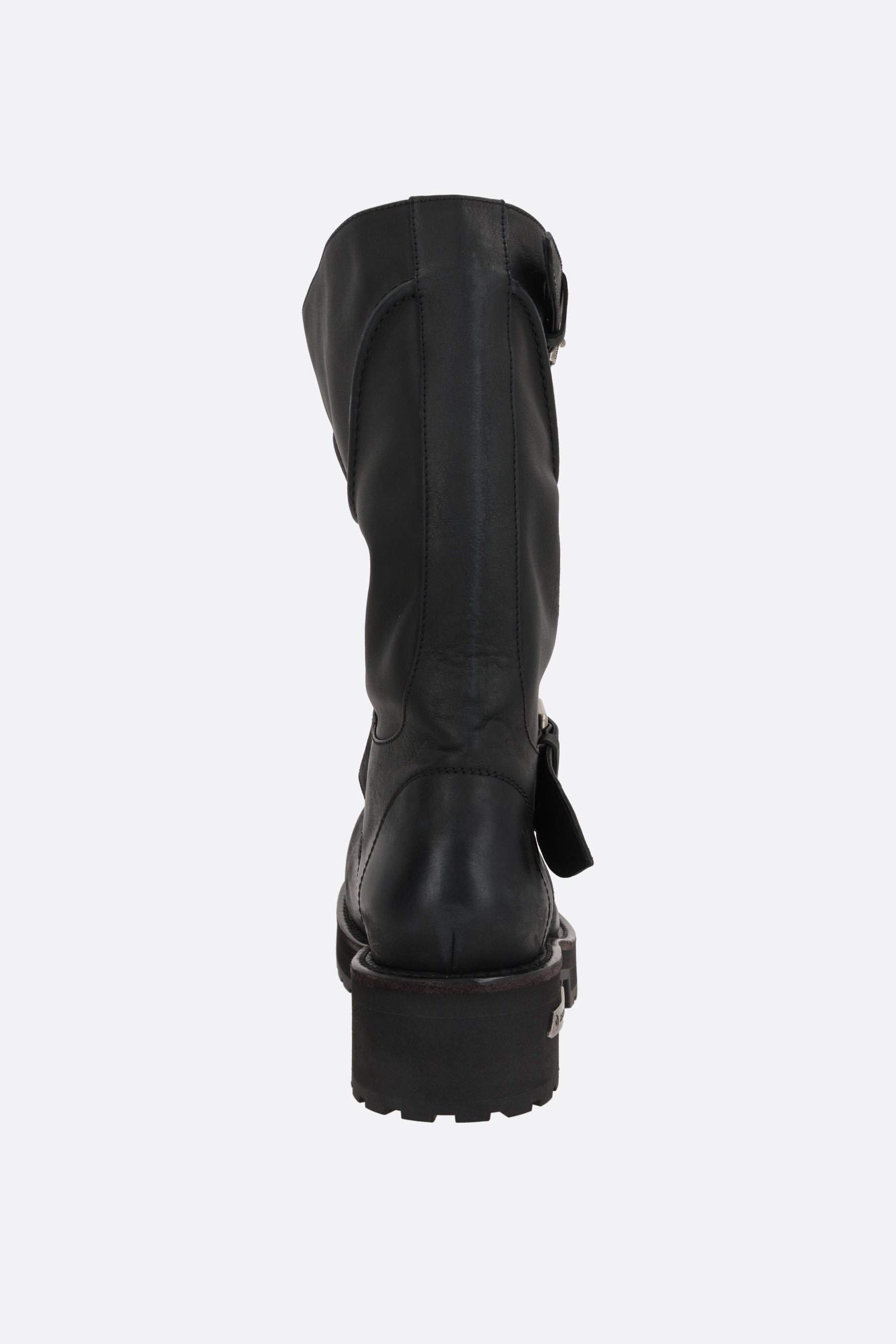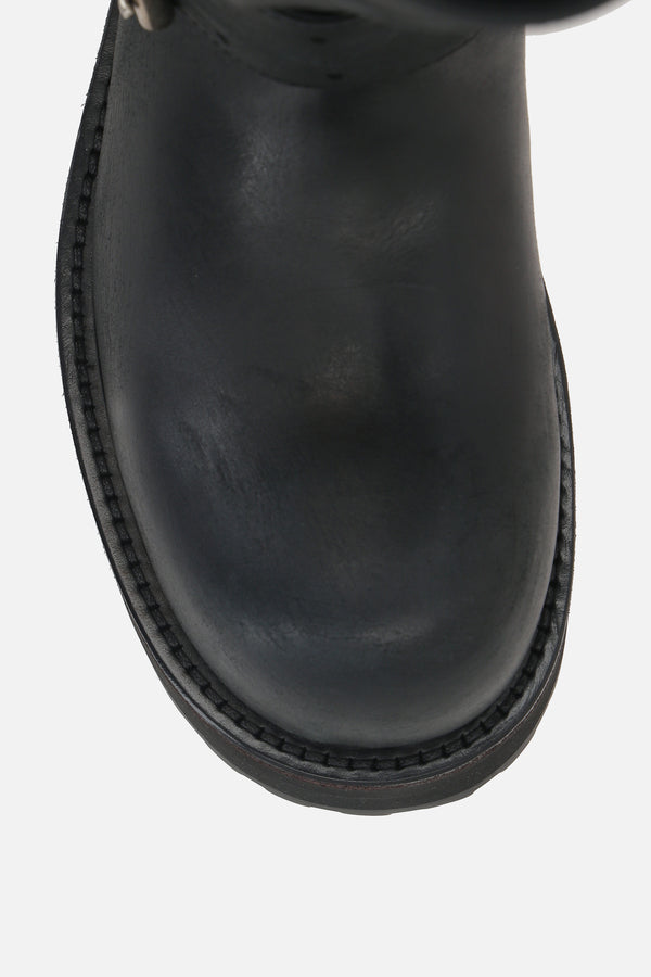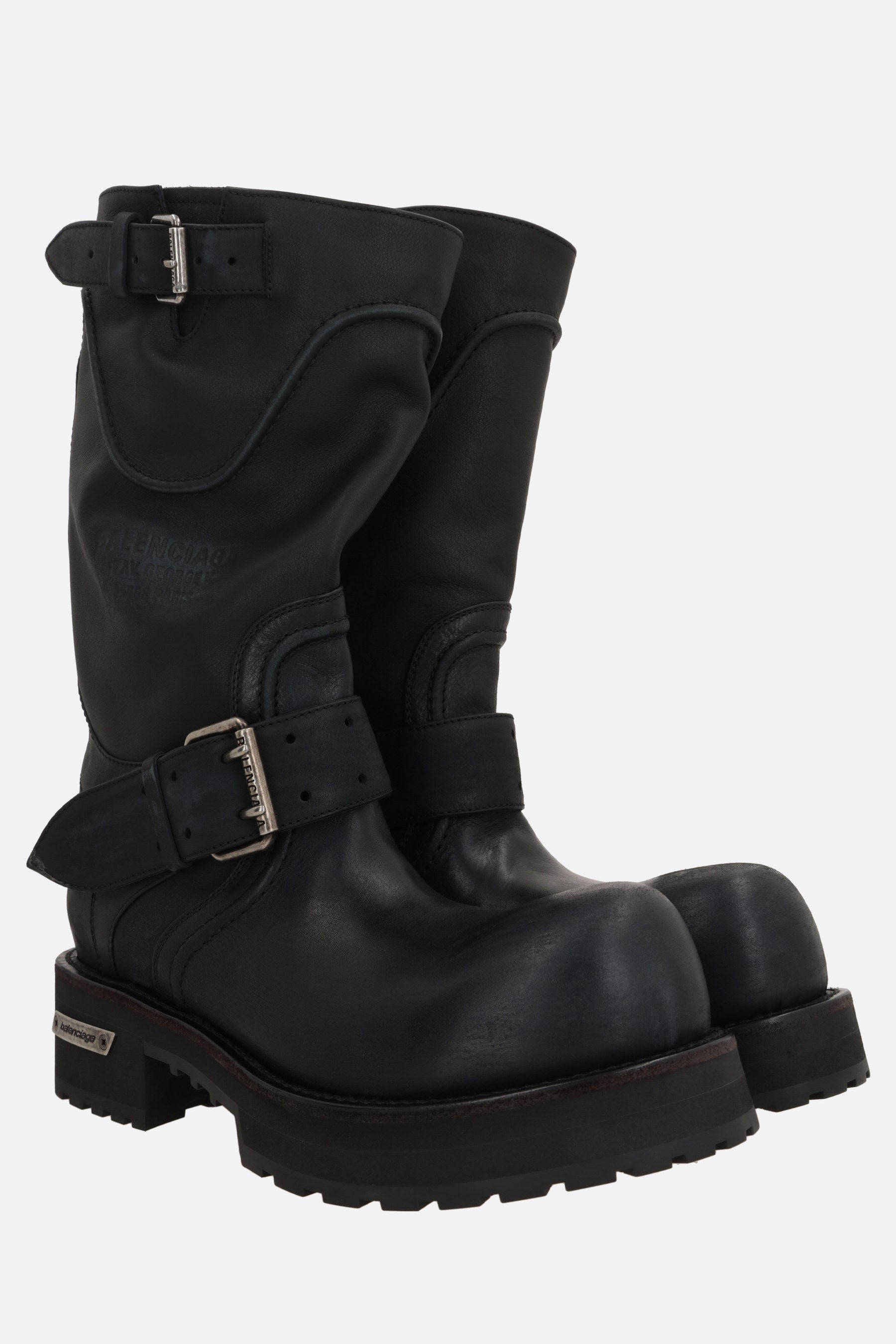 Balenciaga boot crafted from black smooth leather with a distressed finish. Featuring an ultra-round toe, adjustable belt‑buckle straps, leather lining, and a thick ridged rubber sole with an engraved Balenciaga logo plaque. The design is completed with an embossed Balenciaga logo and “10 AV George V 75008 Paris” debossed on the upper.