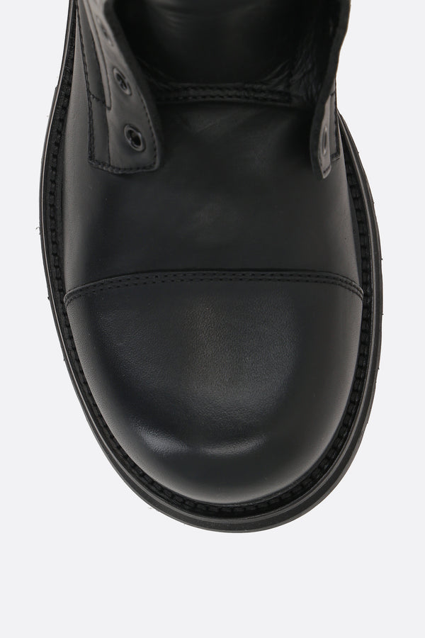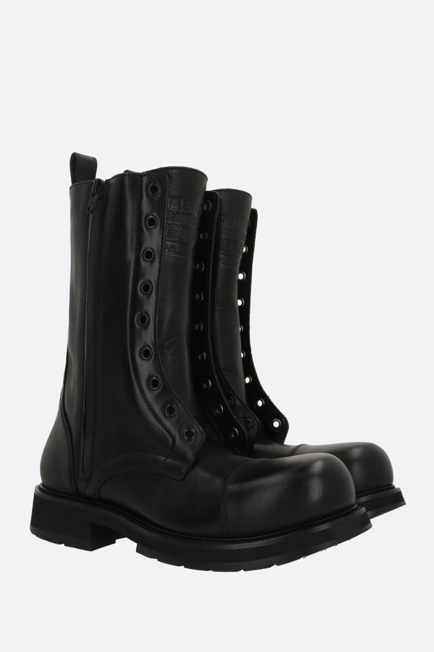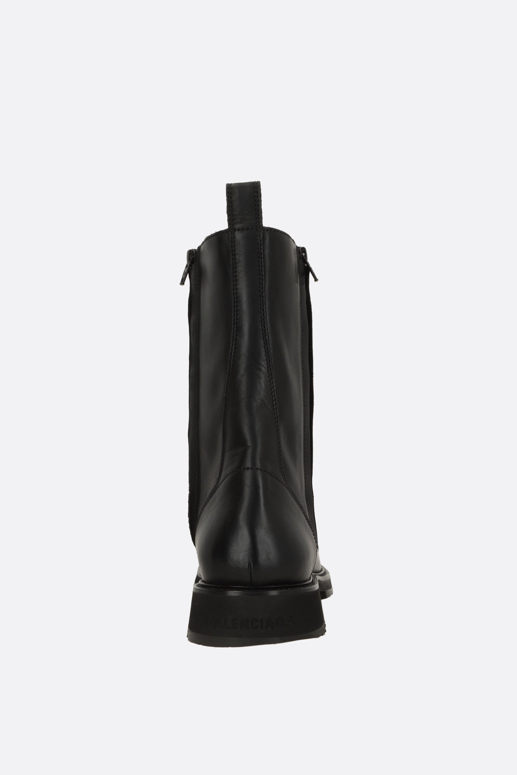 Balenciaga combat boots crafted from black smooth leather with Balenciaga and 10 AV George V Paris logo embossed on the tongue. Features a side zip closure, round toe, leather lining, and a rubber sole. Designed to be worn with or without laces.