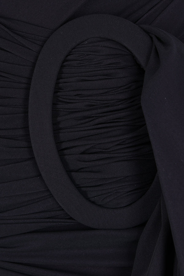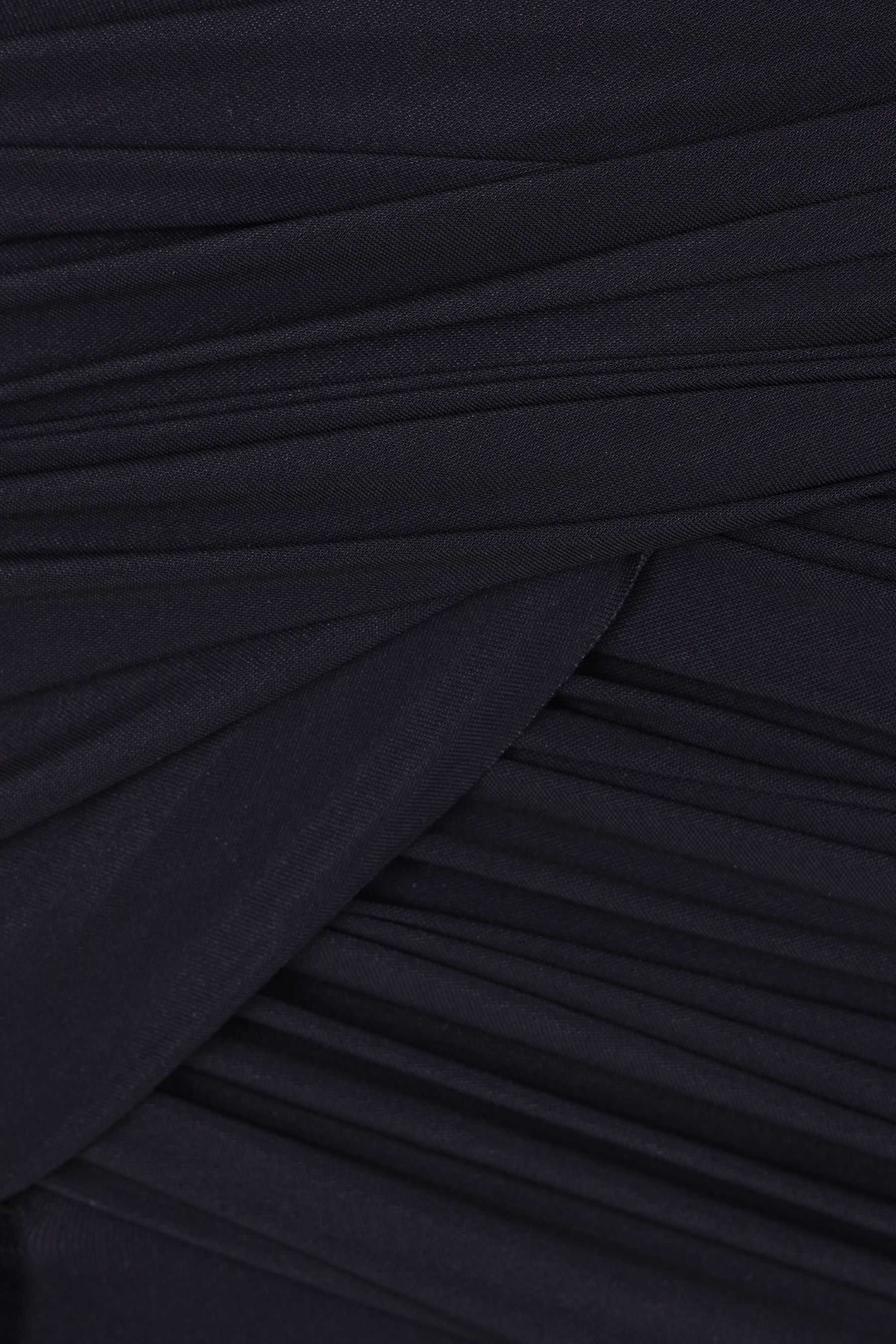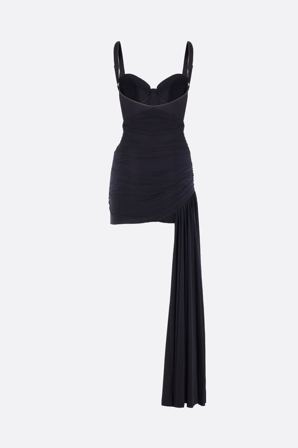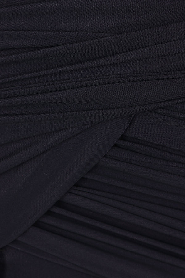 Balenciaga long draped dress crafted from black stretch jersey. Featuring sweetheart neckline, adjustable straps, padded cups, waist drape with covered buckle, and asymmetrical hem. Unlined interior.