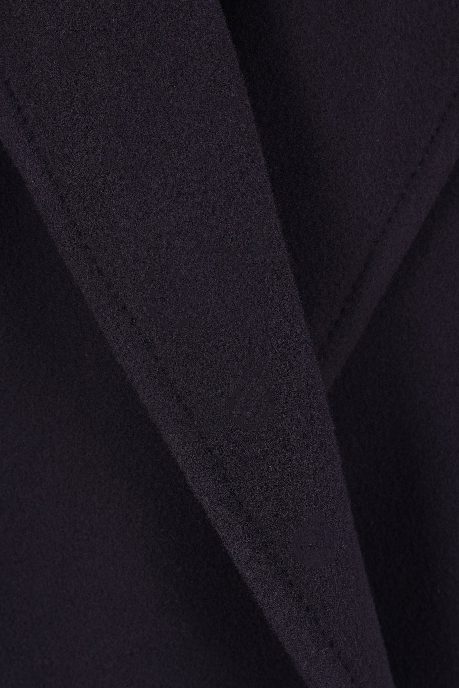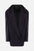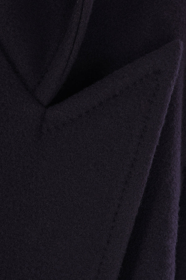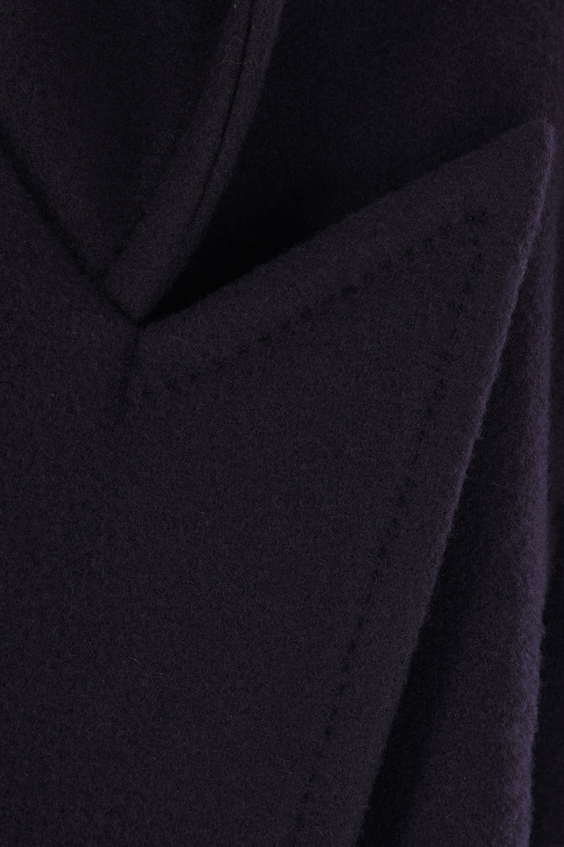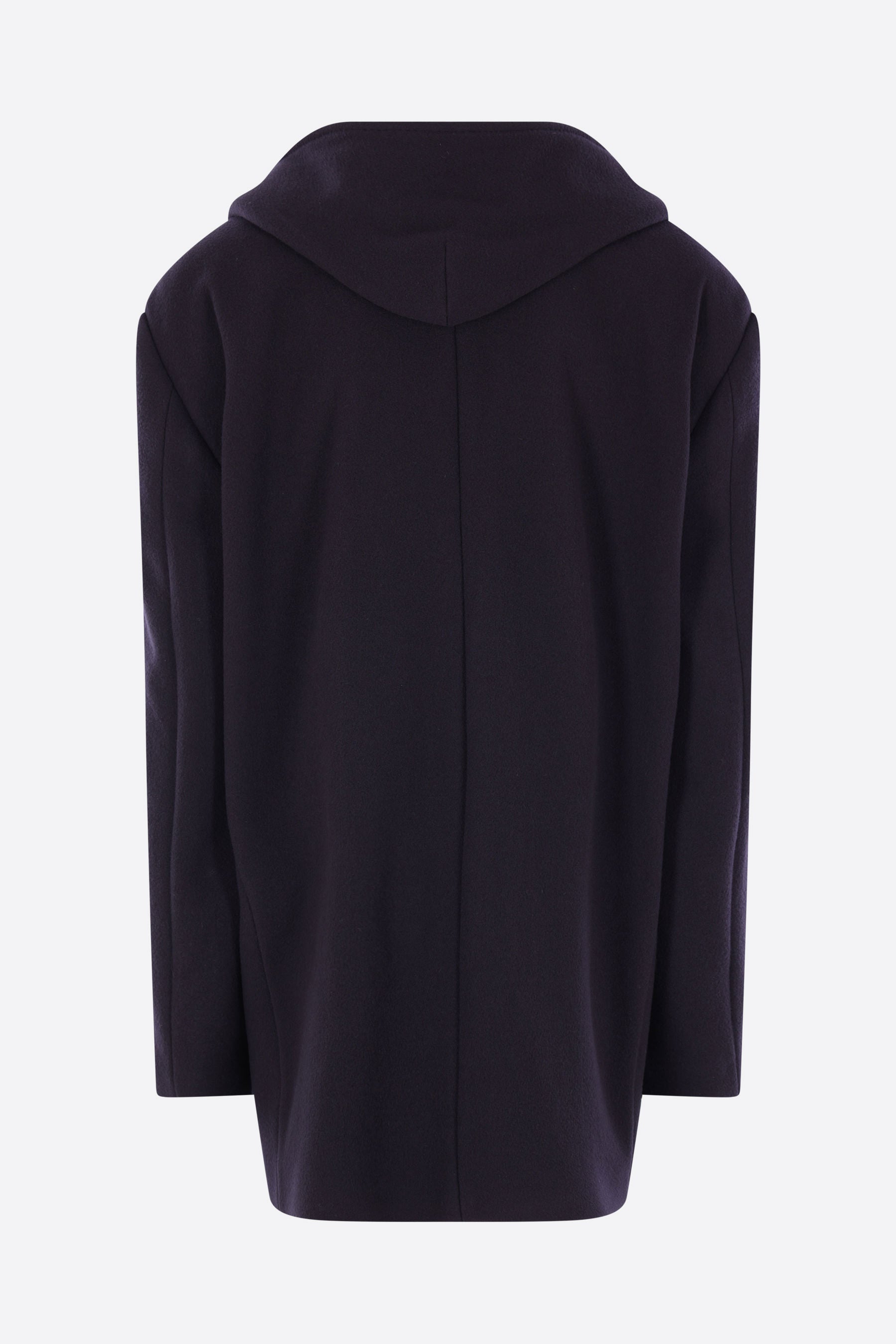 Balenciaga oversized hooded coat crafted from dark blue brushed wool. Featuring peaked lapels, padded shoulders, multiple pockets, long sleeves, straight hem, and lined interior.