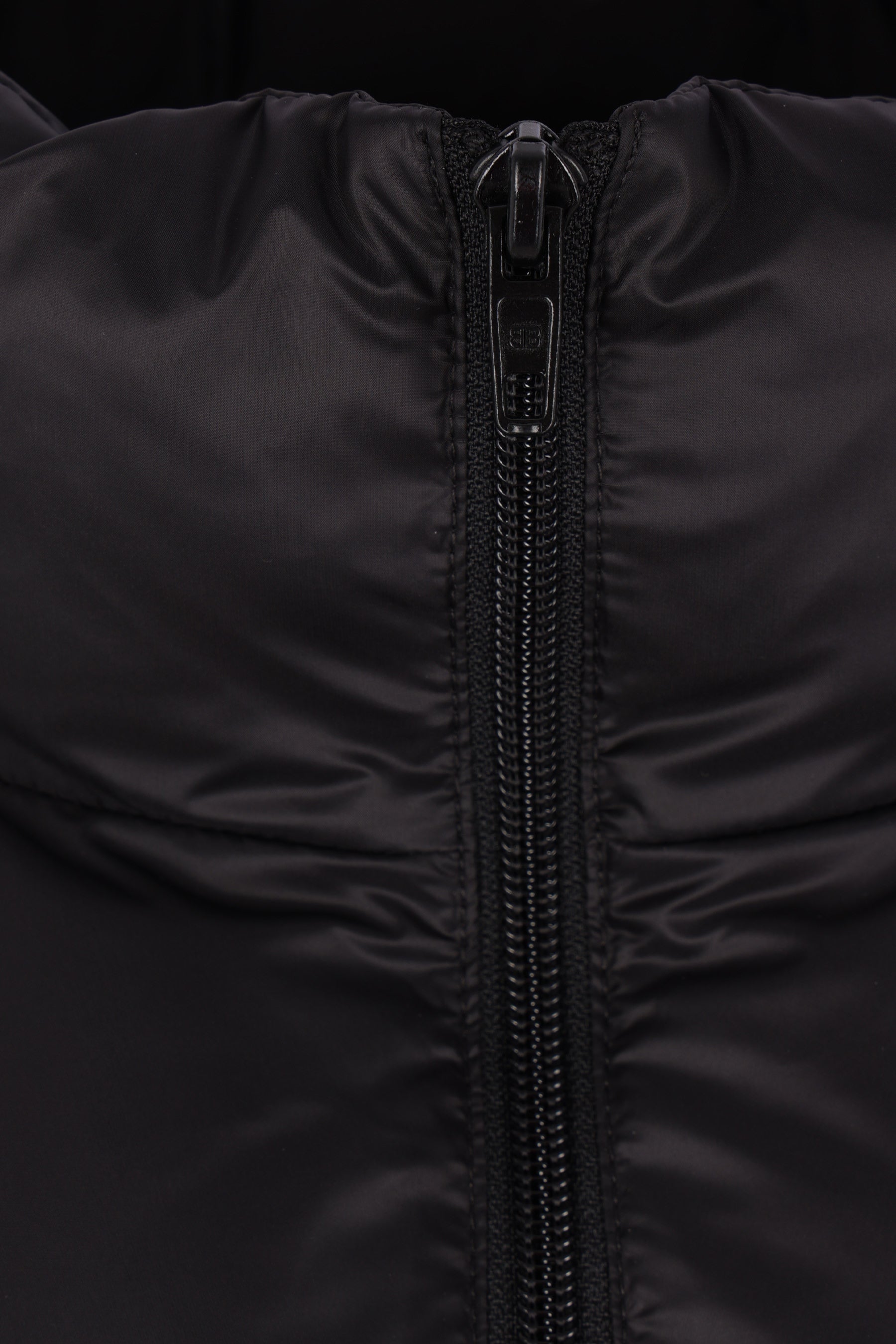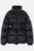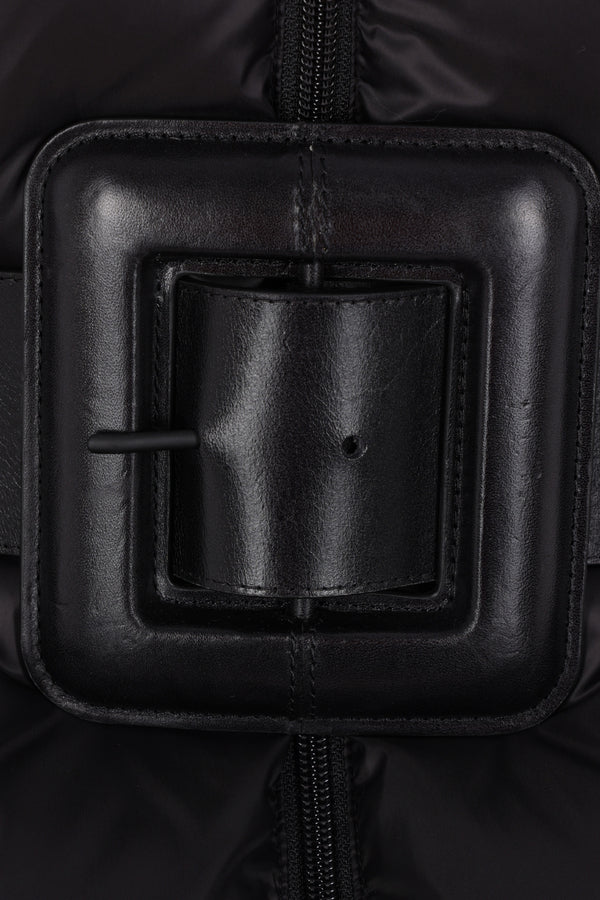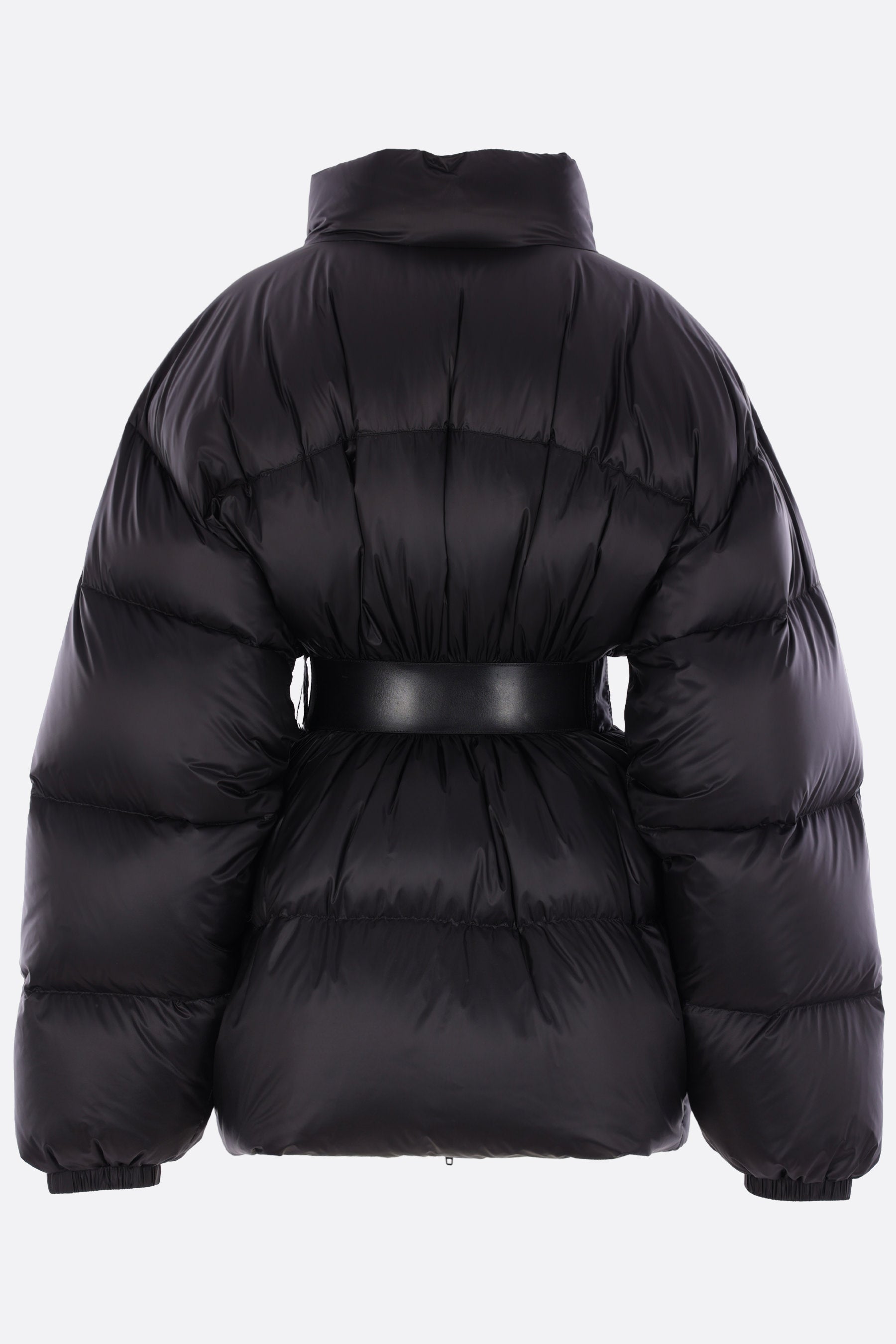 Balenciaga oversized down jacket crafted from black nylon with an integrated smooth leather belt. Features a high collar, front two-way zip closure, welt pockets, long sleeves with elastic cuffs, and a straight hem.