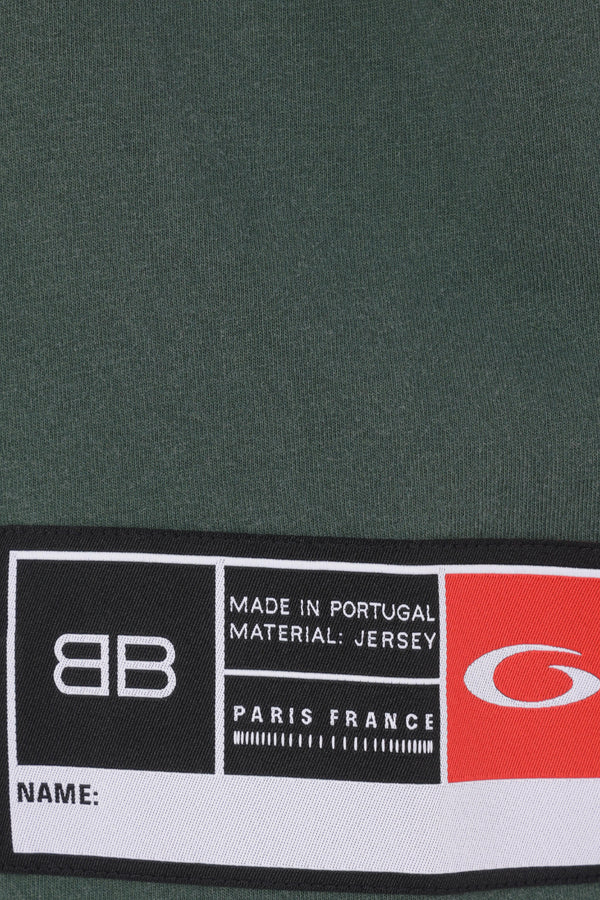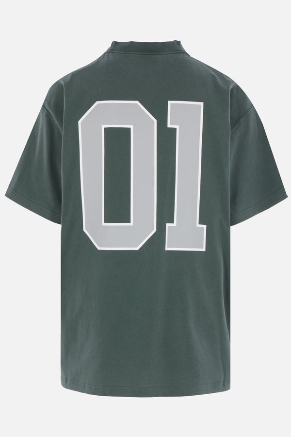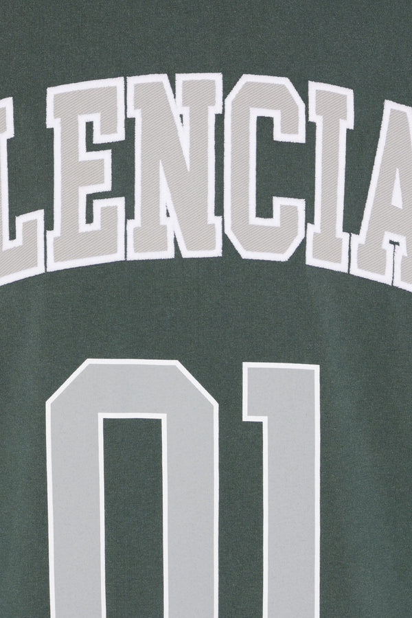 Balenciaga oversized t-shirt crafted from dark green cotton jersey, featuring embroidered basketball motif on the front and back. Designed with a crew neckline, short sleeves, and straight hem.