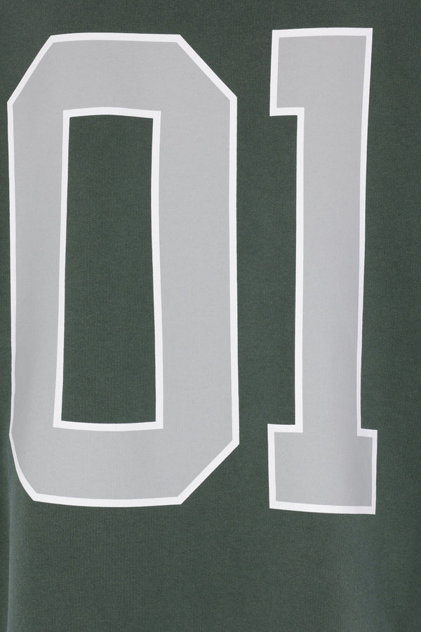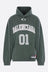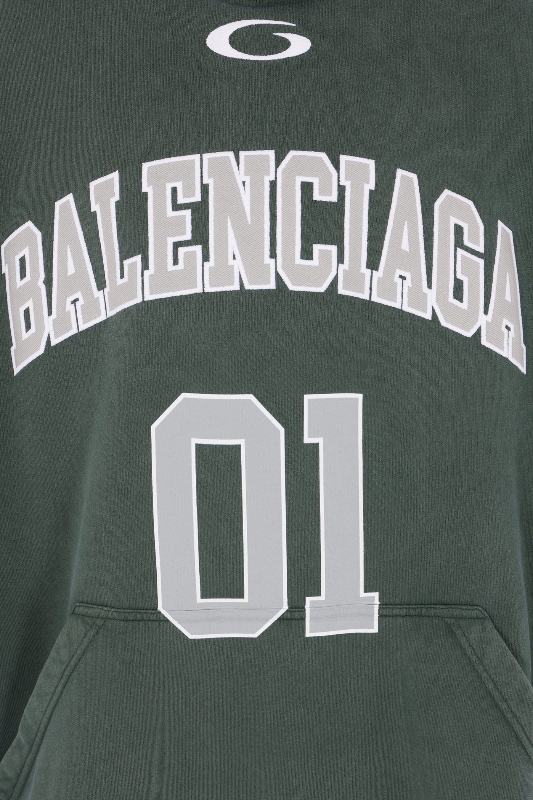 Balenciaga oversized hoodie crafted from dark green cotton jersey, featuring embroidered basketball motif on the front and back. Designed with a kangaroo pocket, long sleeves, and ribbed trims.