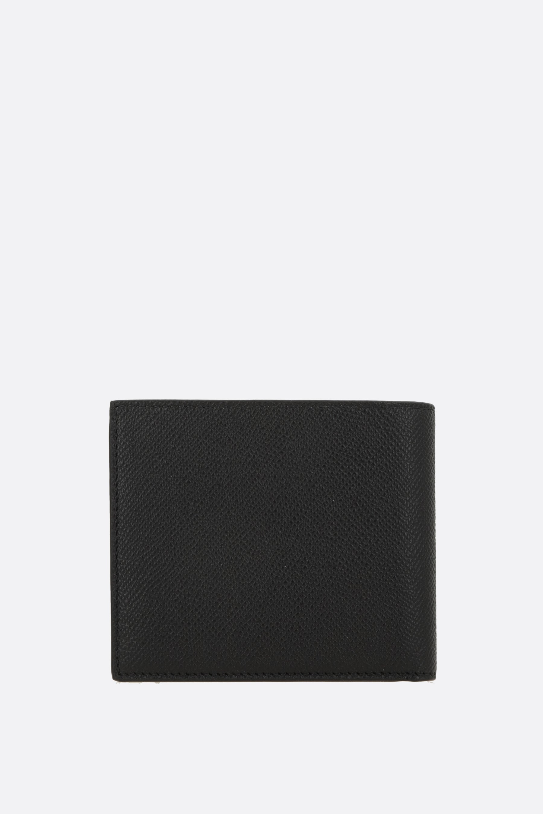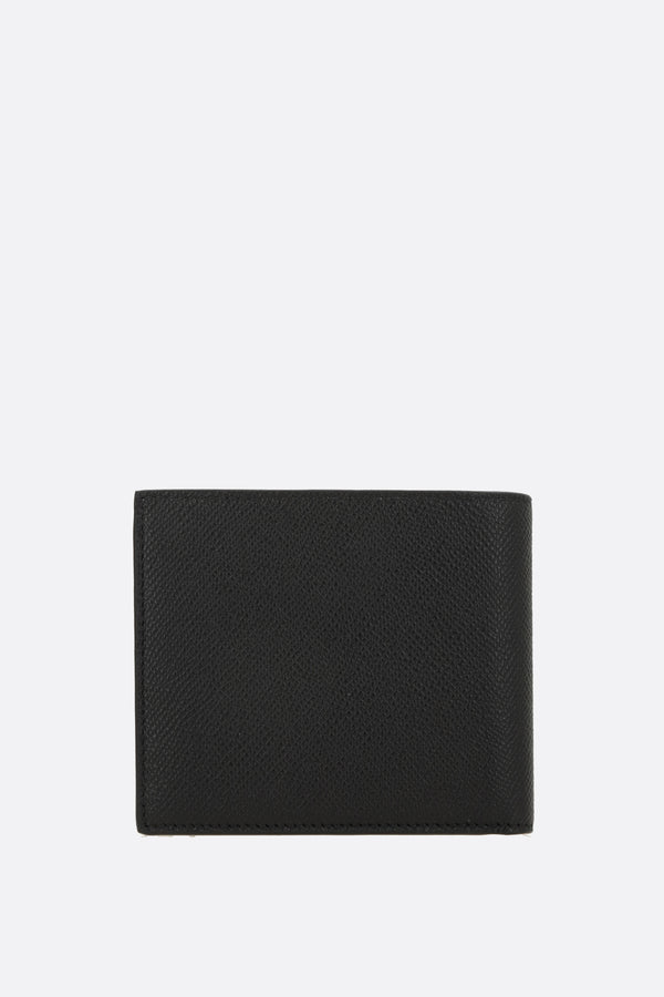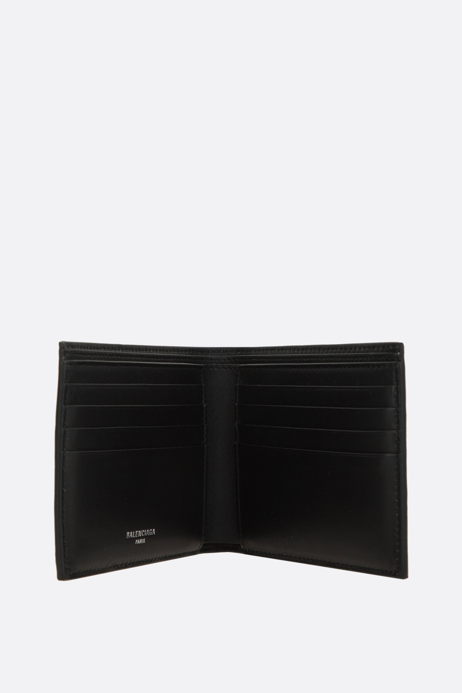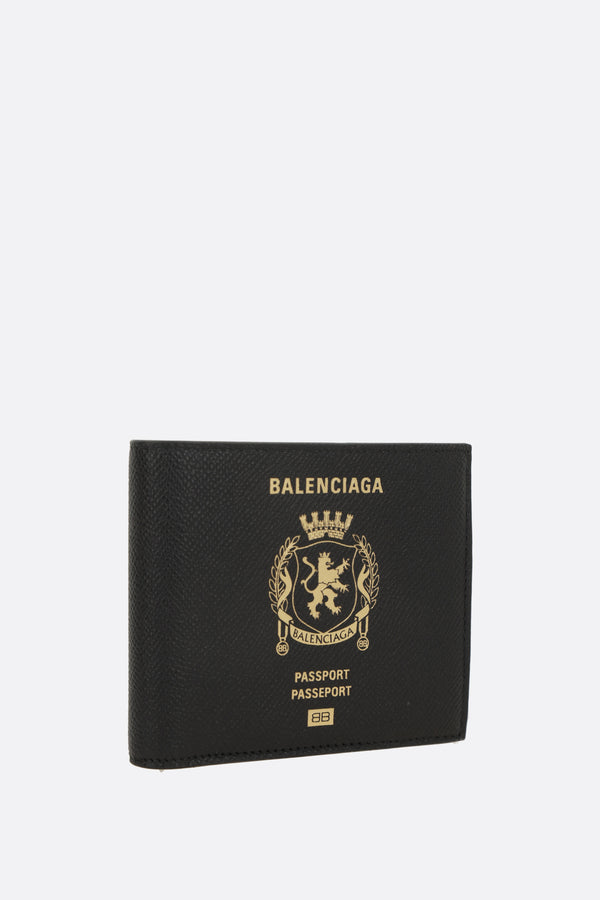 Balenciaga billfold wallet crafted from black textured leather with an embossed Passport logo on the front. Featuring two bill compartments, two flat pockets, and eight card slots. Interior lined in leather and fabric.