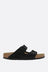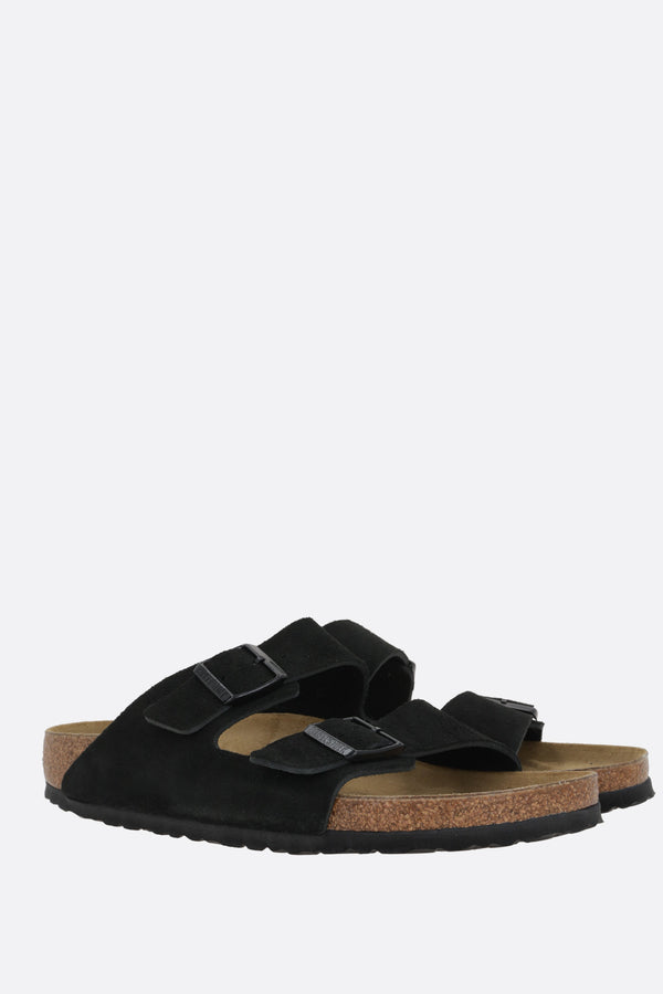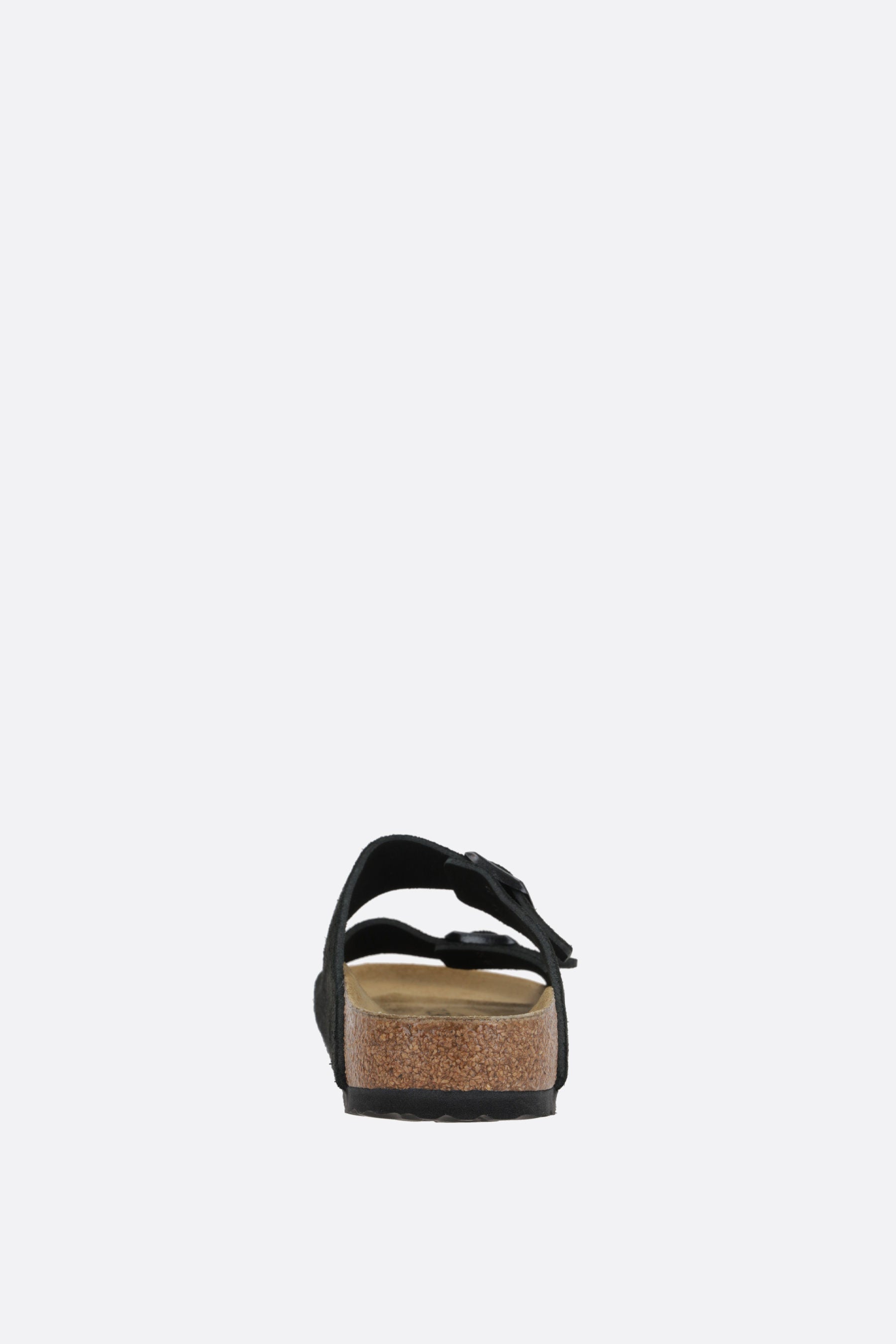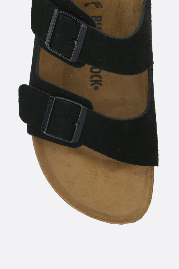 Birkenstock flat sandals crafted in black suede. Featuring a round-toe silhouette, adjustable buckled straps, leather lining and lightweight Eva rubber sole. The design is completed by the iconic lettering logo embossed on side.